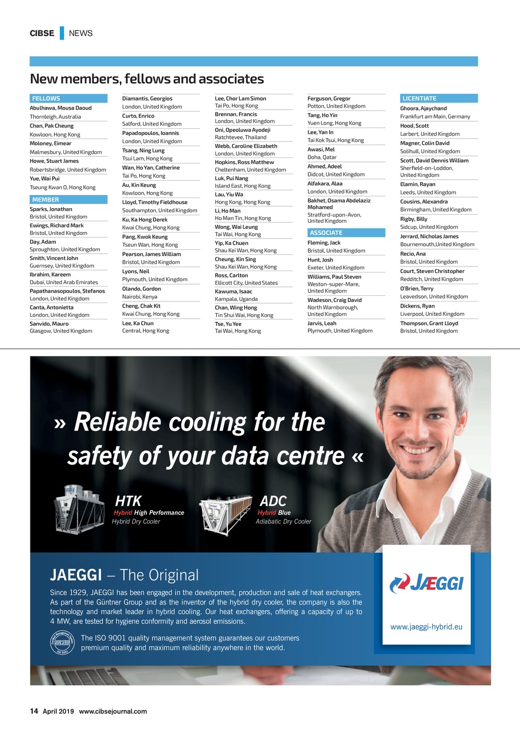 CIBSE | NEWS New members, fellows and associates FELLOWS Abulhawa, Mousa Daoud Thornleigh, Australia Chan, Pak Cheung Diamantis, Georgios London, United Kingdom Lee, Chor Lam Simon Tai Po, Hong Kong Ferguson, Gregor Potton, United Kingdom Curto, Enrico Salford, United Kingdom Brennan, Francis London, United Kingdom Tang, Ho Yin Yuen Long, Hong Kong Papadopoulos, Ioannis London, United Kingdom Kowloon, Hong Kong Moloney, Eimear Tsang, Ning Lung Tsui Lam, Hong Kong Malmesbury, United Kingdom Howe, Stuart James Wan, Ho Yan, Catherine Tai Po, Hong Kong Robertsbridge, United Kingdom Yue, Wai Pui Au, Kin Keung Kowloon, Hong Kong Tseung Kwan O, Hong Kong MEMBER Lloyd, Timothy Fieldhouse Southampton, United Kingdom Sparks, Jonathan Bristol, United Kingdom Ku, Ka Hong Derek Kwai Chung, Hong Kong Ewings, Richard Mark Bristol, United Kingdom Pang, Kwok Keung Tseun Wan, Hong Kong Day, Adam Sproughton, United Kingdom Pearson, James William Bristol, United Kingdom Smith, Vincent John Guernsey, United Kingdom Lyons, Neil Plymouth, United Kingdom Ibrahim, Kareem Dubai, United Arab Emirates Oni, Opeoluwa Ayodeji Ratchtevee, Thailand Webb, Caroline Elizabeth London, United Kingdom Hopkins, Ross Matthew Cheltenham, United Kingdom Luk, Pui Nang Island East, Hong Kong Lau, Yiu Wa Hong Kong, Hong Kong Li, Ho Man Ho Man Tin, Hong Kong Wong, Wai Leung Tai Wai, Hong Kong Lee, Yan In Tai Kok Tsui, Hong Kong Awasi, Mel Doha, Qatar Hood, Scott Larbert, United Kingdom Magner, Colin David Solihull, United Kingdom Ahmed, Adeel Didcot, United Kingdom Scott, David Dennis William Sherfield-on-Loddon, UnitedKingdom Alfakara, Alaa London, United Kingdom Elamin, Rayan Leeds, United Kingdom Bakhet, Osama Abdelaziz Mohamed Stratford-upon-Avon, United Kingdom Cousins, Alexandra Birmingham, United Kingdom ASSOCIATE Yip, Ka Chuen Shau Kei Wan, Hong Kong Fleming, Jack Bristol, United Kingdom Cheung, Kin Sing Shau Kei Wan, Hong Kong Hunt, Josh Exeter, United Kingdom Ross, Carlton Ellicott City, United States Williams, Paul Steven Weston-super-Mare, UnitedKingdom Papathanasopoulos, Stefanos London, United Kingdom Olando, Gordon Nairobi, Kenya Canta, Antonietta London, United Kingdom Cheng, Chak Kit Kwai Chung, Hong Kong Chan, Wing Hong Tin Shui Wai, Hong Kong Wadeson, Craig David North Warnborough, UnitedKingdom Sanvido, Mauro Glasgow, United Kingdom Lee, Ka Chun Central, Hong Kong Tse, Yu Yee Tai Wai, Hong Kong Jarvis, Leah Plymouth, United Kingdom Kawuma, Isaac Kampala, Uganda LICENTIATE Ghoora, Ajaychand Frankfurt am Main, Germany Rigby, Billy Sidcup, United Kingdom Jerrard, Nicholas James Bournemouth,United Kingdom Recio, Ana Bristol, United Kingdom Court, Steven Christopher Redditch, United Kingdom OBrien, Terry Leavedson, United Kingdom Dickens, Ryan Liverpool, United Kingdom Thompson, Grant Lloyd Bristol, United Kingdom Reliable cooling for the safety of your data centre HTK Hybrid High Performance Hybrid Dry Cooler ADC Hybrid Blue Adiabatic Dry Cooler JAEGGI The Original Since 1929, JAEGGI has been engaged in the development, production and sale of heat exchangers. As part of the Gntner Group and as the inventor of the hybrid dry cooler, the company is also the technology and market leader in hybrid cooling. Our heat exchangers, offering a capacity of up to 4 MW, are tested for hygiene conformity and aerosol emissions. www.jaeggi-hybrid.eu The ISO 9001 quality management system guarantees our customers premium quality and maximum reliability anywhere in the world. 14 April 2019 www.cibsejournal.com CIBSE Apr19 pp12-14 CIBSE News.indd 14 22/03/2019 16:46