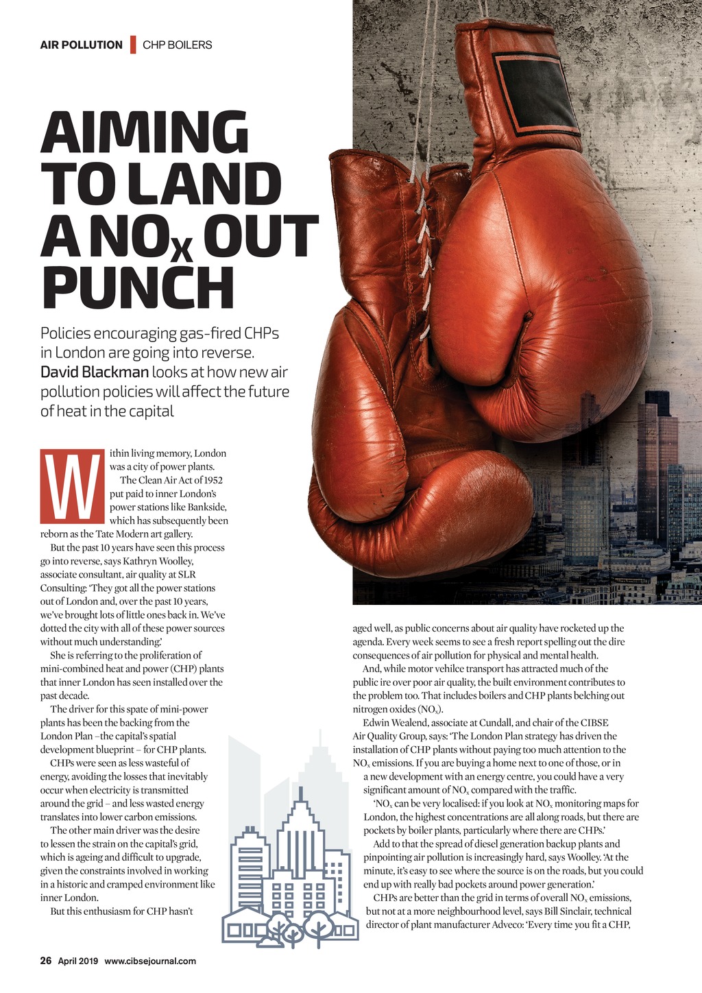 AIR POLLUTION | CHP BOILERS AIMING TO LAND A NOX OUT PUNCH Policies encouraging gas-fired CHPs in London are going into reverse. David Blackman looks at how new air pollution policies will affect the future of heat in the capital W ithin living memory, London was a city of power plants. The Clean Air Act of 1952 put paid to inner Londons power stations like Bankside, which has subsequently been reborn as the Tate Modern art gallery. But the past 10 years have seen this process go into reverse, says Kathryn Woolley, associate consultant, air quality at SLR Consulting: They got all the power stations out of London and, over the past 10 years, weve brought lots of little ones back in. Weve dotted the city with all of these power sources without much understanding. She is referring to the proliferation of mini-combined heat and power (CHP) plants that inner London has seen installed over the past decade. The driver for this spate of mini-power plants has been the backing from the London Plan the capitals spatial development blueprint for CHP plants. CHPs were seen as less wasteful of energy, avoiding the losses that inevitably occur when electricity is transmitted around the grid and less wasted energy translates into lower carbon emissions. The other main driver was the desire to lessen the strain on the capitals grid, which is ageing and difficult to upgrade, given the constraints involved in working in a historic and cramped environment like inner London. But this enthusiasm for CHP hasnt aged well, as public concerns about air quality have rocketed up the agenda. Every week seems to see a fresh report spelling out the dire consequences of air pollution for physical and mental health. And, while motor vehilce transport has attracted much of the public ire over poor air quality, the built environment contributes to the problem too. That includes boilers and CHP plants belching out nitrogen oxides (NOx). Edwin Wealend, associate at Cundall, and chair of the CIBSE Air Quality Group, says: The London Plan strategy has driven the installation of CHP plants without paying too much attention to the NOx emissions. If you are buying a home next to one of those, or in a new development with an energy centre, you could have a very significant amount of NOx compared with the traffic. NOx can be very localised: if you look at NOx monitoring maps for London, the highest concentrations are all along roads, but there are pockets by boiler plants, particularly where there are CHPs. Add to that the spread of diesel generation backup plants and pinpointing air pollution is increasingly hard, says Woolley. At the minute, its easy to see where the source is on the roads, but you could end up with really bad pockets around power generation. CHPs are better than the grid in terms of overall NOx emissions, but not at a more neighbourhood level, says Bill Sinclair, technical director of plant manufacturer Adveco: Every time you fit a CHP, 26 April 2019 www.cibsejournal.com CIBSE Apr19 pp26-28 Air Quality.indd 26 22/03/2019 16:53