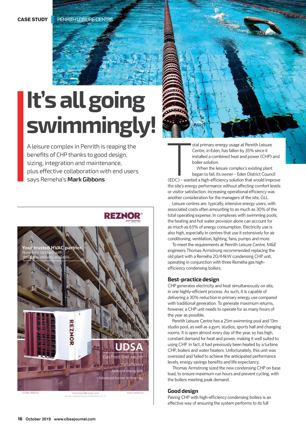 CASE STUDY | PENRITH LEISURE CENTRE Its all going swimmingly! A leisure complex in Penrith is reaping the benefits of CHP thanks to good design, sizing, integration and maintenance, plus effective collaboration with end users says Remehas Mark Gibbons Your trusted HVAC partner. Now fully stocked with three day delivery available. T otal primary energy usage at Penrith Leisure Centre, in Eden, has fallen by 35% since it installed a combined heat and power (CHP) and boiler solution. When the leisure complexs existing plant began to fail, its owner Eden District Council (EDC) wanted a high-efciency solution that would improve the sites energy performance without affecting comfort levels or visitor satisfaction. Increasing operational efciency was another consideration for the managers of the site, GLL. Leisure centres are, typically, intensive energy users, with associated costs often amounting to as much as 30% of the total operating expense. In complexes with swimming pools, the heating and hot water provision alone can account for as much as 65% of energy consumption. Electricity use is also high, especially in centres that use it extensively for air conditioning, ventilation, lighting, fans, pumps and more. To meet the requirements at Penrith Leisure Centre, M&E engineers Thomas Armstrong recommended replacing the old plant with a Remeha 20/44kW condensing CHP unit, operating in conjunction with three Remeha gas highefciency condensing boilers. Best-practice design UDSA Gas Fired Unit Heater - High efficiency - Reduced energy bills - Advanced burner technology 01384 489250 reznorsales@nortek.com Reznor is a registered trademark of Nortek Global HVAC, LLC www.reznor.eu CHP generates electricity and heat simultaneously on site, in one highly-efcient process. As such, it is capable of delivering a 30 reduction in primary energy use compared with traditional generation. To generate maximum returns, however, a CHP unit needs to operate for as many hours of the year as possible. Penrith Leisure Centre has a 25m swimming pool and 13m studio pool, as well as a gym, studios, sports hall and changing rooms. It is open almost every day of the year, so has high, constant demand for heat and power, making it well suited to using CHP. In fact, it had previously been heated by a turbine CHP, boilers and water heaters. Unfortunately, this unit was oversized and failed to achieve the anticipated performance levels, energy savings benets and life expectancy. Thomas Armstrong sized the new condensing CHP on base load, to ensure maximum run hours and prevent cycling, with the boilers meeting peak demand. Good design Pairing CHP with high-efciency condensing boilers is an effective way of ensuring the system performs to its full 16 October 2019 www.cibsejournal.com CIBSE Oct19 pp16-17 Remeha Supp.indd 16 20/09/2019 13:49