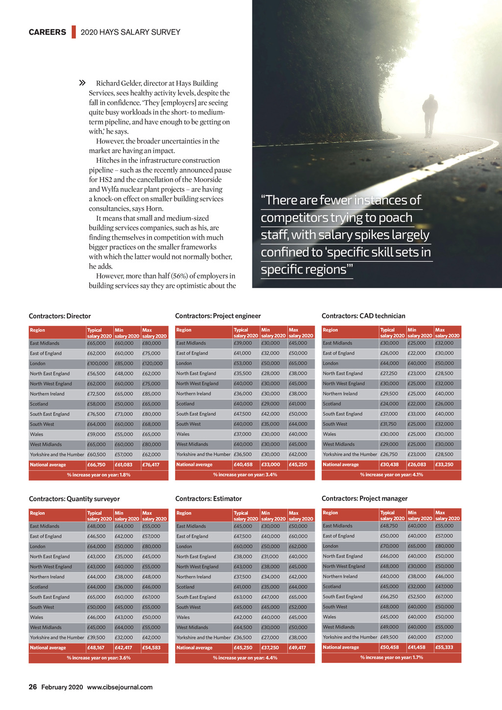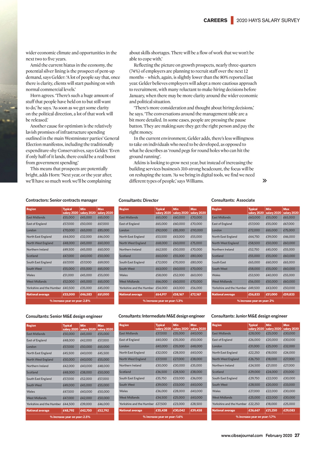 | 2020 HAYS SALARY SURVEY CAREERS Richard Gelder, director at Hays Building Services, sees healthy activity levels, despite the fall in confidence. They [employers] are seeing quite busy workloads in the short- to mediumterm pipeline, and have enough to be getting on with, he says. However, the broader uncertainties in the market are having an impact. Hitches in the infrastructure construction pipeline such as the recently announced pause for HS2 and the cancellation of the Moorside and Wylfa nuclear plant projects are having a knock-on effect on smaller building services consultancies, says Horn. It means that small and medium-sized building services companies, such as his, are finding themselves in competition with much bigger practices on the smaller frameworks with which the latter would not normally bother, he adds. However, more than half (56%) of employers in building services say they are optimistic about the There are fewer instances of competitors trying to poach staff, with salary spikes largely confined to specific skill sets in specific regions Contractors: Director Contractors: Project engineer Contractors: CAD technician Region Region East Midlands Typical Min Max salary 2020 salary 2020 salary 2020 39,000 30,000 45,000 Region East Midlands Typical Min Max salary 2020 salary 2020 salary 2020 65,000 60,000 80,000 East Midlands Typical Min Max salary 2020 salary 2020 salary 2020 30,000 25,000 32,000 East of England 62,000 60,000 75,000 East of England 41,000 32,000 50,000 East of England 26,000 22,000 30,000 London 100,000 85,000 120,000 London 53,000 50,000 65,000 London 44,000 40,000 50,000 North East England 56,500 48,000 62,000 North East England 35,500 28,000 38,000 North East England 27,250 23,000 28,500 North West England 62,000 60,000 75,000 North West England 40,000 30,000 45,000 North West England 30,000 25,000 32,000 Northern Ireland 72,500 65,000 85,000 Northern Ireland 36,000 30,000 38,000 Northern Ireland 29,500 25,000 40,000 Scotland 58,000 50,000 65,000 Scotland 40,000 29,000 41,000 Scotland 24,000 22,000 26,000 South East England 76,500 73,000 80,000 South East England 47,500 42,000 50,000 South East England 37,000 33,000 40,000 South West 64,000 60,000 68,000 South West 40,000 35,000 44,000 South West 31,750 25,000 32,000 Wales 59,000 55,000 65,000 Wales 37,000 30,000 40,000 Wales 30,000 25,000 30,000 West Midlands 65,000 60,000 80,000 West Midlands 40,000 30,000 45,000 West Midlands 29,000 25,000 30,000 Yorkshire and the Humber 60,500 57,000 62,000 Yorkshire and the Humber 36,500 30,000 42,000 Yorkshire and the Humber 26,750 23,000 28,500 National average 61,083 76,417 National average 33,000 45,250 National average 26,083 33,250 66,750 40,458 % increase year on year: 3.4% % increase year on year: 1.8% 30,438 % increase year on year: 4.1% Contractors: Quantity surveyor Contractors: Estimator Contractors: Project manager Region Region East Midlands Typical Min Max salary 2020 salary 2020 salary 2020 45,000 30,000 50,000 Region East Midlands Typical Min Max salary 2020 salary 2020 salary 2020 48,000 44,000 55,000 East Midlands Typical Min Max salary 2020 salary 2020 salary 2020 48,750 40,000 55,000 East of England 46,500 42,000 57,000 East of England 47,500 40,000 60,000 East of England 50,000 40,000 57,000 London 64,000 50,000 80,000 London 60,000 50,000 62,000 London 70,000 65,000 80,000 North East England 43,000 35,000 45,000 North East England 38,000 31,000 40,000 North East England 46,000 40,000 50,000 North West England 43,000 40,000 55,000 North West England 43,000 38,000 45,000 North West England 48,000 30,000 50,000 Northern Ireland 44,000 38,000 48,000 Northern Ireland 37,500 34,000 42,000 Northern Ireland 40,000 38,000 46,000 Scotland 44,000 36,000 46,000 Scotland 41,000 35,000 44,000 Scotland 45,000 32,000 47,000 South East England 65,000 60,000 67,000 South East England 63,000 47,000 65,000 South East England 66,250 52,500 67,000 South West 50,000 45,000 55,000 South West 45,000 45,000 52,000 South West 48,000 40,000 50,000 Wales 46,000 43,000 50,000 Wales 42,000 40,000 45,000 Wales 45,000 40,000 50,000 West Midlands 45,000 44,000 55,000 West Midlands 44,500 30,000 50,000 West Midlands 49,000 40,000 55,000 Yorkshire and the Humber 39,500 32,000 42,000 Yorkshire and the Humber 36,500 27,000 38,000 Yorkshire and the Humber 49,500 40,000 57,000 National average 42,417 54,583 National average 37,250 49,417 National average 41,458 55,333 48,167 % increase year on year: 3.6% 45,250 % increase year on year: 4.4% 50,458 % increase year on year: 1.7% 26 February 2020 www.cibsejournal.com CIBSE Feb20 pp25-28 2020 Salary survey.indd 26 24/01/2020 14:54