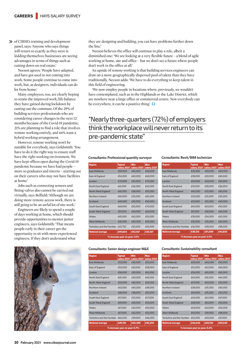 CAREERS | HAYS SALARY SURVEY of CIBSEs training and development panel, says: Anyone who says things will return to exactly as they were is kidding themselves: businesses are seeing advantages in terms of things such as cutting down on real estate. Neeson agrees: People have adapted, and have got used to not coming into work. Some people continue to come into work, but, as designers, individuals can do lot from home. Many employees, too, are clearly hoping to retain the improved work/life balance they have gained during lockdown by cutting out the commute. Of the 29% of building services professionals who are considering career changes in the next 12 months because of the Covid-19 pandemic, 21% are planning to find a role that involves remote working entirely, and 44% want a hybrid working arrangement. However, remote working wont be suitable for everybody, says Goldsmith: You have to do it the right way to ensure staff have the right working environment. We have kept offices open during the Covid-19 pandemic because we have had people more so graduates and interns starting out on their careers who may not have facilities at home. Jobs such as connecting sensors and fitting valves also cannot be carried out virtually, says Belfield: Although we are doing more remote-access work, there is still going to be an awful lot of site work. Engineers are likely to spend a couple of days working at home, which should provide opportunities to mentor junior engineers, says Goldsmith: That means people early in their career get the opportunity to sit with more experienced engineers. If they dont understand what they are designing and building, you can have problems further down the line. Neeson believes the office will continue to play a role, albeit a diminished one: We are looking at a very flexible future a blend of agile working at home, site and office but we dont see a future where people dont work in the office at all. An upside of remote working is that building services engineers can draw on a more geographically dispersed pool of talent than they have traditionally, Neeson adds: We have to do everything to keep talent in this field of engineering. We now employ people in locations where, previously, we wouldnt have contemplated, such as in the Highlands or the Lake District, which are nowhere near a large office or commercial centre. Now everybody can be everywhere, it can be a positive thing. CJ Nearly three-quarters (72%) of employers think the workplace will never return to its pre-pandemic state Consultants: Professional quantity surveyor Consultants: Revit/BIM technician Region Region East Midlands Typical Min Max salary 2021 salary 2021 salary 2021 50,000 45,000 60,000 East Midlands Typical Min Max salary 2021 salary 2021 salary 2021 35,000 30,000 40,000 East of England 54,000 40,000 60,000 East of England 38,000 30,000 45,000 London 70,000 55,000 75,000 London 50,000 40,000 65,000 North East England 41,000 36,000 42,000 North East England 35,500 28,000 36,000 North West England 45,000 38,000 50,000 North West England 40,000 32,000 45,000 Northern Ireland 40,000 35,000 45,000 Northern Ireland 30,000 25,000 35,000 Scotland 40,000 35,000 50,000 Scotland 32,000 25,000 40,000 South East England 68,000 55,000 70,000 South East England 45,000 43,000 55,000 South West England 53,500 50,000 60,000 South West England 41,500 38,000 45,000 Wales 45,000 42,000 55,000 Wales 39,000 34,000 42,000 West Midlands 45,000 40,000 50,000 West Midlands 35,000 25,000 40,000 Yorkshire and the Humber 43,750 35,000 45,000 Yorkshire and the Humber 36,500 28,000 38,000 National average 42,167 55,167 National average 31,500 43,833 49,604 38,125 % increase year on year: 2.1% % increase year on year: 1.5% Consultants: Senior design engineer M&E Consultants: Sustainability consultant Region Region East Midlands Typical Min Max salary 2021 salary 2021 salary 2021 50,000 45,000 55,000 East Midlands Typical Min Max salary 2021 salary 2021 salary 2021 45,000 40,000 50,000 East of England 50,000 43,500 58,000 East of England 52,000 42,000 60,000 London 58,000 50,000 65,000 London 56,000 45,000 65,000 North East England 45,500 40,000 45,500 North East England 42,500 36,500 44,000 North West England 50,000 45,000 55,000 North West England 47,000 40,000 50,000 Northern Ireland 43,000 40,000 48,000 Northern Ireland 38,000 35,000 45,000 Scotland 48,000 38,000 50,000 Scotland 45,000 35,000 50,000 South East England 57,000 52,000 57,000 South East England 45,000 42,000 47,000 South West England 49,000 45,000 55,000 South West England 48,000 45,000 50,000 Wales 47,500 42,000 50,000 Wales 44,000 42,000 50,000 West Midlands 47,000 42,000 55,000 West Midlands 45,000 39,000 48,000 Yorkshire and the Humber 44,500 39,000 46,000 Yorkshire and the Humber 45,000 40,000 47,500 National average 43,458 53,292 National average 40,125 50,542 49,125 % increase year on year: 0.7% 46,042 % increase year on year: 0.4% 30 February 2021 www.cibsejournal.com CIBSE Feb21 pp26-28, 30 2021 Salary survey.indd 30 22/01/2021 15:41