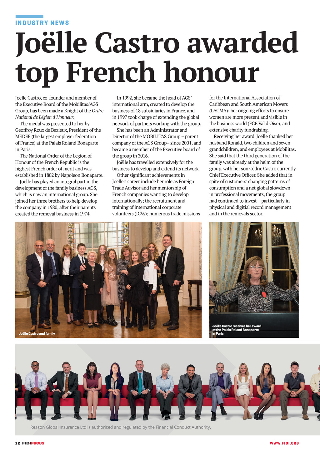IN D U ST RY N EW S Jolle Castro awarded top French honour Jolle Castro, co-founder and member of the Executive Board of the Mobilitas/AGS Group, has been made a Knight of the Ordre National de Lgion dHonneur. The medal was presented to her by Geoffroy Roux de Bezieux, President of the MEDEF (the largest employer federation of France) at the Palais Roland Bonaparte in Paris. The National Order of the Legion of Honour of the French Republic is the highest French order of merit and was established in 1802 by Napoleon Bonaparte. Jolle has played an integral part in the development of the family business AGS, which is now an international group. She joined her three brothers to help develop the company in 1980, after their parents created the removal business in 1974. In 1992, she became the head of AGS international arm, created to develop the business of 18 subsidiaries in France, and in 1997 took charge of extending the global network of partners working with the group. She has been an Administrator and Director of the MOBILITAS Group parent company of the AGS Group since 2001, and became a member of the Executive board of the group in 2016. Jolle has travelled extensively for the business to develop and extend its network. Other signicant achievements in Jolles career include her role as Foreign Trade Advisor and her mentorship of French companies wanting to develop internationally; the recruitment and training of international corporate volunteers (ICVs); numerous trade missions for the International Association of Caribbean and South American Movers (LACMA); her ongoing efforts to ensure women are more present and visible in the business world (FCE Val dOise); and extensive charity fundraising. Receiving her award, Jolle thanked her husband Ronald, two children and seven grandchildren, and employees at Mobilitas. She said that the third generation of the family was already at the helm of the group, with her son Cdric Castro currently Chief Executive Ofcer. She added that in spite of customers changing patterns of consumption and a net global slowdown in professional movements, the group had continued to invest particularly in physical and digitial record management and in the removals sector. Jolle Castro and family Jolle Castro receives her award at the Palais Roland Bonaparte in Paris Reason Global Insurance Ltd is authorised and regulated by the Financial Conduct Authority. 12 FF294 DecJan20 pp08-13 Industry News.indd 12 WWW. F I D I . OR G 20/11/2019 12:44