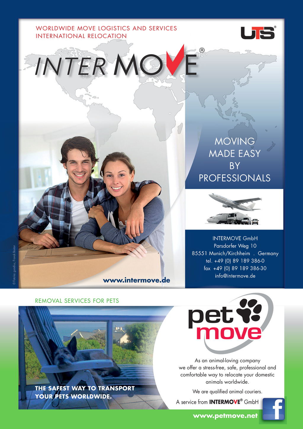 WORLDWIDE MOVE LOGISTICS AND SERVICES INTERNATIONAL RELOCATION C M Y CM MY CY CMY K Fotolia: goodluz, Franck Boston MOVING MADE EASY BY PROFESSIONALS www.intermove.de REMOVAL SERVICES FOR PETS INTERMOVE GmbH Parsdorfer Weg 10 85551 Munich/Kirchheim . Germany tel. +49 (0) 89 189 386-0 fax +49 (0) 89 189 386-30 info@intermove.de pet move THE SAFEST WAY TO TRANSPORT YOUR PETS WORLDWIDE. As an animal-loving company we offer a stress-free, safe, professional and comfortable way to relocate your domestic animals worldwide. We are qualified animal couriers. A service from INTERMOVE GmbH www.petmove.net FF294 DecJan20 pp30-31 FIDI 39 Club.indd 30 20/11/2019 13:07