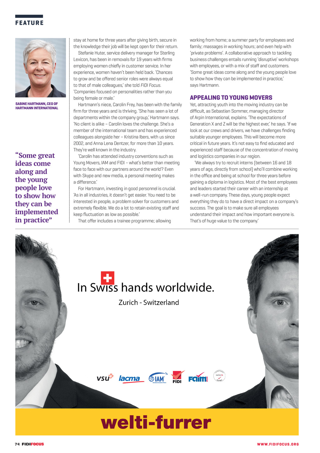 F E AT U RE SABINE HARTMANN, CEO OF HARTMANN INTERNATIONAL Some great ideas come along and the young people love to show how they can be implemented in practice stay at home for three years after giving birth, secure in the knowledge their job will be kept open for their return. Stefanie Huter, service delivery manager for Sterling Lexicon, has been in removals for 19 years with firms employing women chiefly in customer service. In her experience, women havent been held back. Chances to grow and be offered senior roles were always equal to that of male colleagues, she told FIDI Focus. Companies focused on personalities rather than you being female or male. Hartmanns niece, Carolin Frey, has been with the family firm for three years and is thriving. She has seen a lot of departments within the company group, Hartmann says. No client is alike Carolin loves the challenge. Shes a member of the international team and has experienced colleagues alongside her Kristina Ibers, with us since 2002, and Anna Lena Dentzer, for more than 10 years. Theyre well known in the industry. Carolin has attended industry conventions such as Young Movers, IAM and FIDI whats better than meeting face to face with our partners around the world? Even with Skype and new media, a personal meeting makes a difference. For Hartmann, investing in good personnel is crucial. As in all industries, it doesnt get easier. You need to be interested in people, a problem solver for customers and extremely flexible. We do a lot to retain existing staff and keep fluctuation as low as possible. That offer includes a trainee programme; allowing 74 FF295 FebMar20 pp72-79 Regional Focus.indd 74 working from home; a summer party for employees and family; massages in working hours; and even help with private problems. A collaborative approach to tackling business challenges entails running disruptive workshops with employees, or with a mix of staff and customers. Some great ideas come along and the young people love to show how they can be implemented in practice, says Hartmann. APPEALING TO YOUNG MOVERS Yet, attracting youth into the moving industry can be difficult, as Sebastian Sommer, managing director of Arpin International, explains. The expectations of Generation X and Z will be the highest ever, he says. If we look at our crews and drivers, we have challenges finding suitable younger employees. This will become more critical in future years. Its not easy to find educated and experienced staff because of the concentration of moving and logistics companies in our region. We always try to recruit interns (between 16 and 18 years of age, directly from school) wholl combine working in the office and being at school for three years before gaining a diploma in logistics. Most of the best employees and leaders started their career with an internship at a well-run company. These days, young people expect everything they do to have a direct impact on a companys success. The goal is to make sure all employees understand their impact and how important everyone is. Thats of huge value to the company. WW W. F I D I FOC U S . OR G 20/01/2020 15:42