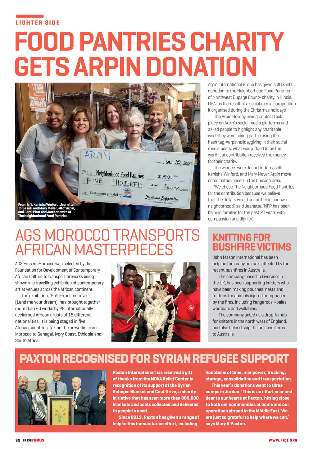 L I G H T E R S I DE FOOD PANTRIES CHARITY GETS ARPIN DONATION Arpin International Group has given a $US500 donation to the Neighborhood Food Pantries of Northwest Dupage County charity in Illinois, USA, as the result of a social media competition it organised during the Christmas holidays. The Arpin Holiday Giving Contest took place on Arpins social media platforms and asked people to highlight any charitable work they were taking part in using the hash tag #arpinholidaygiving in their social media posts; what was judged to be the worthiest contribution received the money for their charity. The winners were Jeanette Tomaselli, Kenisha Winford, and Mary Meyer, Arpin move coordinators based in the Chicago area. We chose The Neighborhood Food Pantries for the contribution because we believe that the dollars would go further in our own neighborhood, said Jeanette. NFP has been helping families for the past 20 years with compassion and dignity. From left, Kenisha Winford, Jeanette Tomaselli and Mary Meyer, all of Arpin, and Carol Platt and Jan Konewko of The Neighborhood Food Pantries AGS MOROCCO TRANSPORTS AFRICAN MASTERPIECES AGS Frasers Morocco was selected by the Foundation for Development of Contemporary African Culture to transport artworks being shown in a travelling exhibition of contemporary art at venues across the African continent. The exhibition, Prte-moi ton rve (Lend me your dream), has brought together more than 40 works by 28 internationally acclaimed African artists of 15 dierent nationalities. It is being staged in ve African countries, taking the artworks from Morocco to Senegal, Ivory Coast, Ethiopia and South Africa. KNITTING FOR BUSHFIRE VICTIMS John Mason International has been helping the many animals aected by the recent bushres in Australia. The company, based in Liverpool in the UK, has been supporting knitters who have been making pouches, nests and mittens for animals injured or orphaned by the res, including kangaroos, koalas, wombats and wallabies. The company acted as a drop-in hub for knitters in the north west of England, and also helped ship the nished items to Australia. PAXTON RECOGNISED FOR SYRIAN REFUGEE SUPPORT Paxton International has received a gift of thanks from the NOVA Relief Center in recognition of its support of the Syrian Refugee Blanket and Coat Drive, a charity initiative that has seen more than 300,000 blankets and coats collected and delivered to people in need. Since 2013, Paxton has given a range of help to this humanitarian eort, including 92 FF296 AprMay20 pp92-96 The Lighter Side.indd 92 donations of time, manpower, trucking, storage, consolidation and transportation. This years donations went to three camps in Jordan. This is an eort near and dear to our hearts at Paxton, hitting close to both our communities at home and our operations abroad in the Middle East. We are just so grateful to help where we can, says Mary K Paxton. WWW. F I D I . OR G 31/03/2020 09:14