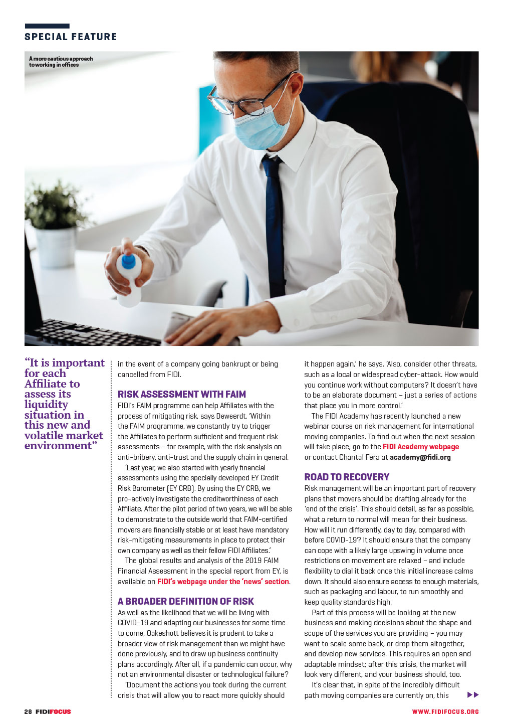 SPECIAL FEATURE A more cautious approach to working in offices It is important for each Affiliate to assess its liquidity situation in this new and volatile market environment in the event of a company going bankrupt or being cancelled from FIDI. RISK ASSESSMENT WITH FAIM FIDIs FAIM programme can help Affiliates with the process of mitigating risk, says Deweerdt. Within the FAIM programme, we constantly try to trigger the Affiliates to perform sufficient and frequent risk assessments for example, with the risk analysis on anti-bribery, anti-trust and the supply chain in general. Last year, we also started with yearly financial assessments using the specially developed EY Credit Risk Barometer (EY CRB). By using the EY CRB, we pro-actively investigate the creditworthiness of each Affiliate. After the pilot period of two years, we will be able to demonstrate to the outside world that FAIM-certified movers are financially stable or at least have mandatory risk-mitigating measurements in place to protect their own company as well as their fellow FIDI Affiliates. The global results and analysis of the 2019 FAIM Financial Assessment in the special report from EY, is available on FIDIs webpage under the news section. A BROADER DEFINITION OF RISK As well as the likelihood that we will be living with COVID-19 and adapting our businesses for some time to come, Oakeshott believes it is prudent to take a broader view of risk management than we might have done previously, and to draw up business continuity plans accordingly. After all, if a pandemic can occur, why not an environmental disaster or technological failure? Document the actions you took during the current crisis that will allow you to react more quickly should 28 FF297 JunJul20 pp22-30 Best p1.indd 28 it happen again, he says. Also, consider other threats, such as a local or widespread cyber-attack. How would you continue work without computers? It doesnt have to be an elaborate document just a series of actions that place you in more control. The FIDI Academy has recently launched a new webinar course on risk management for international moving companies. To find out when the next session will take place, go to the FIDI Academy webpage or contact Chantal Fera at academy@fidi.org ROAD TO RECOVERY Risk management will be an important part of recovery plans that movers should be drafting already for the end of the crisis. This should detail, as far as possible, what a return to normal will mean for their business. How will it run differently, day to day, compared with before COVID-19? It should ensure that the company can cope with a likely large upswing in volume once restrictions on movement are relaxed and include flexibility to dial it back once this initial increase calms down. It should also ensure access to enough materials, such as packaging and labour, to run smoothly and keep quality standards high. Part of this process will be looking at the new business and making decisions about the shape and scope of the services you are providing you may want to scale some back, or drop them altogether, and develop new services. This requires an open and adaptable mindset; after this crisis, the market will look very different, and your business should, too. Its clear that, in spite of the incredibly difficult path moving companies are currently on, this WW W. F I D I FOC U S . OR G 01/06/2020 14:54