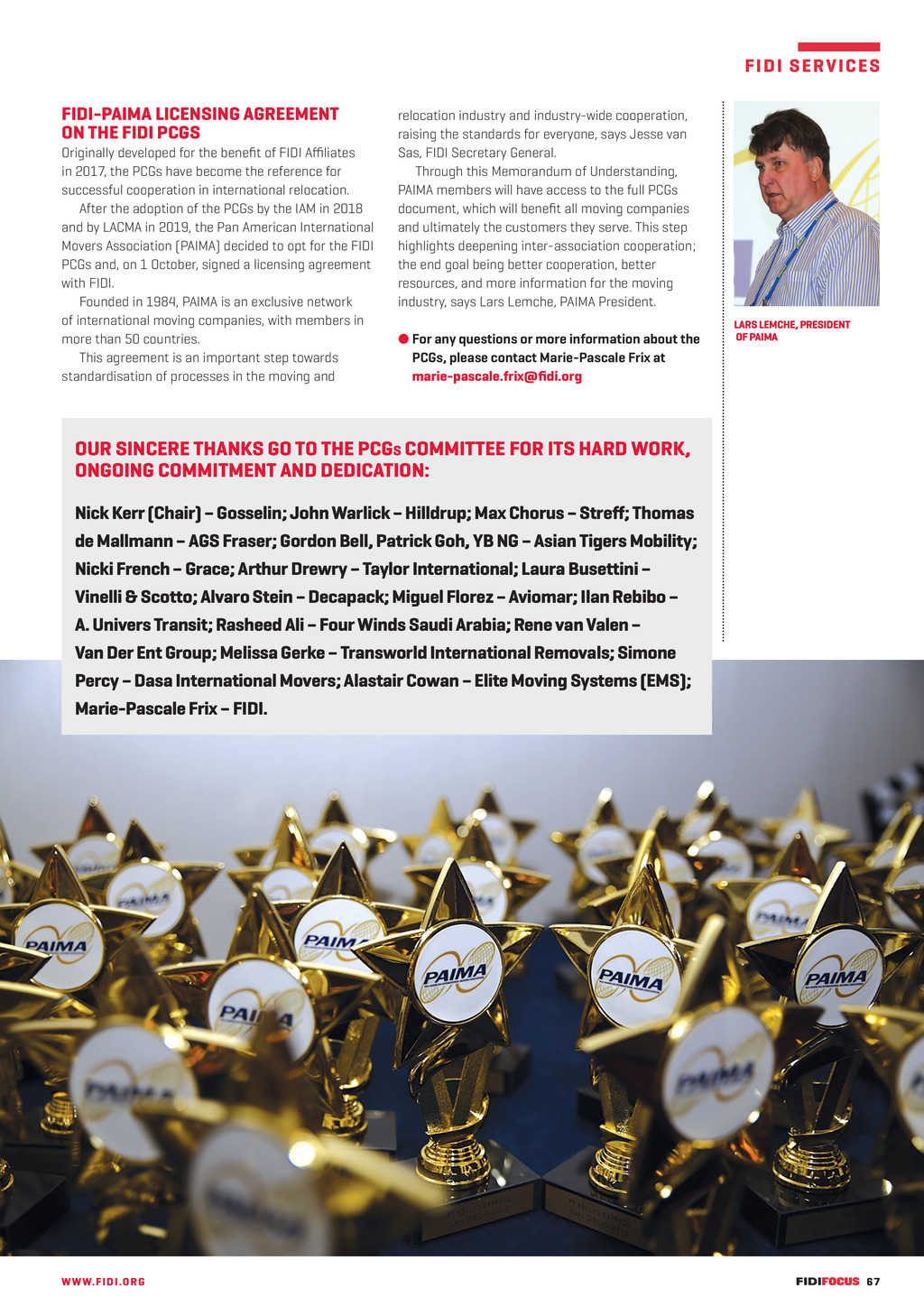 F I D I S E RV ICES LATEST EDITION OF PCGS GOES LIVE C A L L TO ACTION The FIDI Professional Cooperation Guidelines (PCGs) have gained a firm status as reference for best practice in the wider international moving industry. Over the past few months, two key milestones were reached, strengthening this position. By Marie-Pascale Frix, Business Intelligence Manager T he FIDI Professional Cooperation Guidelines (PGCs) document has undergone its third review since it was launched in 2017. THE PCGS COMMITTEES ROLE MARIE-PASCALE FRIX, FIDI BUSINESS INTELLIGENCE MANAGER 66 FF300 DecJan21 pp66-67 PCGs v2.indd 66 Despite the challenges of the COVID-19 pandemic, the PCGs Committee worked hard to complete its annual review of the PCGs document, analysing in detail the suitability of the current guidelines, taking into consideration all proposals for change from FIDI Aliates, FIDI Associations and from cases erational manual l Update your op plates with the m te and company e ts to the PCGs th latest amendmen are on rsi ve d ne dli re 2020 PCGs and its FIDINET available on l Mitigate risks of ove in the m nd misu erstandings trading ur yo k as process by partners to abide Gs PC e th solved through the Dispute Resolution Scheme (DRS). Each proposal must be analysed to see if it fits the scope of the PCGs. This requires lots of rigour and an ongoing review of the relevance of the PCGs guidelines, so that they constantly remain up to date and adaptable for our industry. The role of the PCGs Committee is crucial to the integrity and sustainability of the PCGs document. 2020 EDITION KEY HIGHLIGHT: ONE VERSION FOR ALL USERS The 2019 PCGs consisted of two versions of the guidelines: one for FIDI Aliates (the ocial document) and one version to be used by other trade associations licensed by FIDI, with all references to FIDI and FAIM removed. The PCGs Committee concluded that there should only be one version of the document in force, adapted to the use by both FIDI and other trade associations (based on a signed agreement with FIDI). The 2020 edition, as approved by the FIDI Extra-ordinary General Assembly on 20 October 2020 is, consequently, applicable without exception to both FIDI and other PCGs licensed trade associations and their members, at all times. WWW. F I D I FOC U S . OR G 24/11/2020 11:39