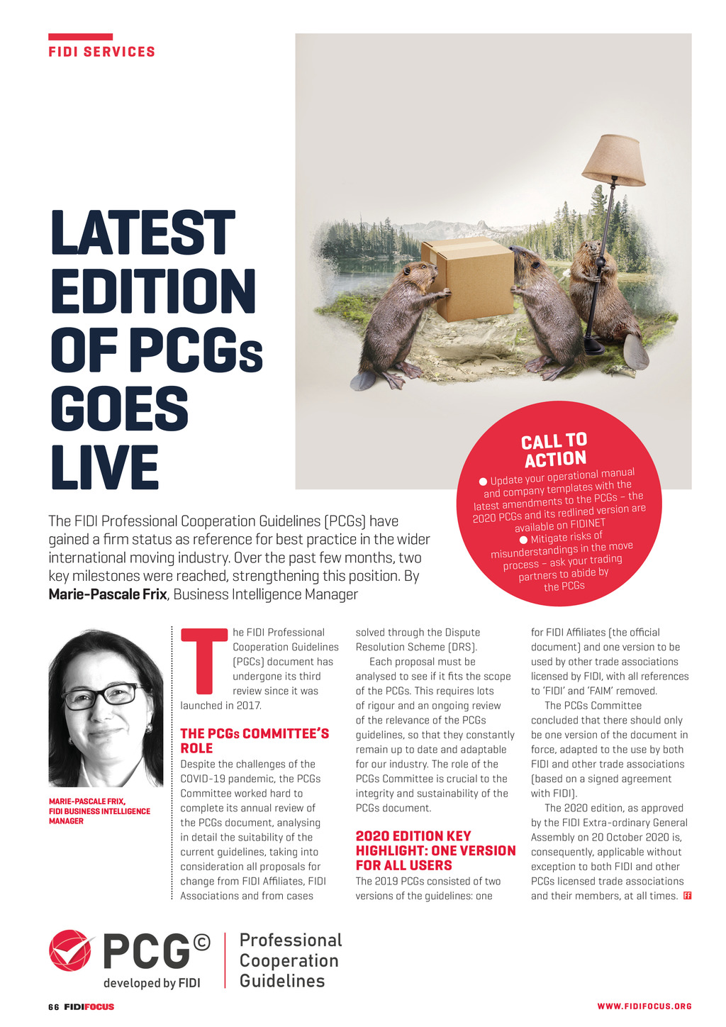F I D I S E RV ICES LATEST EDITION OF PCGS GOES LIVE C A L L TO ACTION The FIDI Professional Cooperation Guidelines (PCGs) have gained a firm status as reference for best practice in the wider international moving industry. Over the past few months, two key milestones were reached, strengthening this position. By Marie-Pascale Frix, Business Intelligence Manager T he FIDI Professional Cooperation Guidelines (PGCs) document has undergone its third review since it was launched in 2017. THE PCGS COMMITTEES ROLE MARIE-PASCALE FRIX, FIDI BUSINESS INTELLIGENCE MANAGER 66 FF300 DecJan21 pp66-67 PCGs v2.indd 66 Despite the challenges of the COVID-19 pandemic, the PCGs Committee worked hard to complete its annual review of the PCGs document, analysing in detail the suitability of the current guidelines, taking into consideration all proposals for change from FIDI Aliates, FIDI Associations and from cases erational manual l Update your op plates with the m te and company e ts to the PCGs th latest amendmen are on rsi ve d ne dli re 2020 PCGs and its FIDINET available on l Mitigate risks of ove in the m nd misu erstandings trading ur yo k as process by partners to abide Gs PC e th solved through the Dispute Resolution Scheme (DRS). Each proposal must be analysed to see if it fits the scope of the PCGs. This requires lots of rigour and an ongoing review of the relevance of the PCGs guidelines, so that they constantly remain up to date and adaptable for our industry. The role of the PCGs Committee is crucial to the integrity and sustainability of the PCGs document. 2020 EDITION KEY HIGHLIGHT: ONE VERSION FOR ALL USERS The 2019 PCGs consisted of two versions of the guidelines: one for FIDI Aliates (the ocial document) and one version to be used by other trade associations licensed by FIDI, with all references to FIDI and FAIM removed. The PCGs Committee concluded that there should only be one version of the document in force, adapted to the use by both FIDI and other trade associations (based on a signed agreement with FIDI). The 2020 edition, as approved by the FIDI Extra-ordinary General Assembly on 20 October 2020 is, consequently, applicable without exception to both FIDI and other PCGs licensed trade associations and their members, at all times. WWW. F I D I FOC U S . OR G 24/11/2020 11:39