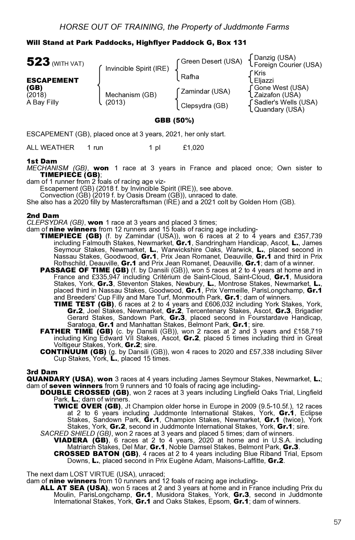 HORSE OUT OF TRAINING, the Property of Juddmonte Farms Will Stand at Park Paddocks, Highflyer Paddock G, Box 131 523 (WITH VAT) Invincible Spirit (IRE) Green Desert (USA) Rafha ESCAPEMENT (GB) (2018) A Bay Filly Mechanism (GB) (2013) Zamindar (USA) Clepsydra (GB) Danzig (USA) Foreign Courier (USA) Kris Eljazzi Gone West (USA) Zaizafon (USA) Sadler s Wells (USA) Quandary (USA) GBB (50%) ESCAPEMENT (GB), placed once at 3 years, 2021, her only start. ALL WEATHER 1 run 1 pl 1,020 1st Dam MECHANISM (GB), won 1 race at 3 years in France and placed once; Own sister to TIMEPIECE (GB); dam of 1 runner from 2 foals of racing age vizEscapement (GB) (2018 f. by Invincible Spirit (IRE)), see above. Convection (GB) (2019 f. by Oasis Dream (GB)), unraced to date. She also has a 2020 filly by Mastercraftsman (IRE) and a 2021 colt by Golden Horn (GB). 2nd Dam CLEPSYDRA (GB), won 1 race at 3 years and placed 3 times; dam of nine winners from 12 runners and 15 foals of racing age includingTIMEPIECE (GB) (f. by Zamindar (USA)), won 6 races at 2 to 4 years and 357,739 including Falmouth Stakes, Newmarket, Gr.1, Sandringham Handicap, Ascot, L., James Seymour Stakes, Newmarket, L., Warwickshire Oaks, Warwick, L., placed second in Nassau Stakes, Goodwood, Gr.1, Prix Jean Romanet, Deauville, Gr.1 and third in Prix Rothschild, Deauville, Gr.1 and Prix Jean Romanet, Deauville, Gr.1; dam of a winner. PASSAGE OF TIME (GB) (f. by Dansili (GB)), won 5 races at 2 to 4 years at home and in France and 335,947 including Critrium de Saint-Cloud, Saint-Cloud, Gr.1, Musidora Stakes, York, Gr.3, Steventon Stakes, Newbury, L., Montrose Stakes, Newmarket, L., placed third in Nassau Stakes, Goodwood, Gr.1, Prix Vermeille, ParisLongchamp, Gr.1 and Breeders Cup Filly and Mare Turf, Monmouth Park, Gr.1; dam of winners. TIME TEST (GB), 6 races at 2 to 4 years and 606,032 including York Stakes, York, Gr.2, Joel Stakes, Newmarket, Gr.2, Tercentenary Stakes, Ascot, Gr.3, Brigadier Gerard Stakes, Sandown Park, Gr.3, placed second in Fourstardave Handicap, Saratoga, Gr.1 and Manhattan Stakes, Belmont Park, Gr.1; sire. FATHER TIME (GB) (c. by Dansili (GB)), won 2 races at 2 and 3 years and 158,719 including King Edward VII Stakes, Ascot, Gr.2, placed 5 times including third in Great Voltigeur Stakes, York, Gr.2; sire. CONTINUUM (GB) (g. by Dansili (GB)), won 4 races to 2020 and 57,338 including Silver Cup Stakes, York, L., placed 15 times. 3rd Dam QUANDARY (USA), won 3 races at 4 years including James Seymour Stakes, Newmarket, L.; dam of seven winners from 9 runners and 10 foals of racing age includingDOUBLE CROSSED (GB), won 2 races at 3 years including Lingfield Oaks Trial, Lingfield Park, L.; dam of winners. TWICE OVER (GB), Jt Champion older horse in Europe in 2009 (9.5-10.5f.), 12 races at 2 to 6 years including Juddmonte International Stakes, York, Gr.1, Eclipse Stakes, Sandown Park, Gr.1, Champion Stakes, Newmarket, Gr.1 (twice), York Stakes, York, Gr.2, second in Juddmonte International Stakes, York, Gr.1; sire. SACRED SHIELD (GB), won 2 races at 3 years and placed 5 times; dam of winners. VIADERA (GB), 6 races at 2 to 4 years, 2020 at home and in U.S.A. including Matriarch Stakes, Del Mar, Gr.1, Noble Damsel Stakes, Belmont Park, Gr.3. CROSSED BATON (GB), 4 races at 2 to 4 years including Blue Riband Trial, Epsom Downs, L., placed second in Prix Eugne Adam, Maisons-Laffitte, Gr.2. The next dam LOST VIRTUE (USA), unraced; dam of nine winners from 10 runners and 12 foals of racing age includingALL AT SEA (USA), won 5 races at 2 and 3 years at home and in France including Prix du Moulin, ParisLongchamp, Gr.1, Musidora Stakes, York, Gr.3, second in Juddmonte International Stakes, York, Gr.1 and Oaks Stakes, Epsom, Gr.1; dam of winners. 57