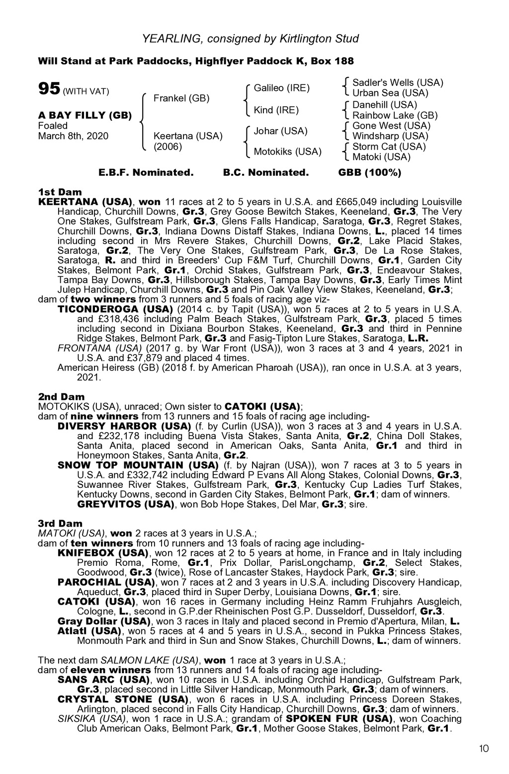 YEARLING, consigned by Kirtlington Stud Will Stand at Park Paddocks, Highflyer Paddock K, Box 188 95 (WITH VAT) A BAY FILLY (GB) Foaled March 8th, 2020 Frankel (GB) Keertana (USA) (2006) E.B.F. Nominated. Galileo (IRE) Kind (IRE) Johar (USA) Motokiks (USA) B.C. Nominated. Sadler s Wells (USA) Urban Sea (USA) Danehill (USA) Rainbow Lake (GB) Gone West (USA) Windsharp (USA) Storm Cat (USA) Matoki (USA) GBB (100%) 1st Dam KEERTANA (USA), won 11 races at 2 to 5 years in U.S.A. and 665,049 including Louisville Handicap, Churchill Downs, Gr.3, Grey Goose Bewitch Stakes, Keeneland, Gr.3, The Very One Stakes, Gulfstream Park, Gr.3, Glens Falls Handicap, Saratoga, Gr.3, Regret Stakes, Churchill Downs, Gr.3, Indiana Downs Distaff Stakes, Indiana Downs, L., placed 14 times including second in Mrs Revere Stakes, Churchill Downs, Gr.2, Lake Placid Stakes, Saratoga, Gr.2, The Very One Stakes, Gulfstream Park, Gr.3, De La Rose Stakes, Saratoga, R. and third in Breeders Cup F&M Turf, Churchill Downs, Gr.1, Garden City Stakes, Belmont Park, Gr.1, Orchid Stakes, Gulfstream Park, Gr.3, Endeavour Stakes, Tampa Bay Downs, Gr.3, Hillsborough Stakes, Tampa Bay Downs, Gr.3, Early Times Mint Julep Handicap, Churchill Downs, Gr.3 and Pin Oak Valley View Stakes, Keeneland, Gr.3; dam of two winners from 3 runners and 5 foals of racing age vizTICONDEROGA (USA) (2014 c. by Tapit (USA)), won 5 races at 2 to 5 years in U.S.A. and 318,436 including Palm Beach Stakes, Gulfstream Park, Gr.3, placed 5 times including second in Dixiana Bourbon Stakes, Keeneland, Gr.3 and third in Pennine Ridge Stakes, Belmont Park, Gr.3 and Fasig-Tipton Lure Stakes, Saratoga, L.R. FRONTANA (USA) (2017 g. by War Front (USA)), won 3 races at 3 and 4 years, 2021 in U.S.A. and 37,879 and placed 4 times. American Heiress (GB) (2018 f. by American Pharoah (USA)), ran once in U.S.A. at 3 years, 2021. 2nd Dam MOTOKIKS (USA), unraced; Own sister to CATOKI (USA); dam of nine winners from 13 runners and 15 foals of racing age includingDIVERSY HARBOR (USA) (f. by Curlin (USA)), won 3 races at 3 and 4 years in U.S.A. and 232,178 including Buena Vista Stakes, Santa Anita, Gr.2, China Doll Stakes, Santa Anita, placed second in American Oaks, Santa Anita, Gr.1 and third in Honeymoon Stakes, Santa Anita, Gr.2. SNOW TOP MOUNTAIN (USA) (f. by Najran (USA)), won 7 races at 3 to 5 years in U.S.A. and 332,742 including Edward P Evans All Along Stakes, Colonial Downs, Gr.3, Suwannee River Stakes, Gulfstream Park, Gr.3, Kentucky Cup Ladies Turf Stakes, Kentucky Downs, second in Garden City Stakes, Belmont Park, Gr.1; dam of winners. GREYVITOS (USA), won Bob Hope Stakes, Del Mar, Gr.3; sire. 3rd Dam MATOKI (USA), won 2 races at 3 years in U.S.A.; dam of ten winners from 10 runners and 13 foals of racing age includingKNIFEBOX (USA), won 12 races at 2 to 5 years at home, in France and in Italy including Premio Roma, Rome, Gr.1, Prix Dollar, ParisLongchamp, Gr.2, Select Stakes, Goodwood, Gr.3 (twice), Rose of Lancaster Stakes, Haydock Park, Gr.3; sire. PAROCHIAL (USA), won 7 races at 2 and 3 years in U.S.A. including Discovery Handicap, Aqueduct, Gr.3, placed third in Super Derby, Louisiana Downs, Gr.1; sire. CATOKI (USA), won 16 races in Germany including Heinz Ramm Fruhjahrs Ausgleich, Cologne, L., second in G.P.der Rheinischen Post G.P. Dusseldorf, Dusseldorf, Gr.3. Gray Dollar (USA), won 3 races in Italy and placed second in Premio d Apertura, Milan, L. Atlatl (USA), won 5 races at 4 and 5 years in U.S.A., second in Pukka Princess Stakes, Monmouth Park and third in Sun and Snow Stakes, Churchill Downs, L.; dam of winners. The next dam SALMON LAKE (USA), won 1 race at 3 years in U.S.A.; dam of eleven winners from 13 runners and 14 foals of racing age includingSANS ARC (USA), won 10 races in U.S.A. including Orchid Handicap, Gulfstream Park, Gr.3, placed second in Little Silver Handicap, Monmouth Park, Gr.3; dam of winners. CRYSTAL STONE (USA), won 6 races in U.S.A. including Princess Doreen Stakes, Arlington, placed second in Falls City Handicap, Churchill Downs, Gr.3; dam of winners. SIKSIKA (USA), won 1 race in U.S.A.; grandam of SPOKEN FUR (USA), won Coaching Club American Oaks, Belmont Park, Gr.1, Mother Goose Stakes, Belmont Park, Gr.1. 10