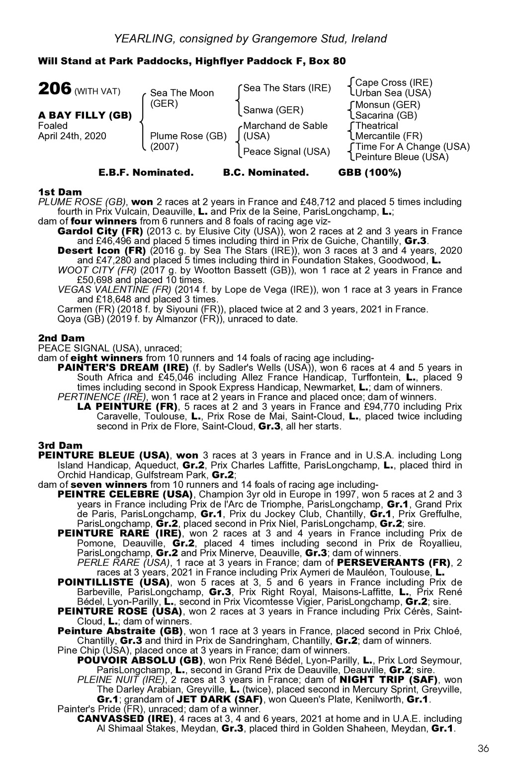 YEARLING, consigned by Grangemore Stud, Ireland Will Stand at Park Paddocks, Highflyer Paddock F, Box 80 206 (WITH VAT) A BAY FILLY (GB) Foaled April 24th, 2020 Sea The Stars (IRE) Sea The Moon (GER) Sanwa (GER) Plume Rose (GB) (2007) E.B.F. Nominated. Marchand de Sable (USA) Peace Signal (USA) B.C. Nominated. Cape Cross (IRE) Urban Sea (USA) Monsun (GER) Sacarina (GB) Theatrical Mercantile (FR) Time For A Change (USA) Peinture Bleue (USA) GBB (100%) 1st Dam PLUME ROSE (GB), won 2 races at 2 years in France and 48,712 and placed 5 times including fourth in Prix Vulcain, Deauville, L. and Prix de la Seine, ParisLongchamp, L.; dam of four winners from 6 runners and 8 foals of racing age vizGardol City (FR) (2013 c. by Elusive City (USA)), won 2 races at 2 and 3 years in France and 46,496 and placed 5 times including third in Prix de Guiche, Chantilly, Gr.3. Desert Icon (FR) (2016 g. by Sea The Stars (IRE)), won 3 races at 3 and 4 years, 2020 and 47,280 and placed 5 times including third in Foundation Stakes, Goodwood, L. WOOT CITY (FR) (2017 g. by Wootton Bassett (GB)), won 1 race at 2 years in France and 50,698 and placed 10 times. VEGAS VALENTINE (FR) (2014 f. by Lope de Vega (IRE)), won 1 race at 3 years in France and 18,648 and placed 3 times. Carmen (FR) (2018 f. by Siyouni (FR)), placed twice at 2 and 3 years, 2021 in France. Qoya (GB) (2019 f. by Almanzor (FR)), unraced to date. 2nd Dam PEACE SIGNAL (USA), unraced; dam of eight winners from 10 runners and 14 foals of racing age includingPAINTER S DREAM (IRE) (f. by Sadler s Wells (USA)), won 6 races at 4 and 5 years in South Africa and 45,046 including Allez France Handicap, Turffontein, L., placed 9 times including second in Spook Express Handicap, Newmarket, L.; dam of winners. PERTINENCE (IRE), won 1 race at 2 years in France and placed once; dam of winners. LA PEINTURE (FR), 5 races at 2 and 3 years in France and 94,770 including Prix Caravelle, Toulouse, L., Prix Rose de Mai, Saint-Cloud, L., placed twice including second in Prix de Flore, Saint-Cloud, Gr.3, all her starts. 3rd Dam PEINTURE BLEUE (USA), won 3 races at 3 years in France and in U.S.A. including Long Island Handicap, Aqueduct, Gr.2, Prix Charles Laffitte, ParisLongchamp, L., placed third in Orchid Handicap, Gulfstream Park, Gr.2; dam of seven winners from 10 runners and 14 foals of racing age includingPEINTRE CELEBRE (USA), Champion 3yr old in Europe in 1997, won 5 races at 2 and 3 years in France including Prix de l Arc de Triomphe, ParisLongchamp, Gr.1, Grand Prix de Paris, ParisLongchamp, Gr.1, Prix du Jockey Club, Chantilly, Gr.1, Prix Greffulhe, ParisLongchamp, Gr.2, placed second in Prix Niel, ParisLongchamp, Gr.2; sire. PEINTURE RARE (IRE), won 2 races at 3 and 4 years in France including Prix de Pomone, Deauville, Gr.2, placed 4 times including second in Prix de Royallieu, ParisLongchamp, Gr.2 and Prix Minerve, Deauville, Gr.3; dam of winners. PERLE RARE (USA), 1 race at 3 years in France; dam of PERSEVERANTS (FR), 2 races at 3 years, 2021 in France including Prix Aymeri de Maulon, Toulouse, L. POINTILLISTE (USA), won 5 races at 3, 5 and 6 years in France including Prix de Barbeville, ParisLongchamp, Gr.3, Prix Right Royal, Maisons-Laffitte, L., Prix Ren Bdel, Lyon-Parilly, L., second in Prix Vicomtesse Vigier, ParisLongchamp, Gr.2; sire. PEINTURE ROSE (USA), won 2 races at 3 years in France including Prix Crs, SaintCloud, L.; dam of winners. Peinture Abstraite (GB), won 1 race at 3 years in France, placed second in Prix Chlo, Chantilly, Gr.3 and third in Prix de Sandringham, Chantilly, Gr.2; dam of winners. Pine Chip (USA), placed once at 3 years in France; dam of winners. POUVOIR ABSOLU (GB), won Prix Ren Bdel, Lyon-Parilly, L., Prix Lord Seymour, ParisLongchamp, L., second in Grand Prix de Deauville, Deauville, Gr.2; sire. PLEINE NUIT (IRE), 2 races at 3 years in France; dam of NIGHT TRIP (SAF), won The Darley Arabian, Greyville, L. (twice), placed second in Mercury Sprint, Greyville, Gr.1; grandam of JET DARK (SAF), won Queen s Plate, Kenilworth, Gr.1. Painter s Pride (FR), unraced; dam of a winner. CANVASSED (IRE), 4 races at 3, 4 and 6 years, 2021 at home and in U.A.E. including Al Shimaal Stakes, Meydan, Gr.3, placed third in Golden Shaheen, Meydan, Gr.1. 36