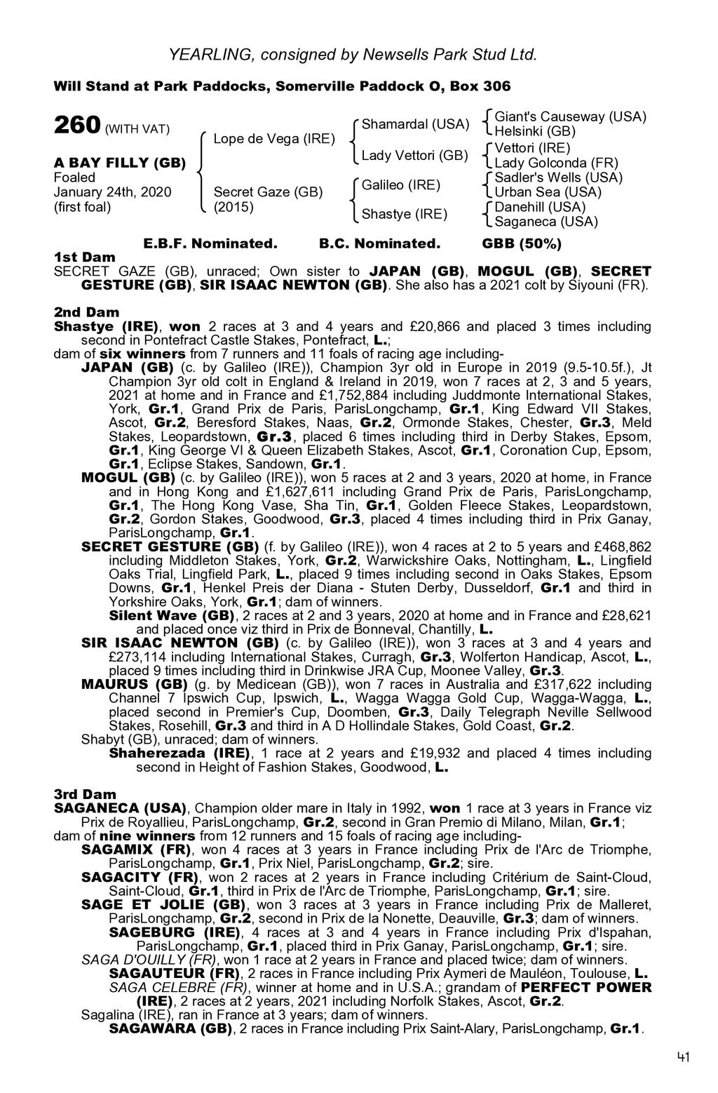 YEARLING, consigned by New England Stud Will Stand at Park Paddocks, Highflyer Paddock H, Box 100 246 (WITH VAT) A BAY FILLY (GB) Foaled May 8th, 2020 Invincible Spirit (IRE) Kingman (GB) Zenda (GB) Ruby Rocket (IRE) (2001) E.B.F. Nominated. Indian Rocket (GB) Geht Schnell B.C. Nominated. Green Desert (USA) Rafha Zamindar (USA) Hope (IRE) Indian Ridge Selvi Fairy King (USA) Anita s Princess GBB (100%) 1st Dam RUBY ROCKET (IRE), won 5 races at 2 to 4 years, 118,611 including Boadicea Stakes, Newmarket, L., Firth of Clyde Stakes, Ayr, L., placed 11 times viz second in Summer Stakes, York, Gr.3, Boadicea Stakes, Newmarket, L., Starlit Stakes, Goodwood, L., Cecil Frail Stakes, Haydock Park, L., third in Chipchase Stakes, Newcastle, Gr.3, Sweet Mimosa Stakes, Leopardstown, L., Dick Poole Stakes, Salisbury, L., Wentworth Stakes, Doncaster, L. and fourth in Cheveley Park Stakes, Newmarket, Gr.1, Chartwell Fillies Stakes, Lingfield Park, Gr.3 and Prix de Seine-et-Oise, Maisons-Laffitte, Gr.3; dam of three winners from 5 runners and 11 foals of racing age includingMAAREK (GB) (2007 g. by Pivotal (GB)), won 14 races at home and in France, 773,097 including Prix de l Abbaye de Longchamp, ParisLongchamp, Gr.1, QIPCO British Champions Sprint Stakes, Ascot, Gr.2, Duke of York Stakes, York, Gr.2, Dubai Int. World Trophy, Newbury, Gr.3, Chipchase Stakes, Newcastle, Gr.3, Renaissance Stakes, Curragh, Gr.3, Beverley Bullet Sprint, Beverley, L., Woodlands Stakes, Naas, L., placed 27 times including second in Flying Five Stakes, Curragh, Gr.2, Greenlands Stakes, Curragh, Gr.2, Greenlands Stakes, Curragh, Gr.3, Prix de Seine-et-Oise, MLaffitte, Gr.3, Woodlands Stakes, Naas, L., Waterford Testimonial Stakes, Curragh, L., Midsummer Sprint Stakes, Cork, L., third in Hackwood Stakes, Newbury, Gr.3. ERMINE RUBY (GB) (2011 f. by Cape Cross (IRE)), won 1 race at 3 years; dam of a winnerRecon Mission (IRE) (c. by Kodiac (GB)), 5 races at 2 to 5 years, 2021 and 122,195 and placed 8 times including second in Legacy Stakes, Navan, L. Lady Woodcote (GB) (2008 f. by Pivotal (GB)), unraced; dam of 2 winners includingWoodcote Lass (NZ) (f. by Showcasing (GB)), winner in New Zealand and placed third in NZB Canterbury Belle Stakes, Riccarton Park, L. Rubylina (GB) (2019 f. by Muhaarar (GB)), unraced to date. 2nd Dam GEHT SCHNELL, placed twice at 2 and 3 years; dam of nine winners from 10 runners and 14 foals of racing age includingINZAR S BEST (IRE) (c. by Inzar (USA)), won 3 races at 2 and 4 years in Germany, 36,994 including Kronimus Rennen, Baden-Baden, L., second in Prix Eclipse, Saint-Cloud, Gr.3. ALEXANDER ALLIANCE (IRE) (f. by Danetime (IRE)), won 1 race at 2 years and 37,337 viz Flame of Tara EBF Stakes, Curragh, L., placed once; dam of winners. Mystery Smiles (IRE), 2 races at 2 years, 2020 and 36,551 and placed 3 times viz third in Gimcrack Stakes, York, Gr.2, Sirenia Stakes, Kempton Park, Gr.3 and Craven Stakes, Newmarket, Gr.3, from only 6 starts. Cool Panic (IRE) (g. by Brave Act (GB)), won 2 races at 2 and 3 years and 20,401 and placed twice including second in Merrion Stakes, York, L. Good Clodora (IRE), ran 3 times at 2 years; dam of winners. ARDAD (IRE), 3 races at 2 years and 93,398 including Flying Childers Stakes, Doncaster, Gr.2, Windsor Castle Stakes, Ascot, L., placed once; sire. 3rd Dam ANITA S PRINCESS, unraced; dam of one winner from 5 runners and 6 foals of racing age vizASCANTANO (IRE), won 4 races at 3, 5 and 6 years in Germany and placed 6 times. The next dam GET READY, won 1 race at 2 years and placed once; dam of seven winners from 11 runners and 14 foals of racing age includingANITA S PRINCE, Champion 3yr old sprinter in Europe in 1984, won 3 races at 2 and 3 years including King George Stakes, Goodwood, Gr.3, second in King s Stand Stakes, Ascot, Gr.1 and third in Prix de l Abbaye de Longchamp, ParisLongchamp, Gr.1; sire. READY (IRE), won 5 races at home and in Hong Kong including Centurion Cup, Sha Tin, L. Merlannah (IRE), placed once at 3 years; dam of winners. KIER PARK (IRE), 3 races at 2 and 5 years including Cornwallis Stakes, Ascot, Gr.3, placed third in Prix Maurice de Gheest, Deauville, Gr.1; sire. 40