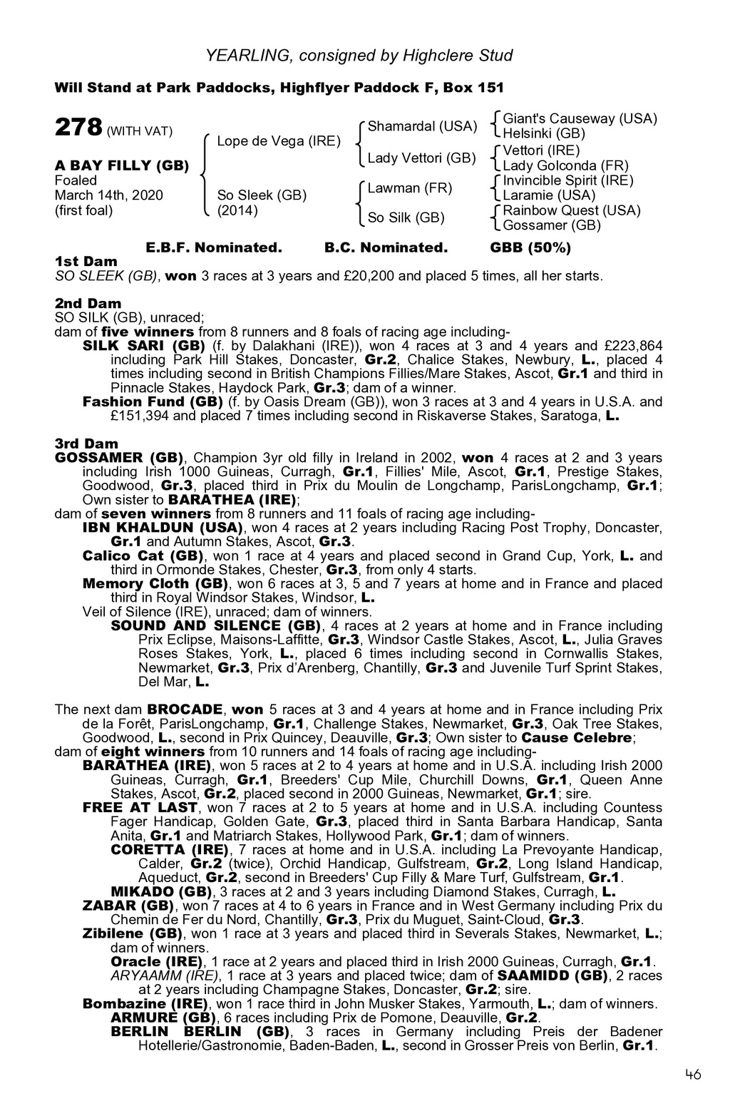 YEARLING, consigned by Highclere Stud Will Stand at Park Paddocks, Highflyer Paddock F, Box 151 278 (WITH VAT) A BAY FILLY (GB) Foaled March 14th, 2020 (first foal) Lope de Vega (IRE) So Sleek (GB) (2014) Shamardal (USA) Lady Vettori (GB) Lawman (FR) So Silk (GB) Giant s Causeway (USA) Helsinki (GB) Vettori (IRE) Lady Golconda (FR) Invincible Spirit (IRE) Laramie (USA) Rainbow Quest (USA) Gossamer (GB) E.B.F. Nominated. B.C. Nominated. GBB (50%) 1st Dam SO SLEEK (GB), won 3 races at 3 years and 20,200 and placed 5 times, all her starts. 2nd Dam SO SILK (GB), unraced; dam of five winners from 8 runners and 8 foals of racing age includingSILK SARI (GB) (f. by Dalakhani (IRE)), won 4 races at 3 and 4 years and 223,864 including Park Hill Stakes, Doncaster, Gr.2, Chalice Stakes, Newbury, L., placed 4 times including second in British Champions Fillies/Mare Stakes, Ascot, Gr.1 and third in Pinnacle Stakes, Haydock Park, Gr.3; dam of a winner. Fashion Fund (GB) (f. by Oasis Dream (GB)), won 3 races at 3 and 4 years in U.S.A. and 151,394 and placed 7 times including second in Riskaverse Stakes, Saratoga, L. 3rd Dam GOSSAMER (GB), Champion 3yr old filly in Ireland in 2002, won 4 races at 2 and 3 years including Irish 1000 Guineas, Curragh, Gr.1, Fillies Mile, Ascot, Gr.1, Prestige Stakes, Goodwood, Gr.3, placed third in Prix du Moulin de Longchamp, ParisLongchamp, Gr.1; Own sister to BARATHEA (IRE); dam of seven winners from 8 runners and 11 foals of racing age includingIBN KHALDUN (USA), won 4 races at 2 years including Racing Post Trophy, Doncaster, Gr.1 and Autumn Stakes, Ascot, Gr.3. Calico Cat (GB), won 1 race at 4 years and placed second in Grand Cup, York, L. and third in Ormonde Stakes, Chester, Gr.3, from only 4 starts. Memory Cloth (GB), won 6 races at 3, 5 and 7 years at home and in France and placed third in Royal Windsor Stakes, Windsor, L. Veil of Silence (IRE), unraced; dam of winners. SOUND AND SILENCE (GB), 4 races at 2 years at home and in France including Prix Eclipse, Maisons-Laffitte, Gr.3, Windsor Castle Stakes, Ascot, L., Julia Graves Roses Stakes, York, L., placed 6 times including second in Cornwallis Stakes, Newmarket, Gr.3, Prix dArenberg, Chantilly, Gr.3 and Juvenile Turf Sprint Stakes, Del Mar, L. The next dam BROCADE, won 5 races at 3 and 4 years at home and in France including Prix de la Fort, ParisLongchamp, Gr.1, Challenge Stakes, Newmarket, Gr.3, Oak Tree Stakes, Goodwood, L., second in Prix Quincey, Deauville, Gr.3; Own sister to Cause Celebre; dam of eight winners from 10 runners and 14 foals of racing age includingBARATHEA (IRE), won 5 races at 2 to 4 years at home and in U.S.A. including Irish 2000 Guineas, Curragh, Gr.1, Breeders Cup Mile, Churchill Downs, Gr.1, Queen Anne Stakes, Ascot, Gr.2, placed second in 2000 Guineas, Newmarket, Gr.1; sire. FREE AT LAST, won 7 races at 2 to 5 years at home and in U.S.A. including Countess Fager Handicap, Golden Gate, Gr.3, placed third in Santa Barbara Handicap, Santa Anita, Gr.1 and Matriarch Stakes, Hollywood Park, Gr.1; dam of winners. CORETTA (IRE), 7 races at home and in U.S.A. including La Prevoyante Handicap, Calder, Gr.2 (twice), Orchid Handicap, Gulfstream, Gr.2, Long Island Handicap, Aqueduct, Gr.2, second in Breeders Cup Filly & Mare Turf, Gulfstream, Gr.1. MIKADO (GB), 3 races at 2 and 3 years including Diamond Stakes, Curragh, L. ZABAR (GB), won 7 races at 4 to 6 years in France and in West Germany including Prix du Chemin de Fer du Nord, Chantilly, Gr.3, Prix du Muguet, Saint-Cloud, Gr.3. Zibilene (GB), won 1 race at 3 years and placed third in Severals Stakes, Newmarket, L.; dam of winners. Oracle (IRE), 1 race at 2 years and placed third in Irish 2000 Guineas, Curragh, Gr.1. ARYAAMM (IRE), 1 race at 3 years and placed twice; dam of SAAMIDD (GB), 2 races at 2 years including Champagne Stakes, Doncaster, Gr.2; sire. Bombazine (IRE), won 1 race third in John Musker Stakes, Yarmouth, L.; dam of winners. ARMURE (GB), 6 races including Prix de Pomone, Deauville, Gr.2. BERLIN BERLIN (GB), 3 races in Germany including Preis der Badener Hotellerie/Gastronomie, Baden-Baden, L., second in Grosser Preis von Berlin, Gr.1. 46