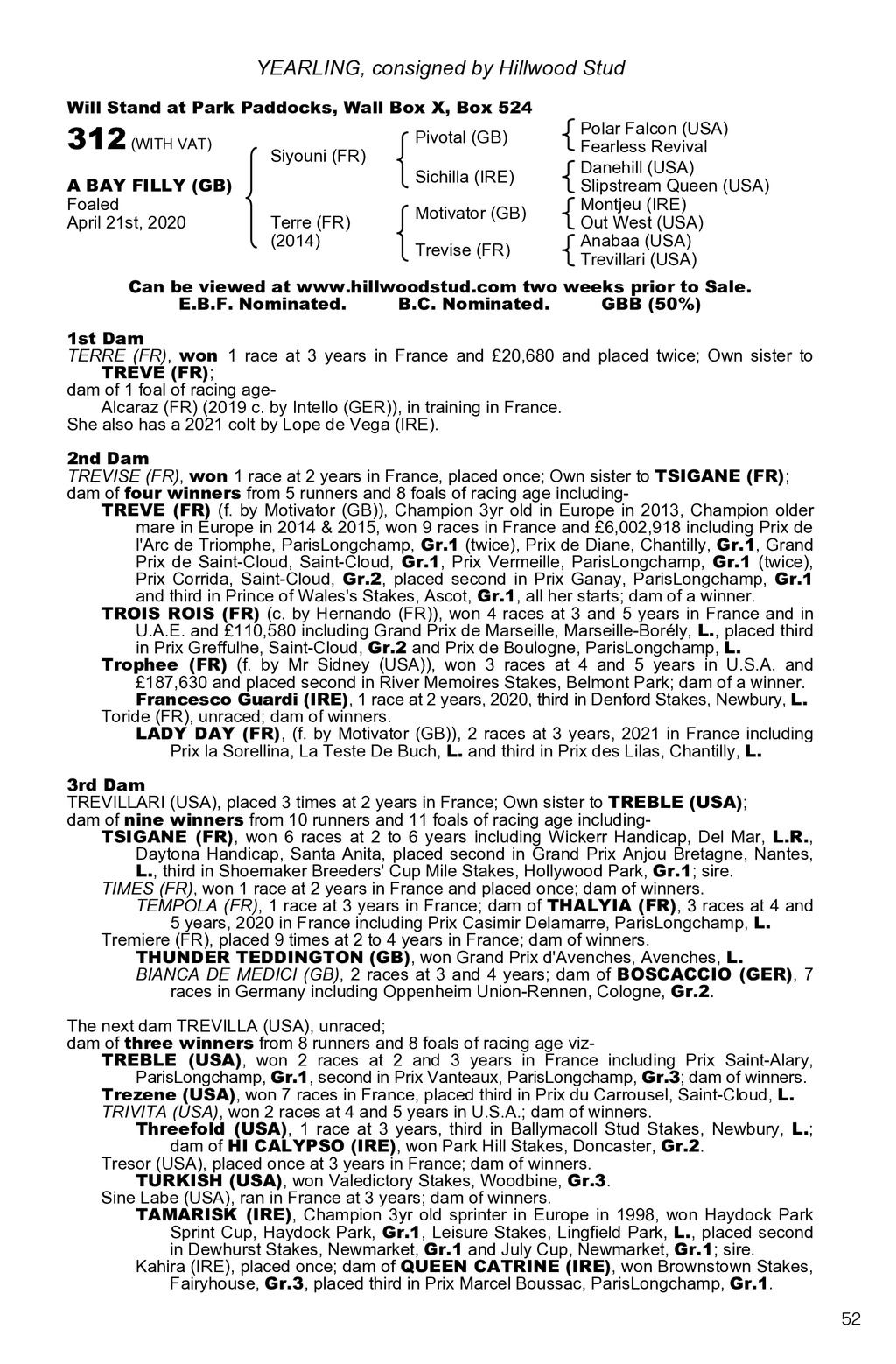 YEARLING, consigned by Hillwood Stud Will Stand at Park Paddocks, Wall Box X, Box 524 312 (WITH VAT) A BAY FILLY (GB) Foaled April 21st, 2020 Siyouni (FR) Terre (FR) (2014) Pivotal (GB) Sichilla (IRE) Motivator (GB) Trevise (FR) Polar Falcon (USA) Fearless Revival Danehill (USA) Slipstream Queen (USA) Montjeu (IRE) Out West (USA) Anabaa (USA) Trevillari (USA) Can be viewed at www.hillwoodstud.com two weeks prior to Sale. E.B.F. Nominated. B.C. Nominated. GBB (50%) 1st Dam TERRE (FR), won 1 race at 3 years in France and 20,680 and placed twice; Own sister to TREVE (FR); dam of 1 foal of racing ageAlcaraz (FR) (2019 c. by Intello (GER)), in training in France. She also has a 2021 colt by Lope de Vega (IRE). 2nd Dam TREVISE (FR), won 1 race at 2 years in France, placed once; Own sister to TSIGANE (FR); dam of four winners from 5 runners and 8 foals of racing age includingTREVE (FR) (f. by Motivator (GB)), Champion 3yr old in Europe in 2013, Champion older mare in Europe in 2014 & 2015, won 9 races in France and 6,002,918 including Prix de l Arc de Triomphe, ParisLongchamp, Gr.1 (twice), Prix de Diane, Chantilly, Gr.1, Grand Prix de Saint-Cloud, Saint-Cloud, Gr.1, Prix Vermeille, ParisLongchamp, Gr.1 (twice), Prix Corrida, Saint-Cloud, Gr.2, placed second in Prix Ganay, ParisLongchamp, Gr.1 and third in Prince of Wales s Stakes, Ascot, Gr.1, all her starts; dam of a winner. TROIS ROIS (FR) (c. by Hernando (FR)), won 4 races at 3 and 5 years in France and in U.A.E. and 110,580 including Grand Prix de Marseille, Marseille-Borly, L., placed third in Prix Greffulhe, Saint-Cloud, Gr.2 and Prix de Boulogne, ParisLongchamp, L. Trophee (FR) (f. by Mr Sidney (USA)), won 3 races at 4 and 5 years in U.S.A. and 187,630 and placed second in River Memoires Stakes, Belmont Park; dam of a winner. Francesco Guardi (IRE), 1 race at 2 years, 2020, third in Denford Stakes, Newbury, L. Toride (FR), unraced; dam of winners. LADY DAY (FR), (f. by Motivator (GB)), 2 races at 3 years, 2021 in France including Prix la Sorellina, La Teste De Buch, L. and third in Prix des Lilas, Chantilly, L. 3rd Dam TREVILLARI (USA), placed 3 times at 2 years in France; Own sister to TREBLE (USA); dam of nine winners from 10 runners and 11 foals of racing age includingTSIGANE (FR), won 6 races at 2 to 6 years including Wickerr Handicap, Del Mar, L.R., Daytona Handicap, Santa Anita, placed second in Grand Prix Anjou Bretagne, Nantes, L., third in Shoemaker Breeders Cup Mile Stakes, Hollywood Park, Gr.1; sire. TIMES (FR), won 1 race at 2 years in France and placed once; dam of winners. TEMPOLA (FR), 1 race at 3 years in France; dam of THALYIA (FR), 3 races at 4 and 5 years, 2020 in France including Prix Casimir Delamarre, ParisLongchamp, L. Tremiere (FR), placed 9 times at 2 to 4 years in France; dam of winners. THUNDER TEDDINGTON (GB), won Grand Prix d Avenches, Avenches, L. BIANCA DE MEDICI (GB), 2 races at 3 and 4 years; dam of BOSCACCIO (GER), 7 races in Germany including Oppenheim Union-Rennen, Cologne, Gr.2. The next dam TREVILLA (USA), unraced; dam of three winners from 8 runners and 8 foals of racing age vizTREBLE (USA), won 2 races at 2 and 3 years in France including Prix Saint-Alary, ParisLongchamp, Gr.1, second in Prix Vanteaux, ParisLongchamp, Gr.3; dam of winners. Trezene (USA), won 7 races in France, placed third in Prix du Carrousel, Saint-Cloud, L. TRIVITA (USA), won 2 races at 4 and 5 years in U.S.A.; dam of winners. Threefold (USA), 1 race at 3 years, third in Ballymacoll Stud Stakes, Newbury, L.; dam of HI CALYPSO (IRE), won Park Hill Stakes, Doncaster, Gr.2. Tresor (USA), placed once at 3 years in France; dam of winners. TURKISH (USA), won Valedictory Stakes, Woodbine, Gr.3. Sine Labe (USA), ran in France at 3 years; dam of winners. TAMARISK (IRE), Champion 3yr old sprinter in Europe in 1998, won Haydock Park Sprint Cup, Haydock Park, Gr.1, Leisure Stakes, Lingfield Park, L., placed second in Dewhurst Stakes, Newmarket, Gr.1 and July Cup, Newmarket, Gr.1; sire. Kahira (IRE), placed once; dam of QUEEN CATRINE (IRE), won Brownstown Stakes, Fairyhouse, Gr.3, placed third in Prix Marcel Boussac, ParisLongchamp, Gr.1. 52
