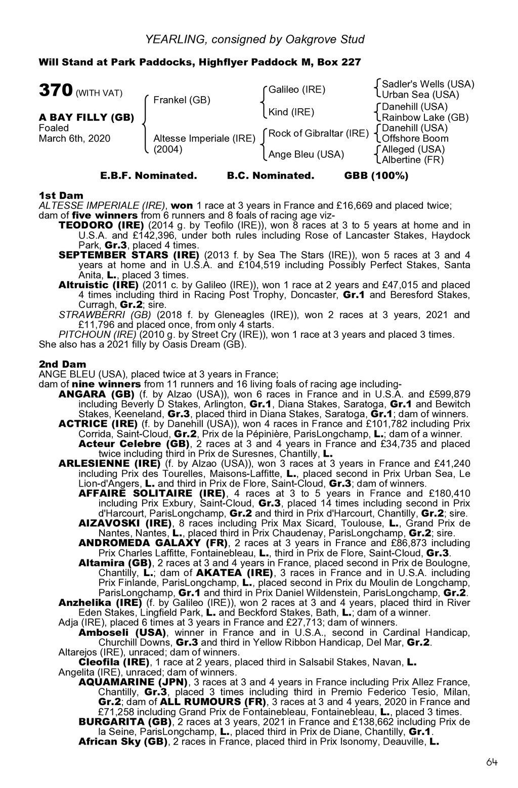 YEARLING, consigned by Oakgrove Stud Will Stand at Park Paddocks, Highflyer Paddock M, Box 227 370 (WITH VAT) A BAY FILLY (GB) Foaled March 6th, 2020 Galileo (IRE) Frankel (GB) Kind (IRE) Altesse Imperiale (IRE) (2004) E.B.F. Nominated. Rock of Gibraltar (IRE) Ange Bleu (USA) B.C. Nominated. Sadler s Wells (USA) Urban Sea (USA) Danehill (USA) Rainbow Lake (GB) Danehill (USA) Offshore Boom Alleged (USA) Albertine (FR) GBB (100%) 1st Dam ALTESSE IMPERIALE (IRE), won 1 race at 3 years in France and 16,669 and placed twice; dam of five winners from 6 runners and 8 foals of racing age vizTEODORO (IRE) (2014 g. by Teofilo (IRE)), won 8 races at 3 to 5 years at home and in U.S.A. and 142,396, under both rules including Rose of Lancaster Stakes, Haydock Park, Gr.3, placed 4 times. SEPTEMBER STARS (IRE) (2013 f. by Sea The Stars (IRE)), won 5 races at 3 and 4 years at home and in U.S.A. and 104,519 including Possibly Perfect Stakes, Santa Anita, L., placed 3 times. Altruistic (IRE) (2011 c. by Galileo (IRE)), won 1 race at 2 years and 47,015 and placed 4 times including third in Racing Post Trophy, Doncaster, Gr.1 and Beresford Stakes, Curragh, Gr.2; sire. STRAWBERRI (GB) (2018 f. by Gleneagles (IRE)), won 2 races at 3 years, 2021 and 11,796 and placed once, from only 4 starts. PITCHOUN (IRE) (2010 g. by Street Cry (IRE)), won 1 race at 3 years and placed 3 times. She also has a 2021 filly by Oasis Dream (GB). 2nd Dam ANGE BLEU (USA), placed twice at 3 years in France; dam of nine winners from 11 runners and 16 living foals of racing age includingANGARA (GB) (f. by Alzao (USA)), won 6 races in France and in U.S.A. and 599,879 including Beverly D Stakes, Arlington, Gr.1, Diana Stakes, Saratoga, Gr.1 and Bewitch Stakes, Keeneland, Gr.3, placed third in Diana Stakes, Saratoga, Gr.1; dam of winners. ACTRICE (IRE) (f. by Danehill (USA)), won 4 races in France and 101,782 including Prix Corrida, Saint-Cloud, Gr.2, Prix de la Ppinire, ParisLongchamp, L.; dam of a winner. Acteur Celebre (GB), 2 races at 3 and 4 years in France and 34,735 and placed twice including third in Prix de Suresnes, Chantilly, L. ARLESIENNE (IRE) (f. by Alzao (USA)), won 3 races at 3 years in France and 41,240 including Prix des Tourelles, Maisons-Laffitte, L., placed second in Prix Urban Sea, Le Lion-d Angers, L. and third in Prix de Flore, Saint-Cloud, Gr.3; dam of winners. AFFAIRE SOLITAIRE (IRE), 4 races at 3 to 5 years in France and 180,410 including Prix Exbury, Saint-Cloud, Gr.3, placed 14 times including second in Prix d Harcourt, ParisLongchamp, Gr.2 and third in Prix d Harcourt, Chantilly, Gr.2; sire. AIZAVOSKI (IRE), 8 races including Prix Max Sicard, Toulouse, L., Grand Prix de Nantes, Nantes, L., placed third in Prix Chaudenay, ParisLongchamp, Gr.2; sire. ANDROMEDA GALAXY (FR), 2 races at 3 years in France and 86,873 including Prix Charles Laffitte, Fontainebleau, L., third in Prix de Flore, Saint-Cloud, Gr.3. Altamira (GB), 2 races at 3 and 4 years in France, placed second in Prix de Boulogne, Chantilly, L.; dam of AKATEA (IRE), 3 races in France and in U.S.A. including Prix Finlande, ParisLongchamp, L., placed second in Prix du Moulin de Longchamp, ParisLongchamp, Gr.1 and third in Prix Daniel Wildenstein, ParisLongchamp, Gr.2. Anzhelika (IRE) (f. by Galileo (IRE)), won 2 races at 3 and 4 years, placed third in River Eden Stakes, Lingfield Park, L. and Beckford Stakes, Bath, L.; dam of a winner. Adja (IRE), placed 6 times at 3 years in France and 27,713; dam of winners. Amboseli (USA), winner in France and in U.S.A., second in Cardinal Handicap, Churchill Downs, Gr.3 and third in Yellow Ribbon Handicap, Del Mar, Gr.2. Altarejos (IRE), unraced; dam of winners. Cleofila (IRE), 1 race at 2 years, placed third in Salsabil Stakes, Navan, L. Angelita (IRE), unraced; dam of winners. AQUAMARINE (JPN), 3 races at 3 and 4 years in France including Prix Allez France, Chantilly, Gr.3, placed 3 times including third in Premio Federico Tesio, Milan, Gr.2; dam of ALL RUMOURS (FR), 3 races at 3 and 4 years, 2020 in France and 71,258 including Grand Prix de Fontainebleau, Fontainebleau, L., placed 3 times. BURGARITA (GB), 2 races at 3 years, 2021 in France and 138,662 including Prix de la Seine, ParisLongchamp, L., placed third in Prix de Diane, Chantilly, Gr.1. African Sky (GB), 2 races in France, placed third in Prix Isonomy, Deauville, L. 64