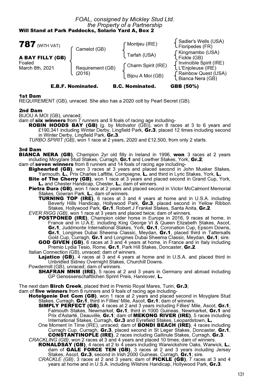 YEARLING, consigned by WH Bloodstock Will Stand at Park Paddocks, Wall Box V, Box 489 1847 (WITH VAT) A CHESNUT FILLY (GB) Foaled April 19th, 2020 Nathaniel (IRE) Aertex (IRE) (2011) E.B.F. Nominated. Galileo (IRE) Magnificient Style (USA) Exceed And Excel (AUS) Gingham (GB) B.C. Nominated. Sadler s Wells (USA) Urban Sea (USA) Silver Hawk (USA) Mia Karina (USA) Danehill (USA) Patrona (USA) Barathea (IRE) Sianema (GB) GBB (100%) 1st Dam AERTEX (IRE), won 3 races at 2 and 3 years and 12,694 and placed once; dam of 2 runners from 3 foals of racing age includingIrisa (GB) (2019 f. by Tamayuz (GB)), ran once at 2 years, 2021. 2nd Dam GINGHAM (GB), placed 3 times at 2 and 3 years; dam of one winner from 1 runner and 1 foal of racing age vizAERTEX (IRE), see above. 3rd Dam SIANEMA (GB), placed once at 3 years; dam of three winners from 5 runners and 10 foals of racing age includingSERGESTO (GB), won 17 races in Italy including Premio Divino Amore, Rome, L. Kivavite (USA), unraced; dam of: Ordoneyah (FR), unraced; dam of Songlark (IND), winner abroad and placed second in Golconda Oaks, Hyderabad, L. The next dam SERIEMA, won 1 race at 3 years and placed twice; dam of four winners from 10 runners and 11 foals of racing age includingINFAMY, won 7 races at home and in U.S.A. including Rothman s International Stakes, Woodbine, Gr.1, Sun Chariot Stakes, Newmarket, Gr.2, Gordon Richards Stakes, Sandown Park, Gr.3, second in Coronation Cup, Epsom Downs, Gr.1; dam of winners. INNUENDO (IRE), 7 races at 3 to 6 years at home and in U.S.A. including Orchid Handicap, Gulfstream Park, Gr.2, The Very One Handicap, Gulfstream Park, Gr.3, placed third in E P Taylor Stakes, Woodbine, Gr.1; dam of CRITICISM (GB), 9 races in France and in U.S.A. including La Prevoyante Handicap, Calder, Gr.2, Sheepshead Bay Stakes, Belmont Park, Gr.2, Long Island Handicap, Aqueduct, Gr.3 (twice), The Very One Stakes, Gulfstream Park, Gr.3, placed second in Flower Bowl Invitational Stakes, Belmont Park, Gr.1, PEACOAT (GB), 2 races in France including Prix Mlisande, Fontainebleau, L.; grandam of MAGICAL TOUCH (GB), won Grosser Preis des MHWK - Steher Preis, Berlin-Hoppegarten, L. MOON QUEEN (IRE), 4 races at 3 and 4 years in France and in U.S.A. including Prix de Royallieu, ParisLongchamp, Gr.2, The Very One Handicap, Gulfstream Park, Gr.3; dam of BEAUTY PARLOR (USA), won Orchid Stakes, Gulfstream Park, Gr.3, THE BROTHERS WAR (USA), won Prix Sigy, Chantilly, L.; sire; grandam of ENOLA GAY (USA), won Appalachian Stakes, Keeneland, Gr.2. BARAFAMY (IRE), Champion 2yr old in Italy in 1998, 2 races at 2 years at home and in Italy including Premio Dormello, Milan, Gr.3. ROSTROPOVICH (IRE), 3 races at 3 and 4 years including Saval Beg Stakes, Leopardstown, L., third in Prix Hubert de Chaudenay, ParisLongchamp, Gr.2. FAMOUSLY (IRE), 3 races at 3 years in France and placed 4 times; grandam of FAMOUS WOLF (FR), won Prix Maurice Caillault, Chantilly, L. QUEEN (IRE), 1 race at 3 years and placed once; grandam of SELFIE STAR (IND), won The Eve Champion Trophy, Pune, L.R., SILVER BEAUTY (IND), won The Calcutta Oaks, Kolkata, L.R. and Calcutta 1000 Guineas, Kolkata, L.R. MEETYOUTHERE (IRE), 1 race at 3 years in France; dam of RAA ATOLL (GB), 3 races at 3 and 4 years at home and in Germany including Comer Oleander Rennen, Berlin-Hoppegarten, Gr.2; sire, Moderah (GB), 1 race at 3 years and placed third in St Simon Stakes, Newbury, Gr.3. Distinctly (IRE), unraced; dam of Summerbliss (AUS), winner in Australia and placed third in Crown Victoria Oaks, Flemington, Gr.1. Lady Regent, won 1 race, third in Carna Fillies Stakes, Naas, L.; dam of winners. Shesadelight (GB), placed 3 times at 3 years; dam of winners. SHIELD (GB), 2 races at 2 and 3 years including Classic Trial, Sandown Park, Gr.3. 132