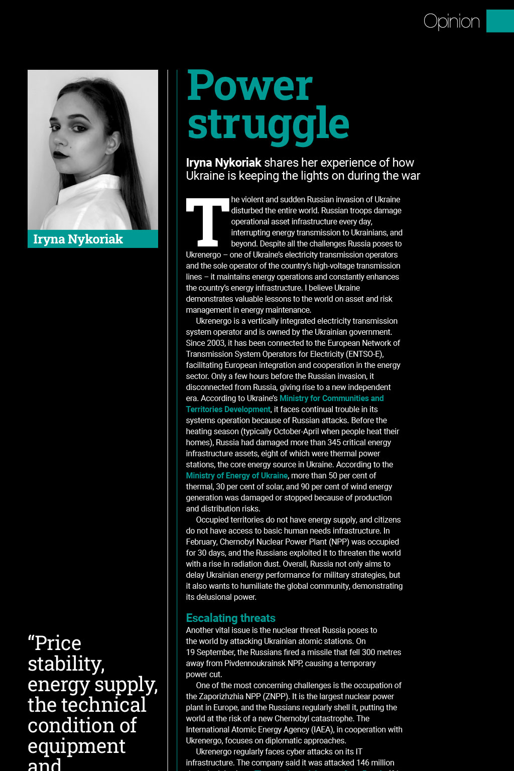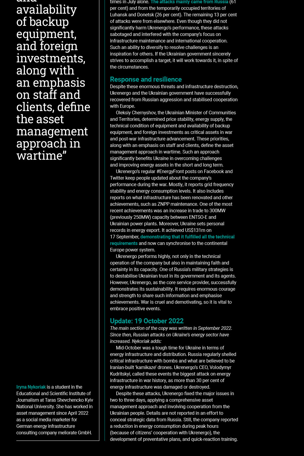 Opinion Power struggle Iryna Nykoriak shares her experience of how Ukraine is keeping the lights on during the war Iryna Nykoriak The violent and sudden Russian invasion of Ukraine disturbed the entire world. Russian troops damage operational asset infrastructure every day, interrupting energy transmission to Ukrainians, and beyond. Despite all the challenges Russia poses to Ukrenergo one of Ukraines electricity transmission operators and the sole operator of the countrys high-voltage transmission lines it maintains energy operations and constantly enhances the countrys energy infrastructure. I believe Ukraine demonstrates valuable lessons to the world on asset and risk management in energy maintenance. Ukrenergo is a vertically integrated electricity transmission system operator and is owned by the Ukrainian government. Since 2003, it has been connected to the European Network of Transmission System Operators for Electricity (ENTSO-E), facilitating European integration and cooperation in the energy sector. Only a few hours before the Russian invasion, it disconnected from Russia, giving rise to a new independent era. According to Ukraines Ministry for Communities and Territories Development, it faces continual trouble in its systems operation because of Russian attacks. Before the heating season (typically October-April when people heat their homes), Russia had damaged more than 345 critical energy infrastructure assets, eight of which were thermal power stations, the core energy source in Ukraine. According to the Ministry of Energy of Ukraine, more than 50 per cent of thermal, 30 per cent of solar, and 90 per cent of wind energy generation was damaged or stopped because of production and distribution risks. Occupied territories do not have energy supply, and citizens do not have access to basic human needs infrastructure. In February, Chernobyl Nuclear Power Plant (NPP) was occupied for 30 days, and the Russians exploited it to threaten the world with a rise in radiation dust. Overall, Russia not only aims to delay Ukrainian energy performance for military strategies, but it also wants to humiliate the global community, demonstrating its delusional power. Escalating threats Price stability, energy supply, the technical condition of equipment and availability of backup equipment, and foreign investments, along with an emphasis on staff and clients, define the asset management approach in wartime Another vital issue is the nuclear threat Russia poses to the world by attacking Ukrainian atomic stations. On 19 September, the Russians fired a missile that fell 300 metres away from Pivdennoukrainsk NPP, causing a temporary power cut. One of the most concerning challenges is the occupation of the Zaporizhzhia NPP (ZNPP). It is the largest nuclear power plant in Europe, and the Russians regularly shell it, putting the world at the risk of a new Chernobyl catastrophe. The International Atomic Energy Agency (IAEA), in cooperation with Ukrenergo, focuses on diplomatic approaches. Ukrenergo regularly faces cyber attacks on its IT infrastructure. The company said it was attacked 146 million times in July alone. The attacks mainly came from Russia (61 per cent) and from the temporarily occupied territories of Luhansk and Donetsk (26 per cent). The remaining 13 per cent of attacks were from elsewhere. Even though they did not significantly harm Ukrenergos performance, these attacks sabotaged and interfered with the companys focus on infrastructure maintenance and international cooperation. Such an ability to diversify to resolve challenges is an inspiration for others. If the Ukrainian government sincerely strives to accomplish a target, it will work towards it, in spite of the circumstances. Response and resilience Despite these enormous threats and infrastructure destruction, Ukrenergo and the Ukrainian government have successfully recovered from Russian aggression and stabilised cooperation with Europe. Oleksiy Chernyshov, the Ukrainian Minister of Communities and Territories, determined price stability, energy supply, the technical condition of equipment and availability of backup equipment, and foreign investments as critical assets in war and post-war infrastructure advancement. These priorities, along with an emphasis on staff and clients, define the asset management approach in wartime. Such an approach significantly benefits Ukraine in overcoming challenges and improving energy assets in the short and long term. Ukrenergos regular #EnergyFront posts on Facebook and Twitter keep people updated about the companys performance during the war. Mostly, it reports grid frequency stability and energy consumption levels. It also includes reports on what infrastructure has been renovated and other achievements, such as ZNPP maintenance. One of the most recent achievements was an increase in trade to 300MW (previously 250MW) capacity between ENTSO-E and Ukrainian power plants. Moreover, Ukraine sets personal records in energy export. It achieved US$131m on 17 September, demonstrating that it fulfilled all the technical requirements and now can synchronise to the continental Europe power system. Ukrenergo performs highly, not only in the technical operation of the company but also in maintaining faith and certainty in its capacity. One of Russias military strategies is to destabilise Ukrainian trust in its government and its agents. However, Ukrenergo, as the core service provider, successfully demonstrates its sustainability. It requires enormous courage and strength to share such information and emphasise achievements. War is cruel and demotivating, so it is vital to embrace positive events. Update: 19 October 2022 Iryna Nykoriak is a student in the Educational and Scientific Institute of Journalism at Taras Shevchencko Kyiv National University. She has worked in asset management since April 2022 as a social media marketer for German energy infrastructure consulting company meliorate GmbH. The main s