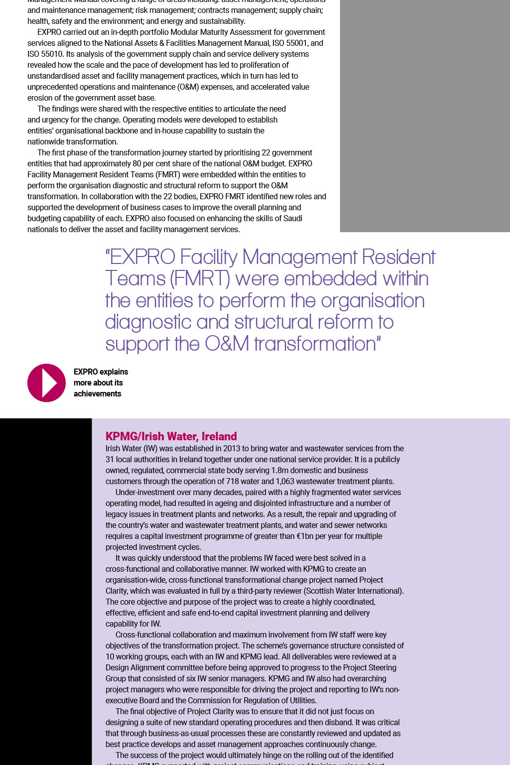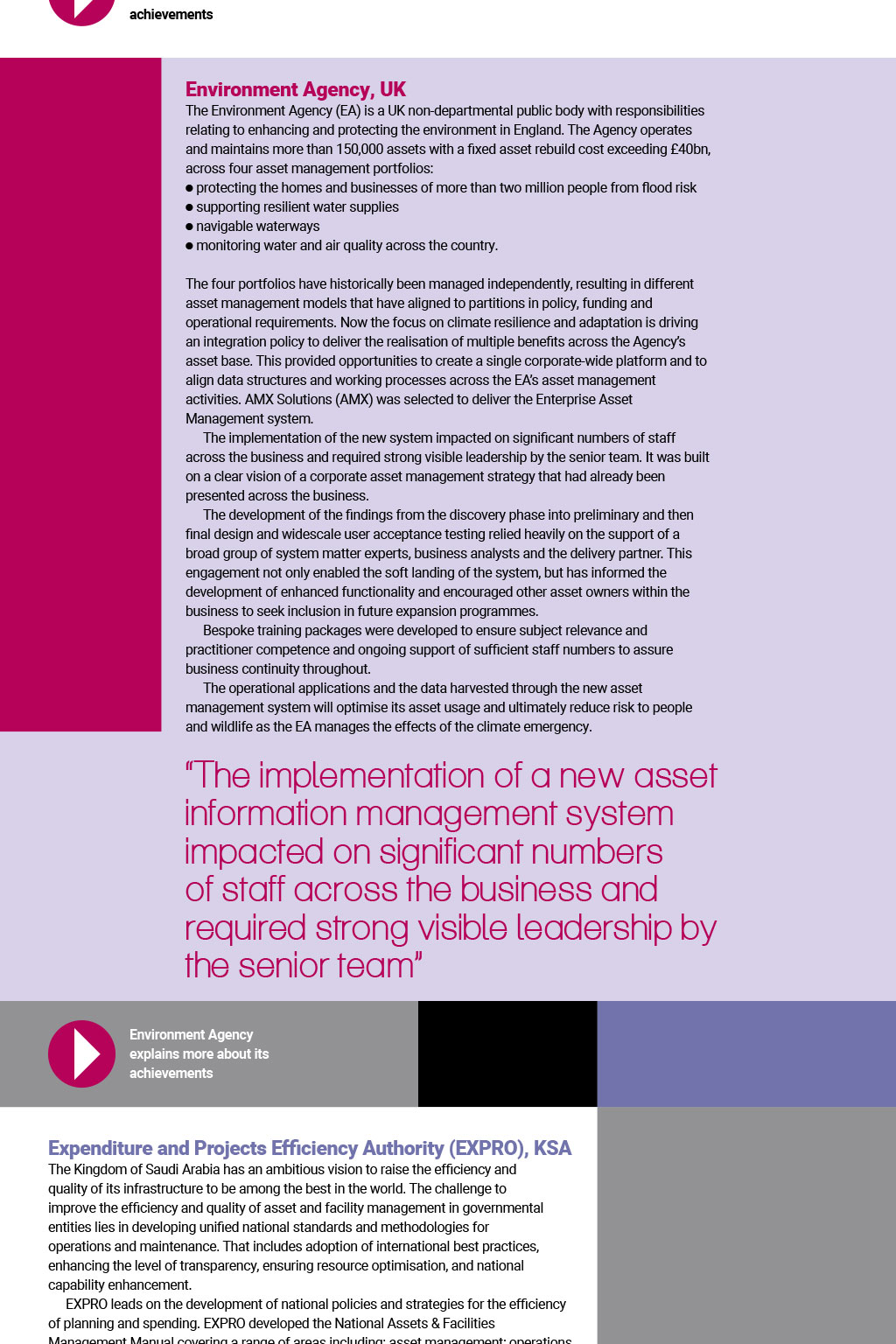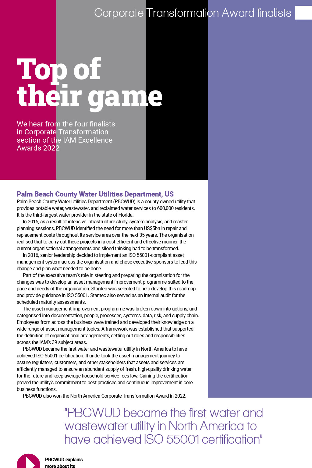 Top of their game We hear from the four finalists in Corporate Transformation section of the IAM Excellence Awards 2022 Palm Beach County Water Utilities Department, US Palm Beach County Water Utilities Department (PBCWUD) is a county-owned utility that provides potable water, wastewater, and reclaimed water services to 600,000 residents. It is the third-largest water provider in the state of Florida. In 2015, as a result of intensive infrastructure study, system analysis, and master planning sessions, PBCWUD identified the need for more than US$5bn in repair and replacement costs throughout its service area over the next 35 years. The organisation realised that to carry out these projects in a cost-efficient and effective manner, the current organisational arrangements and siloed thinking had to be transformed. In 2016, senior leadership decided to implement an ISO 55001-compliant asset management system across the organisation and chose executive sponsors to lead this change and plan what needed to be done. Part of the executive teams role in steering and preparing the organisation for the changes was to develop an asset management improvement programme suited to the pace and needs of the organisation. Stantec was selected to help develop this roadmap and provide guidance in ISO 55001. Stantec also served as an internal audit for the scheduled maturity assessments. The asset management improvement programme was broken down into actions, and categorised into documentation, people, processes, systems, data, risk, and supply chain. Employees from across the business were trained and developed their knowledge on a wide range of asset management topics. A framework was established that supported the definition of organisational arrangements, setting out roles and responsibilities across the IAMs 39 subject areas. PBCWUD became the first water and wastewater utility in North America to have achieved ISO 55001 certification. It undertook the asset management journey to assure regulators, customers, and other stakeholders that assets and services are efficiently managed to ensure an abundant supply of fresh, high-quality drinking water for the future and keep average household service fees low. Gaining the certification proved the utilitys commitment to best practices and continuous improvement in core business functions. PBCWUD also won the North America Corporate Transformation Award in 2022. PBCWUD became the first water and wastewater utility in North America to have achieved ISO 55001 certification PBCWUD explains more about its achievements Environment Agency, UK The Environment Agency (EA) is a UK non-departmental public body with responsibilities relating to enhancing and protecting the environment in England. The Agency operates and maintains more than 150,000 assets with a fixed asset rebuild cost exceeding 40bn, across four asset management portfolios: protecting the homes and businesses of more than two million people from flood risk supporting resilient water supplies navigable waterways monitoring water and air quality across the country. The four portfolios have historically been managed independently, resulting in different asset management models that have aligned to partitions in policy, funding and operational requirements. Now the focus on climate resilience and adaptation is driving an integration policy to deliver the realisation of multiple benefits across the Agencys asset base. This provided opportunities to create a single corporate-wide platform and to align data structures and working processes across the EAs asset management activities. AMX Solutions (AMX) was selected to deliver the Enterprise Asset Management system. The implementation of the new system impacted on significant numbers of staff across the business and required strong visible leadership by the senior team. It was built on a clear vision of a corporate asset management strategy that had already been presented across the business. The development of the findings from the discovery phase into preliminary and then final design and widescale user acceptance testing relied heavily on the support of a broad group of system matter experts, business analysts and the delivery partner. This engagement not only enabled the soft landing of the system, but has informed the development of enhanced functionality and encouraged other asset owners within the business to seek inclusion in future expansion programmes. Bespoke training packages were developed to ensure subject relevance and practitioner competence and ongoing support of sufficient staff numbers to assure business continuity throughout. The operational applications and the data harvested through the new asset management system will optimise its asset usage and ultimately reduce risk to people and wildlife as the EA manages the effects of the climate emergency. The implementation of a new asset information management system impacted on significant numbers of staff across the business and required strong visible leadership by the senior team Environment Agency explains more about its achievements Expenditure and Projects Efficiency Authority (EXPRO), KSA The Kingdom of Saudi Arabia has an ambitious vision to raise the efficiency and quality of its infrastructure to be among the best in the world. The challenge to improve the efficiency and quality of asset and facility management in governmental entities lies in developing unified national standards and methodologies for operations and maintenance. That includes adoption of international best practices, enhancing the level of transparency, ensuring resource optimisation, and national capability enhancement. EXPRO leads on the development of national policies and strategies for the efficiency of planning and spending. EXPRO developed the National Assets & Facilities Management Manual covering a range of areas including: asset management; operations and maintenance management; risk management; contracts man