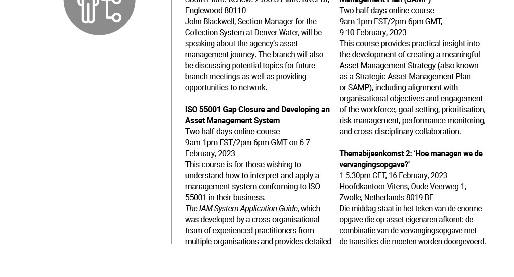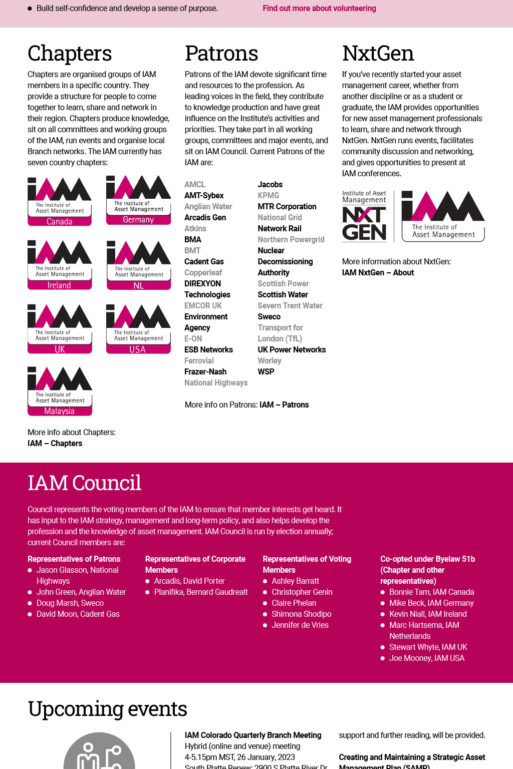 About the IAM Key information for members What we do The Institute of Asset Management (IAM) is the international professional body for asset management professionals. We develop knowledge and best practice, and generate awareness of the benefits of the discipline for individuals, organisations and wider society. We are a not-for-profit organisation with a global network of individuals in more than 65 countries and 51 business sectors. Membership Individual membership All members gain access to IAM resources and materials, as well as discounts on events and publications. Associate: open to any interested person Member: able to demonstrate knowledge and expertise; use of MIAM post-nominals Fellow: able to demonstrate superior responsibility as an expert practitioner; use of FIAM post-nominals. Corporate membership Corporate membership offers benefits to organisations of any size or sector gain access to resources and materials, and discounts on events and publications for all your company employees, whether they are individual members or not. Joining as a corporate member: Demonstrates commitment to asset management principles Gives you access to Endorsed Assessor and Endorsed Training schemes, and Provider accreditation schemes Priority access to project, sponsorship or other opportunities Directory listing. More information on membership Are you looking for a new opportunity? Volunteer with the IAM now! Become a volunteer at the IAM and reap the benefits for your career and your wellbeing. Network with others within the asset management community Improve your asset management knowledge Develop new skills ranging from event planning to writing skills and more Build self-confidence and develop a sense of purpose. We have opportunities to: Contribute to publications and guidance Join central committees and working groups Join Chapter and Branch committees Deliver webinars and events. Find out more about volunteering Chapters Patrons NxtGen Chapters are organised groups of IAM members in a specific country. They provide a structure for people to come together to learn, share and network in their region. Chapters produce knowledge, sit on all committees and working groups of the IAM, run events and organise local Branch networks. The IAM currently has seven country chapters: Patrons of the IAM devote significant time and resources to the profession. As leading voices in the field, they contribute to knowledge production and have great influence on the Institutes activities and priorities. They take part in all working groups, committees and major events, and sit on IAM Council. Current Patrons of the IAM are: If youve recently started your asset management career, whether from another discipline or as a student or graduate, the IAM provides opportunities for new asset management professionals to learn, share and network through NxtGen. NxtGen runs events, facilitates community discussion and networking, and gives opportunities to present at IAM conferences. AMCL AMT-Sybex Anglian Water Arcadis Gen Atkins BMA BMT Cadent Gas Copperleaf DIREXYON Technologies EMCOR UK Environment Agency E-ON ESB Networks Ferrovial Frazer-Nash National Highways Jacobs KPMG MTR Corporation National Grid Network Rail Northern Powergrid Nuclear Decomissioning Authority Scottish Power Scottish Water Severn Trent Water Sweco Transport for London (TfL) UK Power Networks Worley WSP More information about NxtGen: IAM NxtGen About More info on Patrons: IAM Patrons More info about Chapters: IAM Chapters IAM Council Council represents the voting members of the IAM to ensure that member interests get heard. It has input to the IAM strategy, management and long-term policy, and also helps develop the profession and the knowledge of asset management. IAM Council is run by election annually; current Council members are: Representatives of Patrons Jason Glasson, National Highways John Green, Anglian Water Doug Marsh, Sweco David Moon, Cadent Gas Representatives of Corporate Members Arcadis, David Porter Planifika, Bernard Gaudrealt Representatives of Voting Members Ashley Barratt Christopher Genin Claire Phelan Shimona Shodipo Jennifer de Vries Co-opted under Byelaw 51b (Chapter and other representatives) Bonnie Tam, IAM Canada Mike Beck, IAM Germany Kevin Niall, IAM Ireland Marc Hartsema, IAM Netherlands Stewart Whyte, IAM UK Joe Mooney, IAM USA Upcoming events IAM Colorado Quarterly Branch Meeting Hybrid (online and venue) meeting 4-5.15pm MST, 26 January, 2023 South Platte Renew: 2900 S Platte River Dr, Englewood 80110 John Blackwell, Section Manager for the Collection System at Denver Water, will be speaking about the agencys asset management journey. The branch will also be discussing potential topics for future branch meetings as well as providing opportunities to network. ISO 55001 Gap Closure and Developing an Asset Management System Two half-days online course 9am-1pm EST/2pm-6pm GMT on 6-7 February, 2023 This course is for those wishing to understand how to interpret and apply a management system conforming to ISO 55001 in their business. The IAM System Application Guide, which was developed by a cross-organisational team of experienced practitioners from multiple organisations and provides detailed support and further reading, will be provided. Creating and Maintaining a Strategic Asset Management Plan (SAMP) Two half-days online course 9am-1pm EST/2pm-6pm GMT, 9-10 February, 2023 This course provides practical insight into the development of creating a meaningful Asset Management Strategy (also known as a Strategic Asset Management Plan or SAMP), including alignment with organisational objectives and engagement of the workforce, goal-setting, prioritisation, risk management, performance monitoring, and cross-disciplinary collaboration. Themabijeenkomst 2: Hoe managen we de vervangingsopgave? 1-5.30pm CET, 16 February, 2023 Hoofdkantoor Vitens, Oude Veerweg 1, Zwolle, Netherlands 8019 BE Die middag staat in het teken 