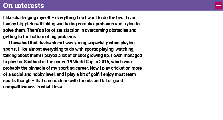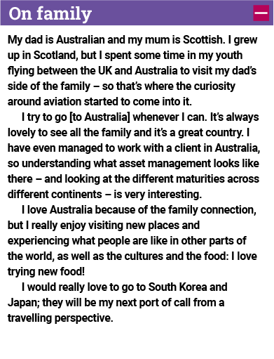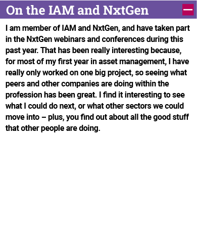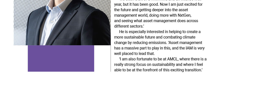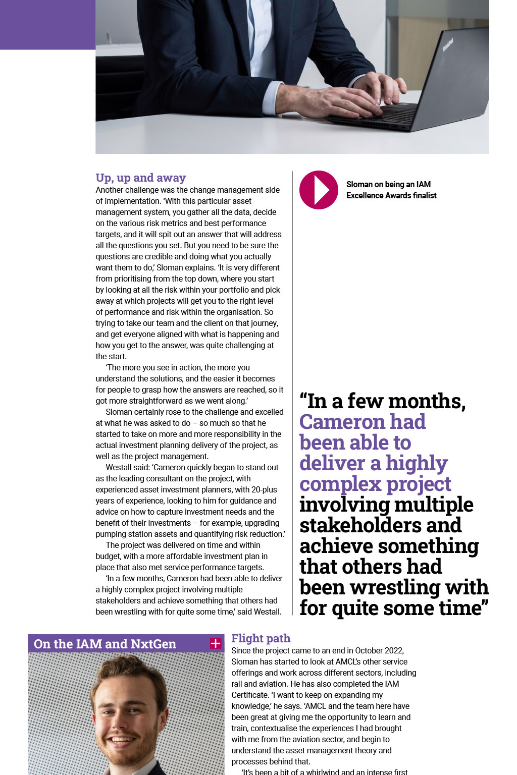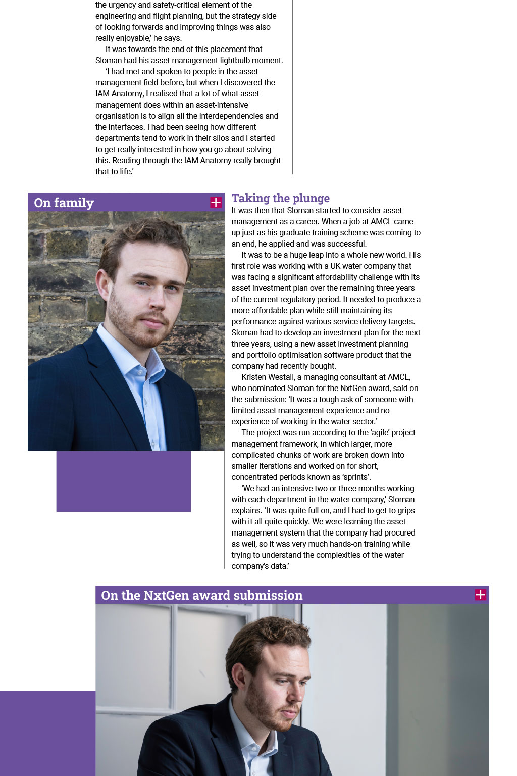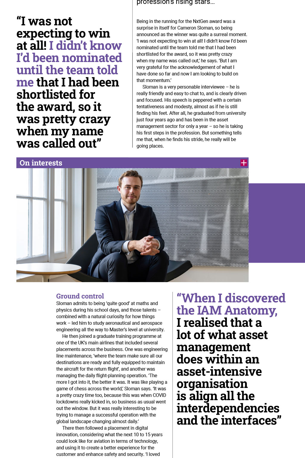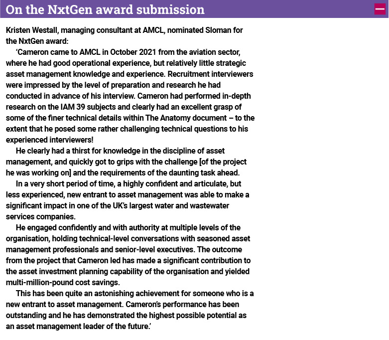 Profile Cameron Sloman won the NxtGen award last autumn, after being in the asset management profession for just 12 months. Louise Parfitt catches up with him to find out what he has been up to, and how it feels to be acknowledged as one of the professions rising stars I was not expecting to win at all! I didnt know Id been nominated until the team told me that I had been shortlisted for the award, so it was pretty crazy when my name was called out Being in the running for the NxtGen award was a surprise in itself for Cameron Sloman, so being announced as the winner was quite a surreal moment. I was not expecting to win at all! I didnt know Id been nominated until the team told me that I had been shortlisted for the award, so it was pretty crazy when my name was called out, he says. But I am very grateful for the acknowledgement of what I have done so far and now I am looking to build on that momentum. Sloman is a very personable interviewee he is really friendly and easy to chat to, and is clearly driven and focused. His speech is peppered with a certain tentativeness and modesty, almost as if he is still finding his feet. After all, he graduated from university just four years ago and has been in the asset management sector for only a year so he is taking his first steps in the profession. But something tells me that, when he finds his stride, he really will be going places. IAMinterests On involvement I like challenging myself everything I do I want to do the best I can. I enjoy big-picture thinking and taking complex problems and trying to solve them. Theres a lot of satisfaction in overcoming obstacles and getting to the bottom of big problems. I have had that desire since I was young, especially when playing sports. I like almost everything to do with sports: playing, watching, talking about them! I played a lot of cricket growing up; I even managed to play for Scotland at the under-19 World Cup in 2016, which was probably the pinnacle of my sporting career. Now I play cricket on more of a social and hobby level, and I play a bit of golf. I enjoy most team sports though that camaraderie with friends and bit of good competitiveness is what I love. Ground control Sloman admits to being quite good at maths and physics during his school days, and those talents combined with a natural curiosity for how things work led him to study aeronautical and aerospace engineering all the way to Masters level at university. He then joined a graduate training programme at one of the UKs main airlines that included several placements across the business. One was engineering line maintenance, where the team make sure all our destinations are ready and fully equipped to maintain the aircraft for the return flight, and another was managing the daily flight-planning operation. The more I got into it, the better it was. It was like playing a game of chess across the world, Sloman says. It was a pretty crazy time too, because this was when COVID lockdowns really kicked in, so business as usual went out the window. But it was really interesting to be trying to manage a successful operation with the global landscape changing almost daily. There then followed a placement in digital innovation, considering what the next 10 to 15 years could look like for aviation in terms of technology, and using it to create a better experience for the customer and enhance safety and security. I loved the urgency and safety-critical element of the engineering and flight planning, but the strategy side of looking forwards and improving things was also really enjoyable, he says. It was towards the end of this placement that Sloman had his asset management lightbulb moment. I had met and spoken to people in the asset management field before, but when I discovered the IAM Anatomy, I realised that a lot of what asset management does within an asset-intensive organisation is to align all the interdependencies and the interfaces. I had been seeing how different departments tend to work in their silos and I started to get really interested in how you go about solving this. Reading through the IAM Anatomy really brought that to life. When I discovered the IAM Anatomy, I realised that a lot of what asset management does within an asset-intensive organisation is align all the interdependencies and the interfaces Taking the plunge On family My dad is Australian and my mum is Scottish. I grew up in Scotland, but I spent some time in my youth flying between the UK and Australia to visit my dads side of the family so thats where the curiosity around aviation started to come into it. I try to go [to Australia] whenever I can. Its always lovely to see all the family and its a great country. I have even managed to work with a client in Australia, so understanding what asset management looks like there and looking at the different maturities across different continents is very interesting. I love Australia because of the family connection, but I really enjoy visiting new places and experiencing what people are like in other parts of the world, as well as the cultures and the food: I love trying new food! I would really love to go to South Korea and Japan; they will be my next port of call from a travelling perspective. It was then that Sloman started to consider asset management as a career. When a job at AMCL came up just as his graduate training scheme was coming to an end, he applied and was successful. It was to be a huge leap into a whole new world. His first role was working with a UK water company that was facing a significant affordability challenge with its asset investment plan over the remaining three years of the current regulatory period. It needed to produce a more affordable plan while still maintaining its performance against various service delivery targets. Sloman had to develop an investment plan for the next three years, using a new asset investment planning and portfolio optimisation software product that the company had re