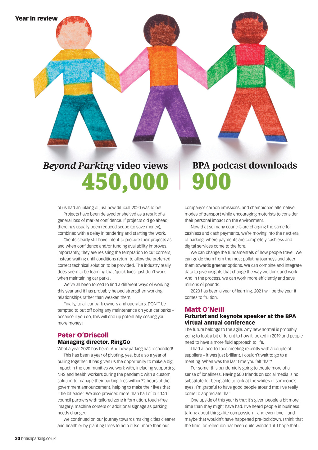 Year in review Beyond Parking video views 450,000 of us had an inkling of just how difficult 2020 was to be! Projects have been delayed or shelved as a result of a general loss of market confidence. If projects did go ahead, there has usually been reduced scope (to save money), combined with a delay in tendering and starting the work. Clients clearly still have intent to procure their projects as and when confidence and/or funding availability improves. Importantly, they are resisting the temptation to cut corners, instead waiting until conditions return to allow the preferred correct technical solution to be provided. The industry really does seem to be learning that quick fixes just dont work when maintaining car parks. Weve all been forced to find a different ways of working this year and it has probably helped strengthen working relationships rather than weaken them. Finally, to all car park owners and operators: DONT be tempted to put off doing any maintenance on your car parks because if you do, this will end up potentially costing you more money! Peter ODriscoll Managing director, RingGo What a year 2020 has been. And how parking has responded! This has been a year of pivoting, yes, but also a year of pulling together. It has given us the opportunity to make a big impact in the communities we work with, including supporting NHS and health workers during the pandemic with a custom solution to manage their parking fees within 72 hours of the government announcement, helping to make their lives that little bit easier. We also provided more than half of our 140 council partners with tailored zone information, touch-free imagery, machine corsets or additional signage as parking needs changed. We continued on our journey towards making cities cleaner and healthier by planting trees to help offset more than our BPA podcast downloads 900 companys carbon emissions, and championed alternative modes of transport while encouraging motorists to consider their personal impact on the environment. Now that so many councils are charging the same for cashless and cash payments, were moving into the next era of parking, where payments are completely cashless and digital services come to the fore. We can change the fundamentals of how people travel. We can guide them from the most polluting journeys and steer them towards greener options. We can combine and integrate data to give insights that change the way we think and work. And in the process, we can work more efficiently and save millions of pounds. 2020 has been a year of learning. 2021 will be the year it comes to fruition. Matt ONeill Futurist and keynote speaker at the BPA virtual annual conference The future belongs to the agile. Any new normal is probably going to look a bit different to how it looked in 2019 and people need to have a more fluid approach to life. I had a face-to-face meeting recently with a couple of suppliers it was just brilliant. I couldnt wait to go to a meeting. When was the last time you felt that? For some, this pandemic is going to create more of a sense of loneliness. Having 500 friends on social media is no substitute for being able to look at the whites of someones eyes. Im grateful to have good people around me: Ive really come to appreciate that. One upside of this year is that its given people a bit more time than they might have had. Ive heard people in business talking about things like compassion and even love and maybe that wouldnt have happened pre-lockdown. I think that the time for reflection has been quite wonderful. I hope that if 20 britishparking.co.uk PN Dec 2020 pp18-23 Review V3.indd 20 23/11/2020 16:06