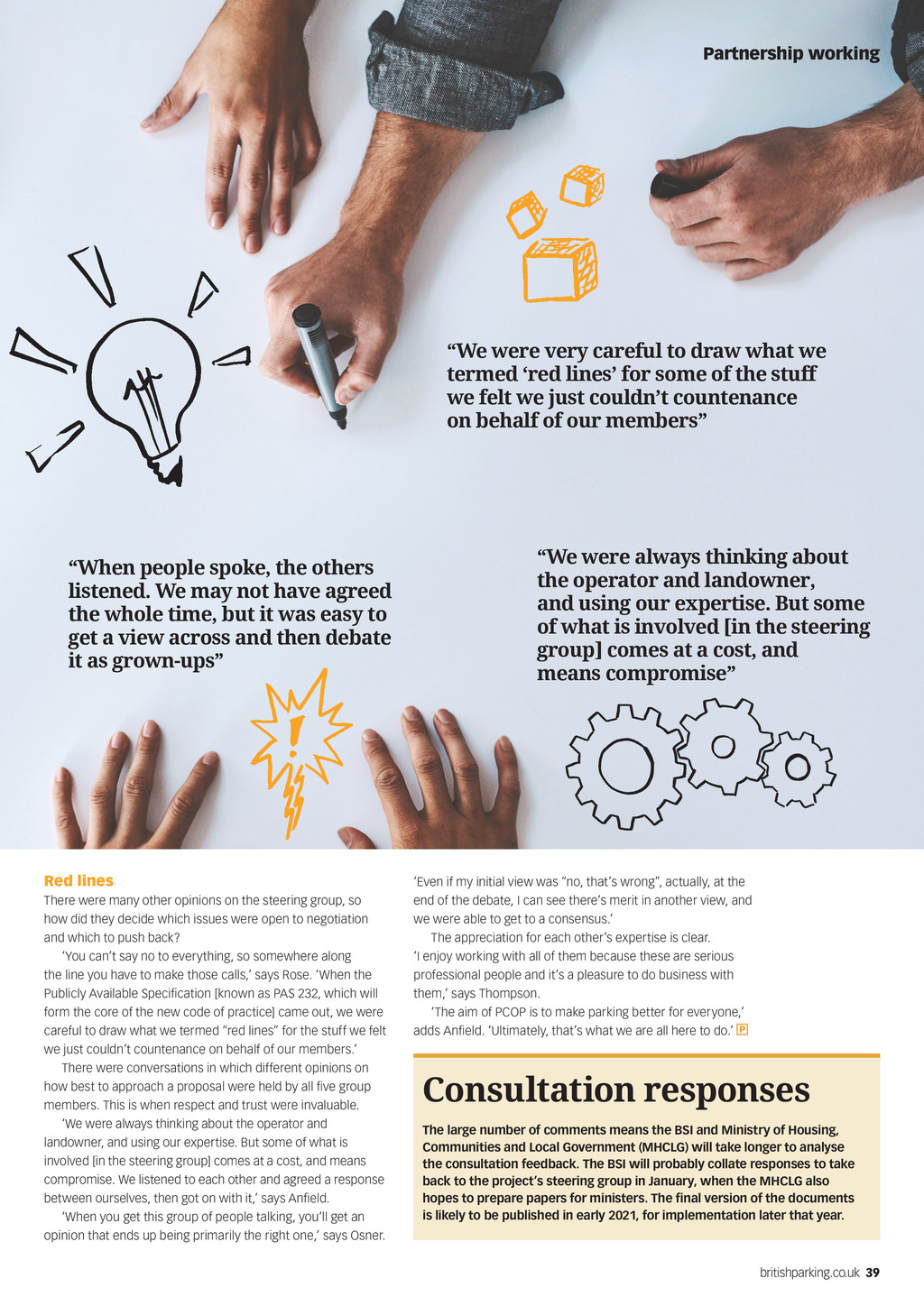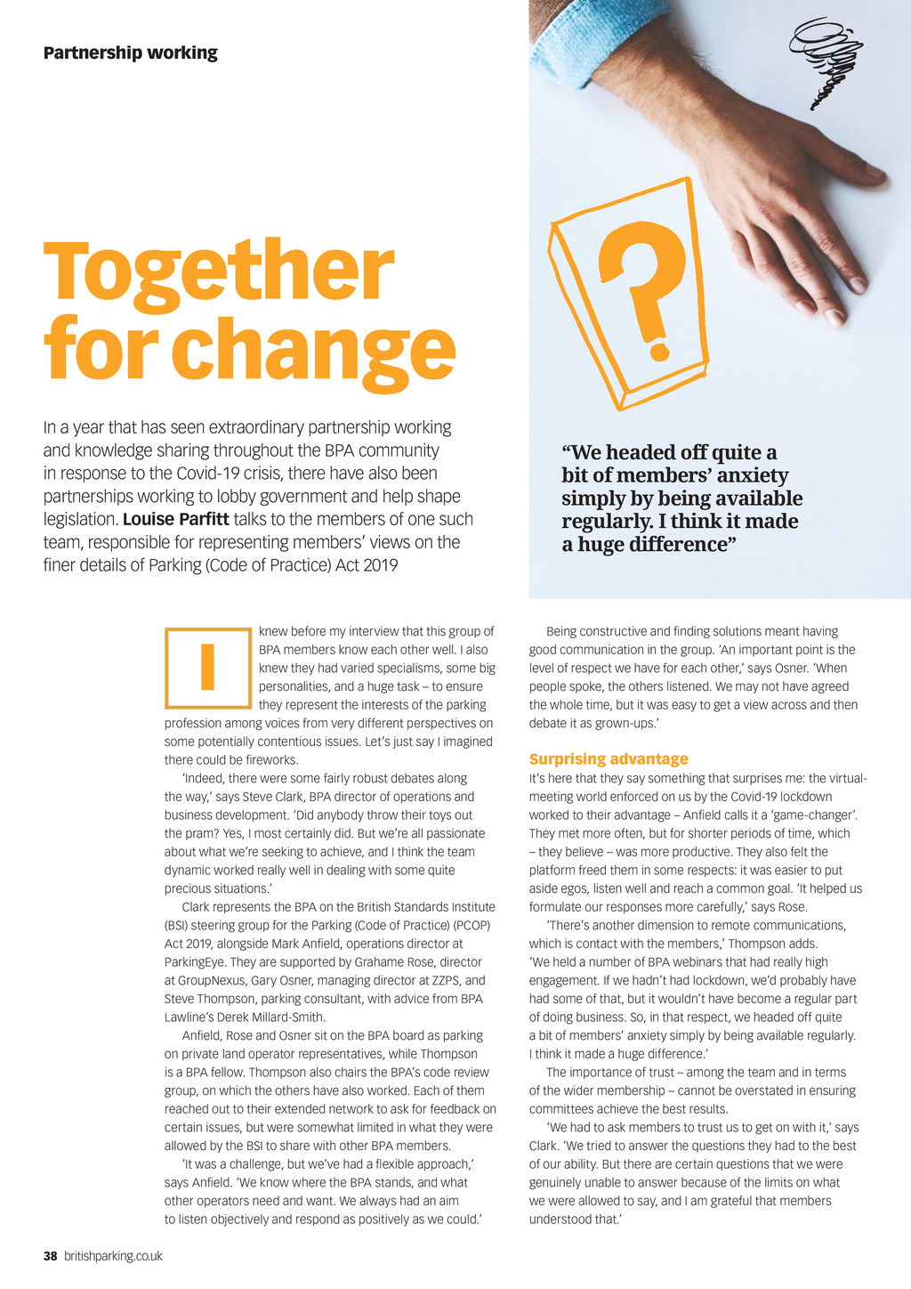 Partnership working Together for change In a year that has seen extraordinary partnership working and knowledge sharing throughout the BPA community in response to the Covid-19 crisis, there have also been partnerships working to lobby government and help shape legislation. Louise Parfitt talks to the members of one such team, responsible for representing members views on the finer details of Parking (Code of Practice) Act 2019 knew before my interview that this group of BPA members know each other well. I also knew they had varied specialisms, some big personalities, and a huge task to ensure they represent the interests of the parking profession among voices from very different perspectives on some potentially contentious issues. Lets just say I imagined there could be fireworks. Indeed, there were some fairly robust debates along the way, says Steve Clark, BPA director of operations and business development. Did anybody throw their toys out the pram? Yes, I most certainly did. But were all passionate about what were seeking to achieve, and I think the team dynamic worked really well in dealing with some quite precious situations. Clark represents the BPA on the British Standards Institute (BSI) steering group for the Parking (Code of Practice) (PCOP) Act 2019, alongside Mark Anfield, operations director at ParkingEye. They are supported by Grahame Rose, director at GroupNexus, Gary Osner, managing director at ZZPS, and Steve Thompson, parking consultant, with advice from BPA Lawlines Derek Millard-Smith. Anfield, Rose and Osner sit on the BPA board as parking on private land operator representatives, while Thompson is a BPA fellow. Thompson also chairs the BPAs code review group, on which the others have also worked. Each of them reached out to their extended network to ask for feedback on certain issues, but were somewhat limited in what they were allowed by the BSI to share with other BPA members. It was a challenge, but weve had a flexible approach, says Anfield. We know where the BPA stands, and what other operators need and want. We always had an aim to listen objectively and respond as positively as we could. I We headed off quite a bit of members anxiety simply by being available regularly. I think it made a huge difference Being constructive and finding solutions meant having good communication in the group. An important point is the level of respect we have for each other, says Osner. When people spoke, the others listened. We may not have agreed the whole time, but it was easy to get a view across and then debate it as grown-ups. Surprising advantage Its here that they say something that surprises me: the virtualmeeting world enforced on us by the Covid-19 lockdown worked to their advantage Anfield calls it a game-changer. They met more often, but for shorter periods of time, which they believe was more productive. They also felt the platform freed them in some respects: it was easier to put aside egos, listen well and reach a common goal. It helped us formulate our responses more carefully, says Rose. Theres another dimension to remote communications, which is contact with the members, Thompson adds. We held a number of BPA webinars that had really high engagement. If we hadnt had lockdown, wed probably have had some of that, but it wouldnt have become a regular part of doing business. So, in that respect, we headed off quite a bit of members anxiety simply by being available regularly. I think it made a huge difference. The importance of trust among the team and in terms of the wider membership cannot be overstated in ensuring committees achieve the best results. We had to ask members to trust us to get on with it, says Clark. We tried to answer the questions they had to the best of our ability. But there are certain questions that we were genuinely unable to answer because of the limits on what we were allowed to say, and I am grateful that members understood that. 38 britishparking.co.uk PN Dec 2020 pp38-39 PCOP.indd 38 23/11/2020 16:15