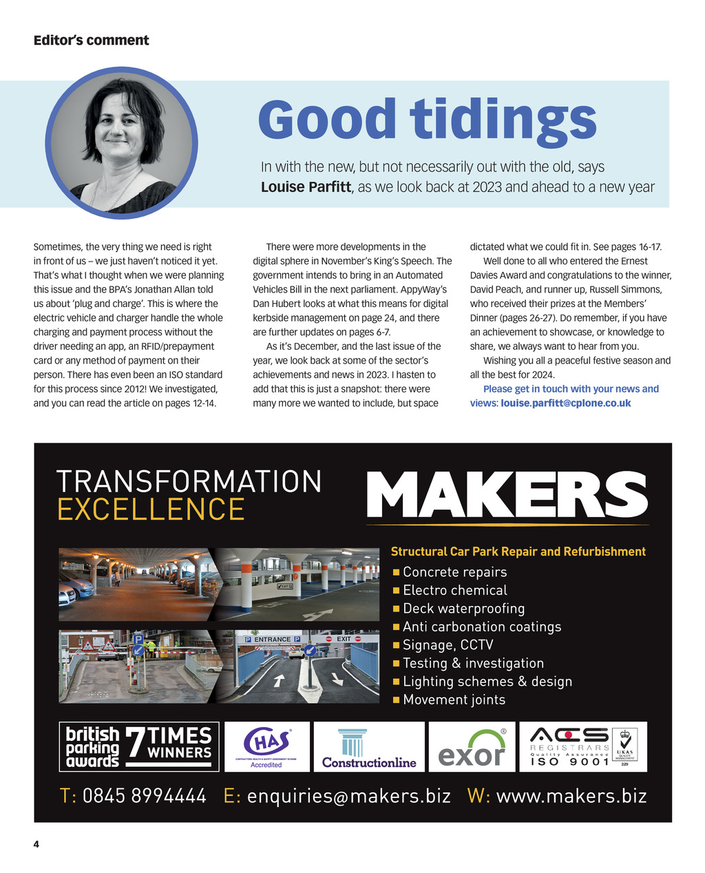 Contents Upfront 03 Out of the maelstrom John McArdle on how this tumultuous year has presented us with the opportunity to embrace change 07 Editors column Louise Parfitt and Caron Fassetta on putting together their favourite magazine News 08 National news 10 Companies news 46 BPA news Features 14 From hero to zero Sarah Juggins investigates the shifting public perceptions of parking, from mostly hated to an essential service, and everything in between 18 A year of pain... and gain BPA members share their experiences of a highly unusual 12 months 25 Moving mountains Keltic Clothing has had to adapt its range at a speed unknown in its 20-year history December 2020 Issue 403 28 Christmas, the challenge How are parking operators preparing for a very different festive season? 30 Business lifeline BPA Lawline looks at what the extended furlough scheme means for you 32 Battery power How one company has gone from idea to reality in less than 12 months to change the UK electric vehicle industry 34 A helping hand Parkings role in a groundbreaking initiative to support those on the streets get back into work 36 Calendar guy Louise Parfitt meets the man on a mission to big up our car parks 38 Together for change The team working on behalf of members on the Parking (Code of Practice) Act share how they have handled some tricky negotiations 44 Founding members In the BPAs 50th anniversary year, we remember some of the members who helped make it what it is today Regulars 48 Design for life A view of the BPAs recent campaigns and initiatives and the importance of good design in achieving buy-in, agreement and success 51 Park life Kelvin Reynolds is feeling grateful for what has been achieved in a year like no other in the BPAs history Classified 53 Specialist services directory 54 Marketplace 40 Partnership power The University of Sussexs Science Policy Research Unit explains more about its work with the BPA, and what it means for the parking sector 42 Moving forwards Exciting next steps for the Women in Parking initiative 4 britishparking.co.uk PN Dec 2020 pp04-05 Contents.indd 4 23/11/2020 16:58