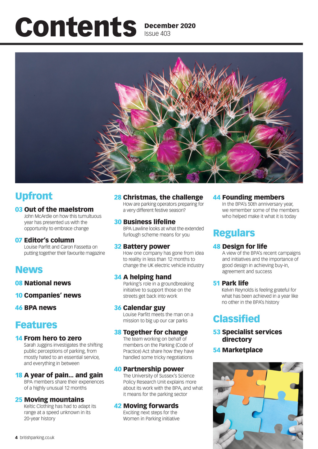 Contents Upfront 03 Out of the maelstrom John McArdle on how this tumultuous year has presented us with the opportunity to embrace change 07 Editors column Louise Parfitt and Caron Fassetta on putting together their favourite magazine News 08 National news 10 Companies news 46 BPA news Features 14 From hero to zero Sarah Juggins investigates the shifting public perceptions of parking, from mostly hated to an essential service, and everything in between 18 A year of pain... and gain BPA members share their experiences of a highly unusual 12 months 25 Moving mountains Keltic Clothing has had to adapt its range at a speed unknown in its 20-year history December 2020 Issue 403 28 Christmas, the challenge How are parking operators preparing for a very different festive season? 30 Business lifeline BPA Lawline looks at what the extended furlough scheme means for you 32 Battery power How one company has gone from idea to reality in less than 12 months to change the UK electric vehicle industry 34 A helping hand Parkings role in a groundbreaking initiative to support those on the streets get back into work 36 Calendar guy Louise Parfitt meets the man on a mission to big up our car parks 38 Together for change The team working on behalf of members on the Parking (Code of Practice) Act share how they have handled some tricky negotiations 44 Founding members In the BPAs 50th anniversary year, we remember some of the members who helped make it what it is today Regulars 48 Design for life A view of the BPAs recent campaigns and initiatives and the importance of good design in achieving buy-in, agreement and success 51 Park life Kelvin Reynolds is feeling grateful for what has been achieved in a year like no other in the BPAs history Classified 53 Specialist services directory 54 Marketplace 40 Partnership power The University of Sussexs Science Policy Research Unit explains more about its work with the BPA, and what it means for the parking sector 42 Moving forwards Exciting next steps for the Women in Parking initiative 4 britishparking.co.uk PN Dec 2020 pp04-05 Contents.indd 4 23/11/2020 16:58
