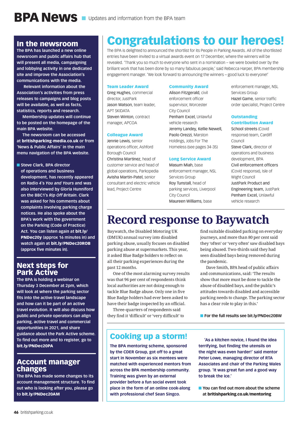 BPA News Updates and information from the BPA team In the newsroom The BPA has launched a new online newsroom and public affairs hub that will present all media, campaigning and lobbying activity in one dedicated site and improve the Associations communications with the media. Relevant information about the Associations activities from press releases to campaigns and blog posts will be available, as well as facts, statistics, reports and research. Membership updates will continue to be posted on the homepage of the main BPA website. The newsroom can be accessed at britishparking-media.co.uk or from News & Public Affairs in the main menu navigation of the BPA website. Steve Clark, BPA director of operations and business development, has recently appeared on Radio 4s You and Yours and was also interviewed by Gloria Hunniford on the BBC1s Rip Off Britain. Clark was asked for his comments about complaints involving parking charge notices. He also spoke about the BPAs work with the government on the Parking (Code of Practice) Act. You can listen again at bit.ly/ PNDec20y (approx 16 minutes in) and watch again at bit.ly/PNDec20ROB (approx five minutes in). Next steps for Park Active The BPA is holding a webinar on Thursday 3 December at 2pm, which will look at where the parking sector fits into the active travel landscape and how can it be part of an active travel evolution. It will also discuss how public and private operators can align parking, active travel and commercial opportunities in 2021, and share guidance about the Park Active scheme. To find out more and to register, go to bit.ly/PNDec20PA Account manager changes The BPA has made some changes to its account management structure. To find out who is looking after you, please go to bit.ly/PNDec20AM Congratulations to our heroes! The BPA is delighted to announced the shortlist for its People in Parking Awards. All of the shortlisted entries have been invited to a virtual awards event on 17 December, where the winners will be revealed. Thank you so much to everyone who sent in a nomination we were bowled over by the brilliant work that has been done by so many fabulous people, said Rebecca Harper, BPA membership engagement manager. We look forward to announcing the winners good luck to everyone! Team Leader Award Greg Hughes, commercial director, JustPark Jason Watson, team leader, APT SKIDATA Steven Winton, contract manager, APCOA Colleague Award Jennie Lewis, senior operations officer, Ashford Borough Council Christina Martinez, head of customer service and head of global operations, Parkopedia Avisha Martin-Patel, senior consultant and electric vehicle lead, Project Centre Community Award Alison Fitzgerald, civil enforcement officer supervisor, Worcester City Council Penham Excel, Unlawful vehicle research Jeremy Landey, Kellie Newell, Paolo Orezzi, Marston Holdings, Jobs For The Homeless (see pages 34-35) Long Service Award Masum Miah, base enforcement manager, NSL Services Group Roy Tunstall, head of parking services, Liverpool City Council Maureen Williams, base enforcement manager, NSL Services Group Hazel Game, senior traffic order specialist, Project Centre Outstanding Contribution Award School streets (Covid response) team, Cardiff Council Steve Clark, director of operations and business development, BPA Civil enforcement officers (Covid response), Isle of Wight Council JustPark Product and Engineering team, JustPark Penham Excel, Unlawful vehicle research Record response to Baywatch Baywatch, the Disabled Motoring UK (DMUK) annual survey into disabled parking abuse, usually focuses on disabled parking abuse at supermarkets. This year, it asked Blue Badge holders to reect on all their parking experiences during the past 12 months. One of the most alarming survey results was that 96 per cent of respondents think local authorities are not doing enough to tackle Blue Badge abuse. Only one in ve Blue Badge holders had ever been asked to have their badge inspected by an ocial. Three-quarters of respondents said they nd it dicult or very dicult to Cooking up a storm! The BPA mentoring scheme, sponsored by the CDER Group, got off to a great start in November as six mentees were matched with experienced mentors from across the BPA membership community. Training was given by an external provider before a fun social event took place in the form of an online cook-along with professional chef Sean Singco. nd suitable disabled parking on everyday journeys, and more than 80 per cent said they often or very often saw disabled bays being abused. Two-thirds said they had seen disabled bays being removed during the pandemic. Dave Smith, BPA head of public aairs and communications, said: The results show that more must be done to tackle the abuse of disabled bays, and the publics attitudes towards disabled and accessible parking needs to change. The parking sector has a clear role to play in this. For the full results see bit.ly/PNDec20BW As a kitchen novice, I found the idea terrifying, but finding the utensils on the night was even harder! said mentor Peter Lowe, managing director of RTA Associates and chair of the Parking Wales group. It was great fun and a good way to break the ice. You can find out more about the scheme at britishparking.co.uk/mentoring 46 britishparking.co.uk PN Dec 2020 pp46-47 BPA News.indd 46 23/11/2020 16:25 CDER