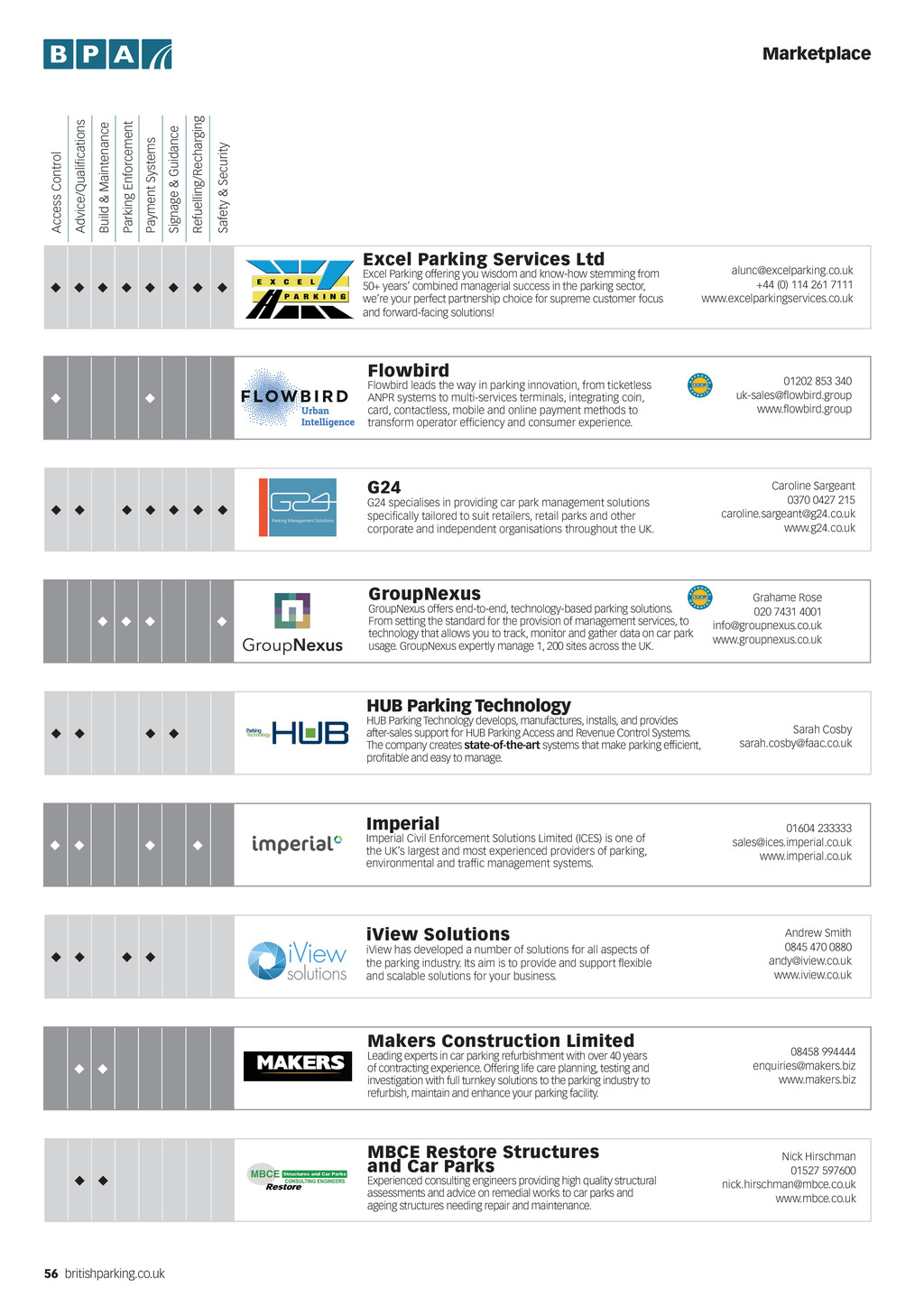 Safety & Security Refuelling/Recharging Signage & Guidance Payment Systems Parking Enforcement Build & Maintenance Advice/Qualifications Access Control Marketplace Excel Parking Services Ltd u u u u u u u u Excel Parking offering you wisdom and know-how stemming from 50+ years combined managerial success in the parking sector, were your perfect partnership choice for supreme customer focus and forward-facing solutions! Flowbird u Flowbird leads the way in parking innovation, from ticketless ANPR systems to multi-services terminals, integrating coin, card, contactless, mobile and online payment methods to transform operator efficiency and consumer experience. u G24 u u u u u u u G24 specialises in providing car park management solutions specifically tailored to suit retailers, retail parks and other corporate and independent organisations throughout the UK. GroupNexus u u u u GroupNexus offers end-to-end, technology-based parking solutions. From setting the standard for the provision of management services, to technology that allows you to track, monitor and gather data on car park usage. GroupNexus expertly manage 1, 200 sites across the UK. alunc@excelparking.co.uk +44 (0) 114 261 7111 www.excelparkingservices.co.uk 01202 853 340 uk-sales@flowbird.group www.flowbird.group Caroline Sargeant 0370 0427 215 caroline.sargeant@g24.co.uk www.g24.co.uk Grahame Rose 020 7431 4001 info@groupnexus.co.uk www.groupnexus.co.uk HUB Parking Technology u u u u u u u HUB Parking Technology develops, manufactures, installs, and provides after-sales support for HUB Parking Access and Revenue Control Systems. The company creates state-of-the-art systems that make parking efficient, profitable and easy to manage. Imperial u Imperial Civil Enforcement Solutions Limited (ICES) is one of the UKs largest and most experienced providers of parking, environmental and traffic management systems. iView Solutions u u u u iView has developed a number of solutions for all aspects of the parking industry. Its aim is to provide and support flexible and scalable solutions for your business. Makers Construction Limited u u u u Leading experts in car parking refurbishment with over 40 years of contracting experience. Offering life care planning, testing and investigation with full turnkey solutions to the parking industry to refurbish, maintain and enhance your parking facility. MBCE Restore Structures and Car Parks Experienced consulting engineers providing high quality structural assessments and advice on remedial works to car parks and ageing structures needing repair and maintenance. Sarah Cosby sarah.cosby@faac.co.uk 01604 233333 sales@ices.imperial.co.uk www.imperial.co.uk Andrew Smith 0845 470 0880 andy@iview.co.uk www.iview.co.uk 08458 994444 enquiries@makers.biz www.makers.biz Nick Hirschman 01527 597600 nick.hirschman@mbce.co.uk www.mbce.co.uk 56 britishparking.co.uk PN Dec 2020 pp54-59 Marketplace.indd 56 23/11/2020 13:34