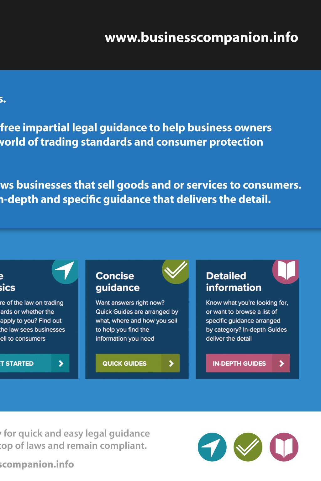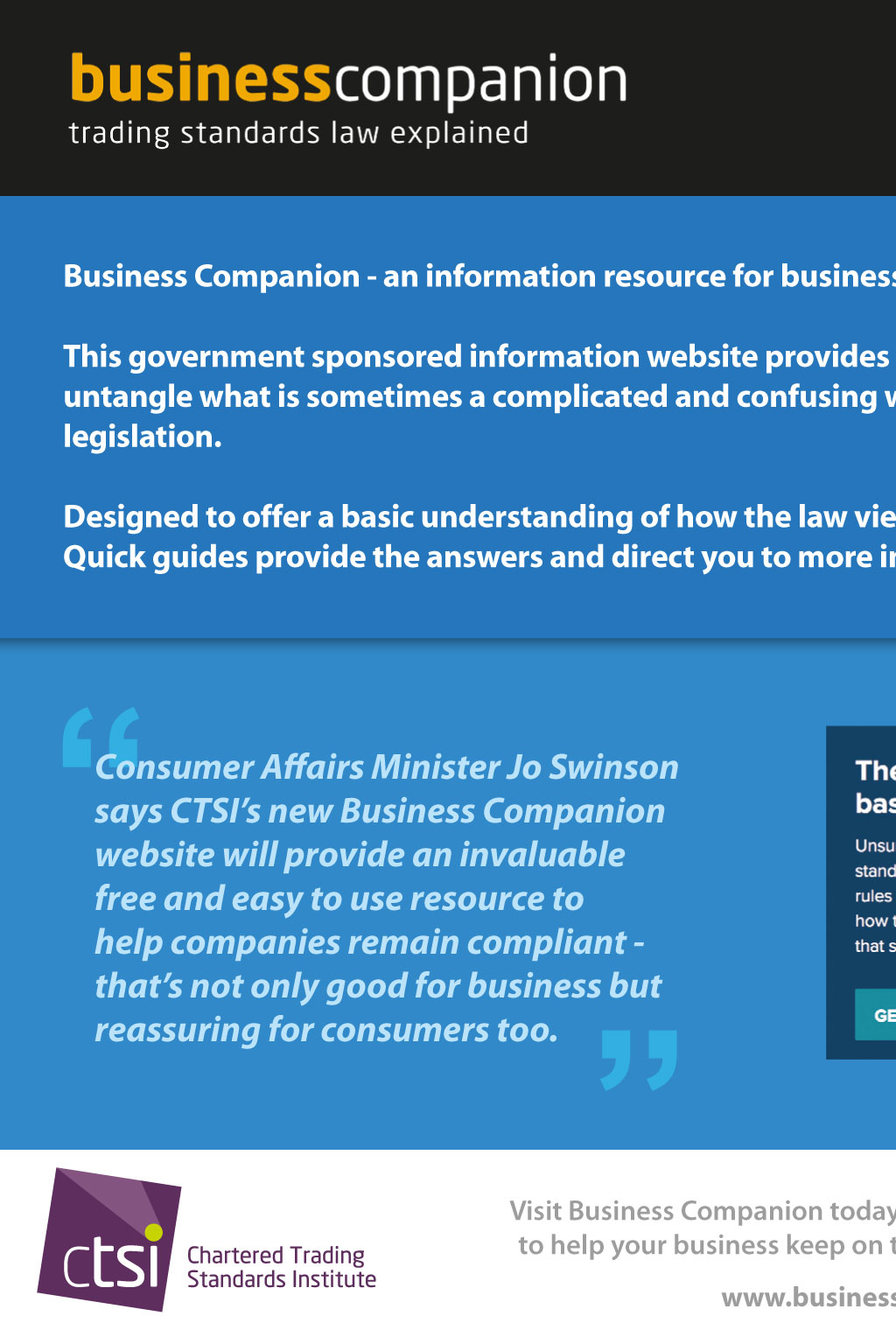 www.businesscompanion.info Business Companion - an information resource for business. This government sponsored information website provides free impartial legal guidance to help business owners untangle what is sometimes a complicated and confusing world of trading standards and consumer protection legislation. Designed to offer a basic understanding of how the law views businesses that sell goods and or services to consumers. Quick guides provide the answers and direct you to more in-depth and specific guidance that delivers the detail. Consumer Affairs Minister Jo Swinson says CTSIs new Business Companion website will provide an invaluable free and easy to use resource to help companies remain compliant thats not only good for business but reassuring for consumers too. Visit Business Companion today for quick and easy legal guidance to help your business keep on top of laws and remain compliant. www.businesscompanion.info