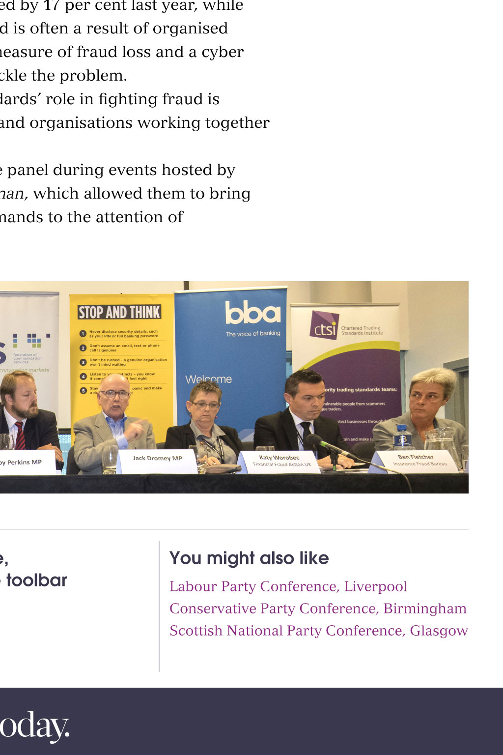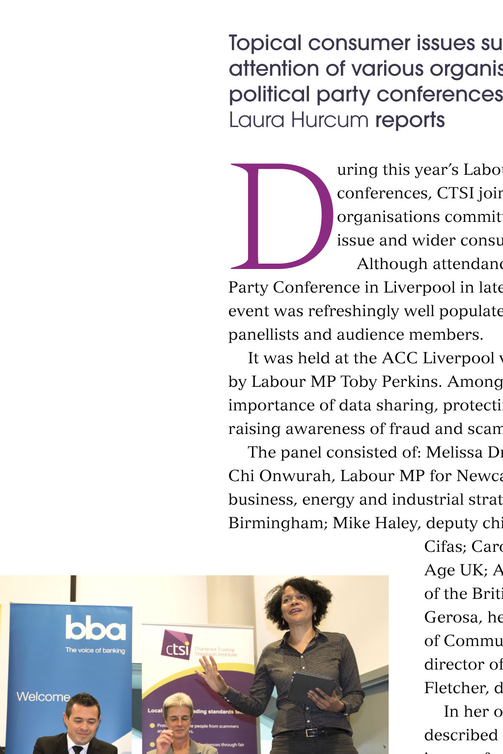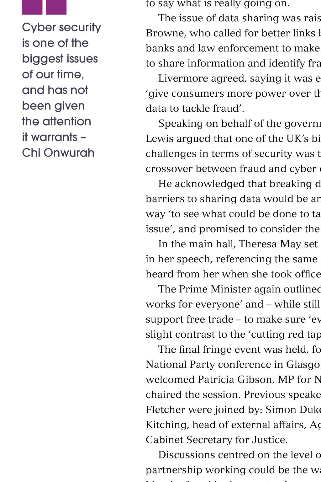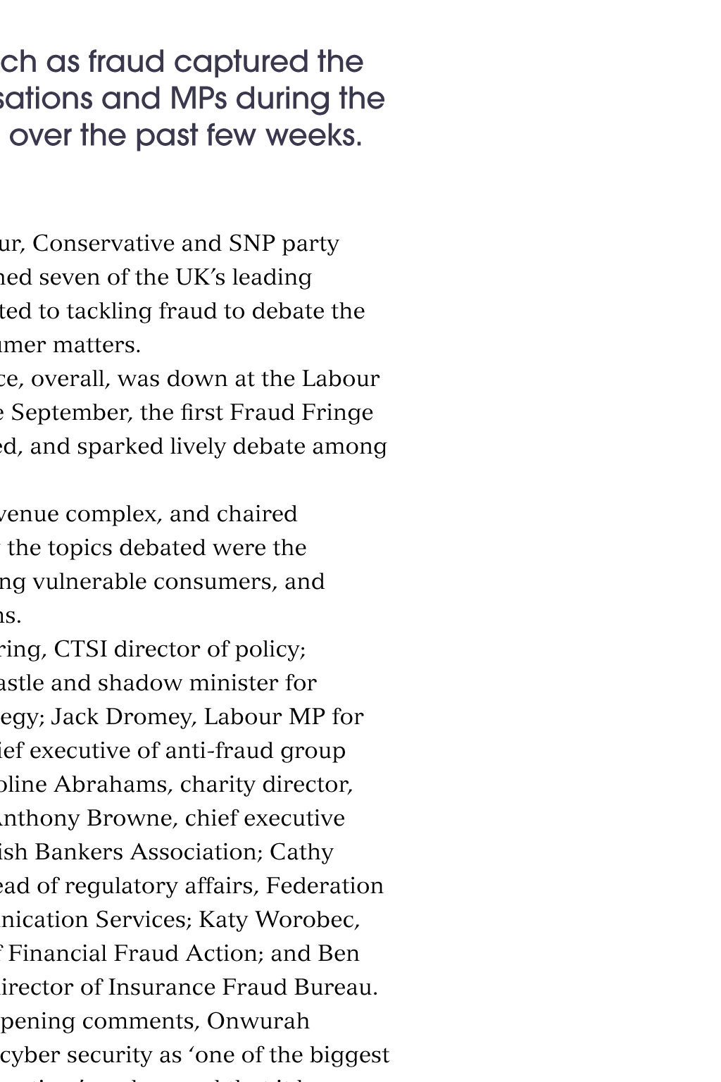 Political party conferences 2016 In this feature l data sharing l cyber security l insurance fraud Fraud in the hot seat Topical consumer issues such as fraud captured the attention of various organisations and MPs during the political party conferences over the past few weeks. laura Hurcum reports D Cyber security is one of the biggest issues of our time, and has not been given the attention it warrants Chi Onwurah uring this years Labour, Conservative and SNP party conferences, CTSI joined seven of the UKs leading organisations committed to tackling fraud to debate the issue and wider consumer matters. Although attendance, overall, was down at the Labour Party Conference in Liverpool in late September, the first Fraud Fringe event was refreshingly well populated, and sparked lively debate among panellists and audience members. It was held at the ACC Liverpool venue complex, and chaired by Labour MP Toby Perkins. Among the topics debated were the importance of data sharing, protecting vulnerable consumers, and raising awareness of fraud and scams. The panel consisted of: Melissa Dring, CTSI director of policy; Chi Onwurah, Labour MP for Newcastle and shadow minister for business, energy and industrial strategy; Jack Dromey, Labour MP for Birmingham; Mike Haley, deputy chief executive of anti-fraud group Cifas; Caroline Abrahams, charity director, Age UK; Anthony Browne, chief executive of the British Bankers Association; Cathy Gerosa, head of regulatory affairs, Federation of Communication Services; Katy Worobec, director of Financial Fraud Action; and Ben Fletcher, director of Insurance Fraud Bureau. In her opening comments, Onwurah described cyber security as one of the biggest issues of our time, and argued that it has not been given the attention it warrants. She added that only a miniscule proportion of funds [had been] set aside to deal with crime online, despite its wide-ranging impact on businesses and individuals. Dring argued that the role of trading standards in tackling this criminality was poorly understood. She called for greater recognition of the professions role, and forcloser working with the police and otherbodies involved in fraud detection andinvestigation. Fletcher said there was a misconception among members of the public that insurance fraud was largely harmless and conducted by individuals, when in reality it was incredibly harmful and often perpetrated by organised criminals. He said sharing data is one of our best weapons to take the fight back to fraudsters. A week later and it was the turn of the Conservatives party conference, in Birmingham, to bring the issue of fraud to the top of theagenda. Browne, Worobec and Fletcher were again on the panel, and they were joined by: Leon Livermore, CTSI chief executive; Simon Fell, assistant director of engagement, Cifas; Jane Vass, director of policy and research at Age UK; Chris Pateman, chief executive of Federation of Communication Services; and Brandon Lewis MP, minister for policing. During the debate there was a clear desire to change the language used when talking about scams to make it more universally understandable Livermore insisted we need to say what is really going on. The issue of data sharing was raised by Browne, who called for better links between banks and law enforcement to make it easier to share information and identify fraud. Livermore agreed, saying it was essential to give consumers more power over their own data to tackle fraud. Speaking on behalf of the government, Lewis argued that one of the UKs biggest challenges in terms of security was the crossover between fraud and cyber crime. He acknowledged that breaking down barriers to sharing data would be an effective way to see what could be done to tackle the issue, and promised to consider the idea of a data-sharing facility. In the main hall, Theresa May set out her Brexit timetable and vision in her speech, referencing the same peoples party rhetoric we first heard from her when she took office. The Prime Minister again outlined her desire for an economy that works for everyone and while still wanting to encourage business and support free trade to make sure everyone plays by the same rules, in slight contrast to the cutting red tape mantra we have heard before. The final fringe event was held, for the first time, at the Scottish National Party conference in Glasgow and the CTSI policy team welcomed Patricia Gibson, MP for North Ayrshire and Arran, who chaired the session. Previous speakers Pateman, Worobec, Dring and Fletcher were joined by: Simon Dukes, chief executive of Cifas; Angela Kitching, head of external affairs, Age UK; and Michael Matheson MSP, Cabinet Secretary for Justice. Discussions centred on the level of fraud in Scotland and how partnership working could be the way to tackle it. Dukes noted that identity fraud in the country increased by 17 per cent last year, while keynote speaker Matheson said fraud is often a result of organised crime. Dukes suggested a national measure of fraud loss and a cyber life-skills strategy were needed to tackle the problem. According to Dring, trading standards role in fighting fraud is understated; a focus on resources and organisations working together she added, is key. Senior CTSI staff were also on the panel during events hosted by Citizens Advice and the New Statesman, which allowed them to bring some of the institutes key policy demands to the attention of government and stakeholders. Credits Laura Hurcum, CTSI communications. Images: Andrew Wiard To share this page, in the toolbar click on You might also like Labour Party Conference, Liverpool Conservatives party conference, Birmingham Scottish National Party Conference, Glasgow