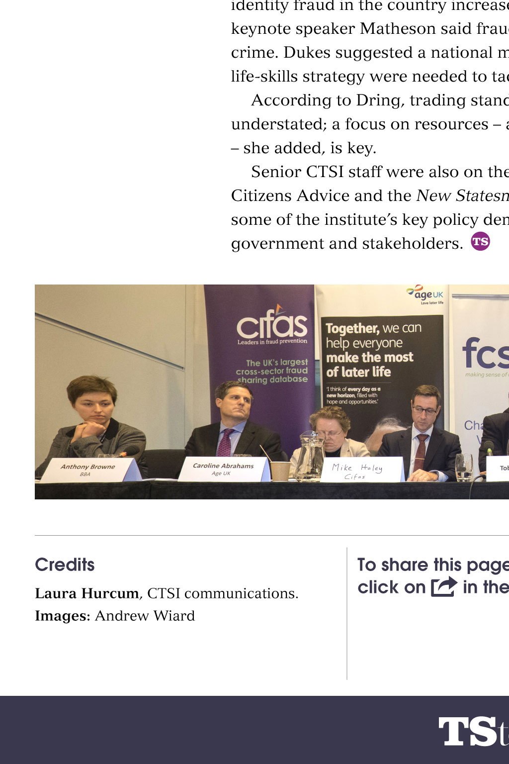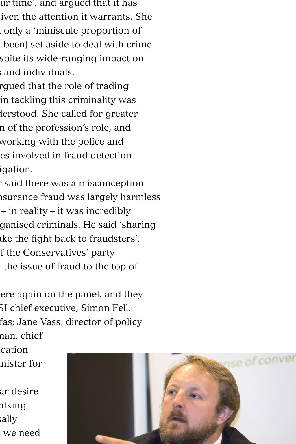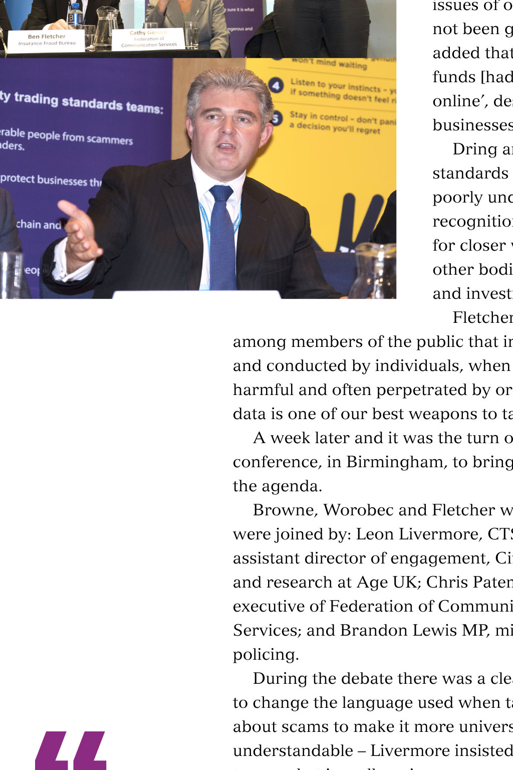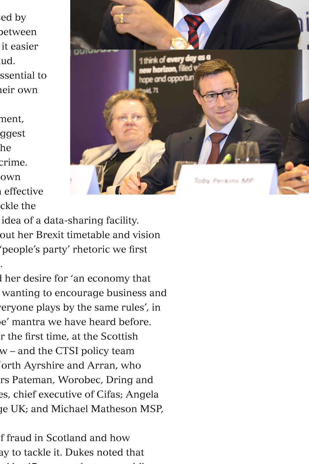 Political party conferences 2016 In this feature l data sharing l cyber security l insurance fraud Fraud in the hot seat Topical consumer issues such as fraud captured the attention of various organisations and MPs during the political party conferences over the past few weeks. laura Hurcum reports D Cyber security is one of the biggest issues of our time, and has not been given the attention it warrants Chi Onwurah uring this years Labour, Conservative and SNP party conferences, CTSI joined seven of the UKs leading organisations committed to tackling fraud to debate the issue and wider consumer matters. Although attendance, overall, was down at the Labour Party Conference in Liverpool in late September, the first Fraud Fringe event was refreshingly well populated, and sparked lively debate among panellists and audience members. It was held at the ACC Liverpool venue complex, and chaired by Labour MP Toby Perkins. Among the topics debated were the importance of data sharing, protecting vulnerable consumers, and raising awareness of fraud and scams. The panel consisted of: Melissa Dring, CTSI director of policy; Chi Onwurah, Labour MP for Newcastle and shadow minister for business, energy and industrial strategy; Jack Dromey, Labour MP for Birmingham; Mike Haley, deputy chief executive of anti-fraud group Cifas; Caroline Abrahams, charity director, Age UK; Anthony Browne, chief executive of the British Bankers Association; Cathy Gerosa, head of regulatory affairs, Federation of Communication Services; Katy Worobec, director of Financial Fraud Action; and Ben Fletcher, director of Insurance Fraud Bureau. In her opening comments, Onwurah described cyber security as one of the biggest issues of our time, and argued that it has not been given the attention it warrants. She added that only a miniscule proportion of funds [had been] set aside to deal with crime online, despite its wide-ranging impact on businesses and individuals. Dring argued that the role of trading standards in tackling this criminality was poorly understood. She called for greater recognition of the professions role, and forcloser working with the police and otherbodies involved in fraud detection andinvestigation. Fletcher said there was a misconception among members of the public that insurance fraud was largely harmless and conducted by individuals, when in reality it was incredibly harmful and often perpetrated by organised criminals. He said sharing data is one of our best weapons to take the fight back to fraudsters. A week later and it was the turn of the Conservatives party conference, in Birmingham, to bring the issue of fraud to the top of theagenda. Browne, Worobec and Fletcher were again on the panel, and they were joined by: Leon Livermore, CTSI chief executive; Simon Fell, assistant director of engagement, Cifas; Jane Vass, director of policy and research at Age UK; Chris Pateman, chief executive of Federation of Communication Services; and Brandon Lewis MP, minister for policing. During the debate there was a clear desire to change the language used when talking about scams to make it more universally understandable Livermore insisted we need to say what is really going on. The issue of data sharing was raised by Browne, who called for better links between banks and law enforcement to make it easier to share information and identify fraud. Livermore agreed, saying it was essential to give consumers more power over their own data to tackle fraud. Speaking on behalf of the government, Lewis argued that one of the UKs biggest challenges in terms of security was the crossover between fraud and cyber crime. He acknowledged that breaking down barriers to sharing data would be an effective way to see what could be done to tackle the issue, and promised to consider the idea of a data-sharing facility. In the main hall, Theresa May set out her Brexit timetable and vision in her speech, referencing the same peoples party rhetoric we first heard from her when she took office. The Prime Minister again outlined her desire for an economy that works for everyone and while still wanting to encourage business and support free trade to make sure everyone plays by the same rules, in slight contrast to the cutting red tape mantra we have heard before. The final fringe event was held, for the first time, at the Scottish National Party conference in Glasgow and the CTSI policy team welcomed Patricia Gibson, MP for North Ayrshire and Arran, who chaired the session. Previous speakers Pateman, Worobec, Dring and Fletcher were joined by: Simon Dukes, chief executive of Cifas; Angela Kitching, head of external affairs, Age UK; and Michael Matheson MSP, Cabinet Secretary for Justice. Discussions centred on the level of fraud in Scotland and how partnership working could be the way to tackle it. Dukes noted that identity fraud in the country increased by 17 per cent last year, while keynote speaker Matheson said fraud is often a result of organised crime. Dukes suggested a national measure of fraud loss and a cyber life-skills strategy were needed to tackle the problem. According to Dring, trading standards role in fighting fraud is understated; a focus on resources and organisations working together she added, is key. Senior CTSI staff were also on the panel during events hosted by Citizens Advice and the New Statesman, which allowed them to bring some of the institutes key policy demands to the attention of government and stakeholders. Credits Laura Hurcum, CTSI communications. Images: Andrew Wiard To share this page, in the toolbar click on You might also like Labour Party Conference, Liverpool Conservatives party conference, Birmingham Scottish National Party Conference, Glasgow