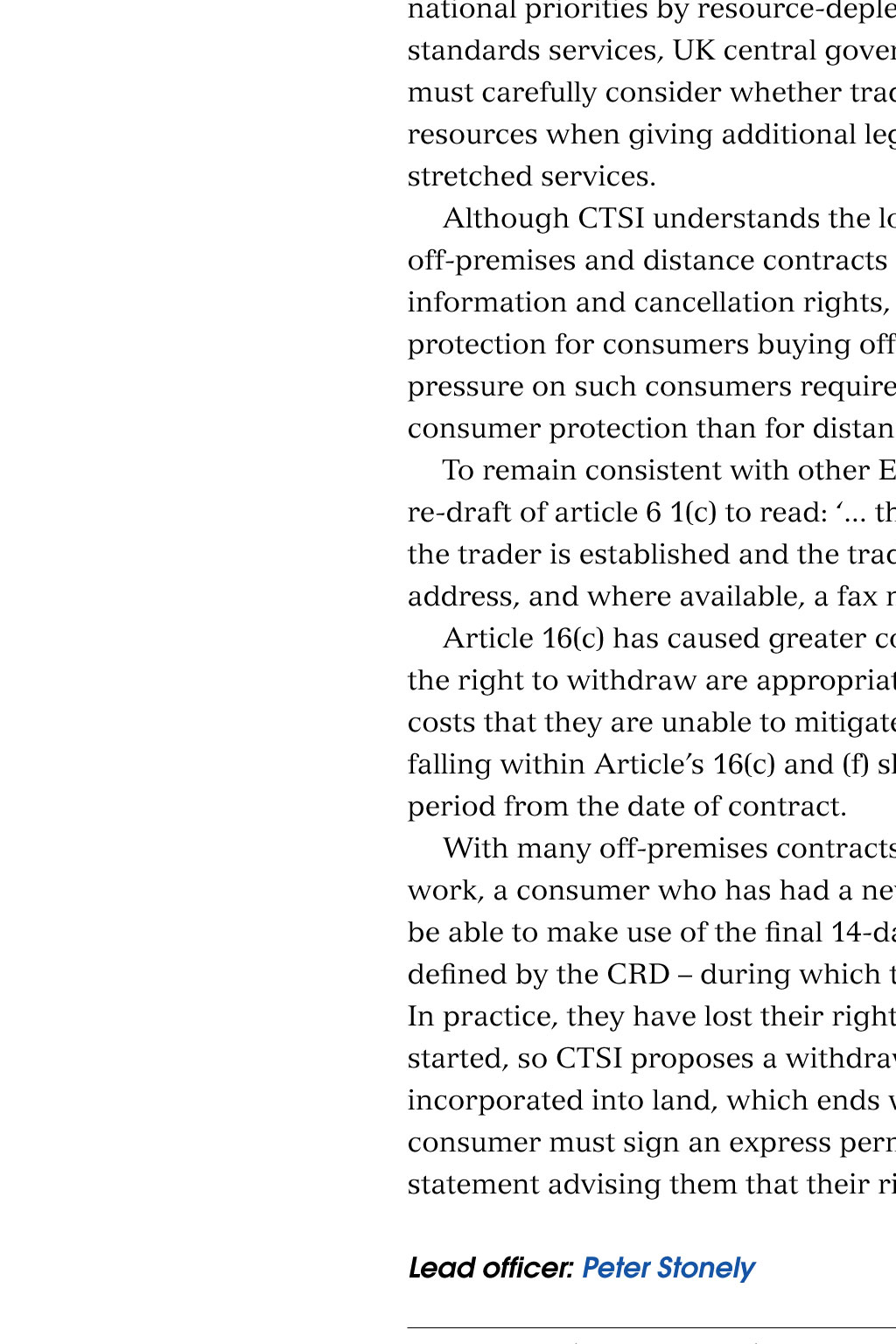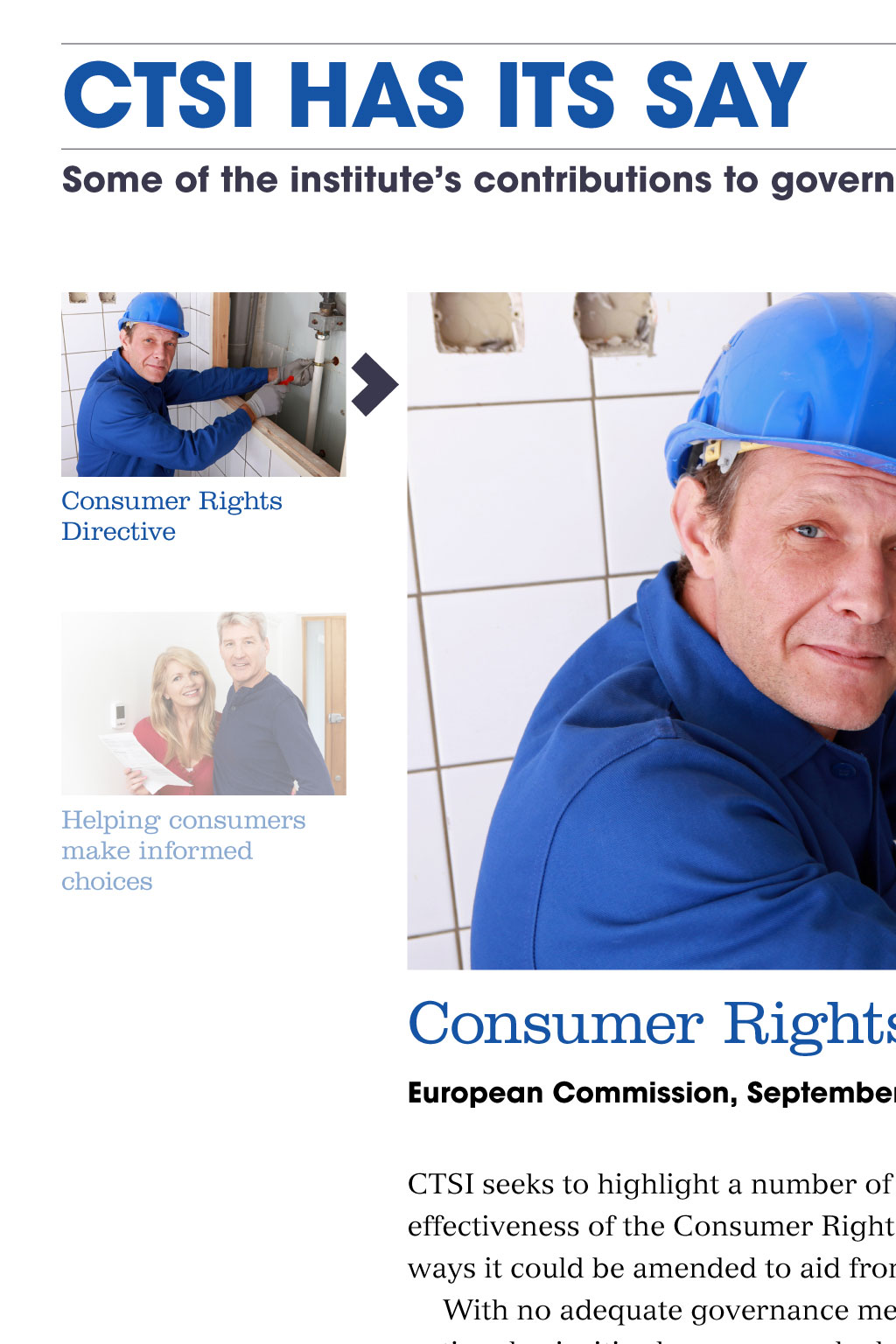 CTSI HAS ITS SAY Some of the institutes contributions to government policy debate Consumer Rights Directive Helping consumers make informed choices Consumer Rights Directive European Commission, September 2016 CTSI seeks to highlight a number of factors hindering the overall effectiveness of the Consumer Rights Directive (CRD), and practical ways it could be amended to aid frontline trading standards officers. With no adequate governance mechanism for the delivery of nationalpriorities by resource-depleted local authority trading standards services, UK central government and EU policymakers must carefully consider whether trading standards have appropriate resources when giving additional legislative responsibilities to already stretched services. Although CTSI understands the logic behind treating off-premises and distance contracts in the same way over informationand cancellation rights, this approach has weakened protection for consumers buying off-premises; the psychological pressure on such consumers requires a greater, and different, level of consumer protection than for distance contracts. To remain consistent with other EU law, CTSI would like to see a re-draft of article 6 1(c) to read: ... the geographical address at which the trader is established and the traders telephone number and email address, and where available, a fax number. Article 16(c) has caused greater concern. Although exemptions from the right to withdraw are appropriate when this can cause traders costs that they are unable to mitigate, CTSI believes that sales contracts falling within Articles 16(c) and (f) should have a 14-day withdrawal period from the date of contract. With many off-premises contracts involving home improvement work, a consumer who has had a new bathroom fitted is unlikely to be able to make use of the final 14-day period now more clearly defined by the CRD during which they can withdraw from a contract. Inpractice, they have lost their right to cancel once the work has started, so CTSI proposes a withdrawal period, for goods that are incorporated into land, which ends when work starts; at this stage the consumer must sign an express permission for work to start with a clear statement advising them that their right to withdraw has ended. Lead officer: Peter Stonely For more details, and to contribute to consultations such as these, visit www.tradingstandards.uk Credits Images: melis / Marcos Mesa Sam Wordley / To share this page, in the toolbar click on You might also like CTSI has its say October 2016 Shutterstock Helping consumers make informed choices Helping consumers make informed choices proposed changes to rules around tariff compatibility and marketing Ofgem, September 2016 CTSI reiterates as still relevant points previously made in response to an Ofgem retail energy market regulation consultation in March 2016. On the latest consultation, moving away from prescriptive rules, towards a system of principles and self-regulation, will further dilute consumer protection. Consumers expect clarity from their energy provider, as well as proper and appropriate regulation. Clear and unambiguous rules cannot be achieved through a system of general principles variously applied, and interpreted in different ways by different energy suppliers; the results could be chaotic. A level playing field with close regulation is vital. Safe switching initiated by consumers themselves using a price comparison website is increasing, driving true competition; CTSI urges the regulator to build on this success, keeping the number of tariffs to a minimum and providing timely, clear and accurate data on energy consumption. Instead, Ofgems latest proposals will probably cause a decline. CTSI strongly opposes a return to commission-paid doorstep and telephone sales, likely to result in unsafe switches of most consumers to an uncompetitive tariff. Time and again in fines for mis-selling, and the criminal conviction achieved by Surrey Trading Standards against one of the Big Six history shows this is a recipe for disaster, resulting in widespread consumer detriment. With Ofgem advocating a move away from a limited number of tariffs available to consumers, there will probably soon be hundreds or even thousands of different tariffs to choose from, making it difficult for consumers to evaluate whether they are achieving the best deal. The institute is also concerned that the rollout of smart meters will come at a massive cost to consumers, introducing significant complications. A multitude of time of use tariffs will probably confuse and baffle a large proportion of consumers, making it virtually impossible to carry out a safe switch. Also, much more needs to be done to identify and help vulnerable consumers. Lead officer: Steve Playle For more details, and to contribute to consultations such as these, visit www.tradingstandards.uk