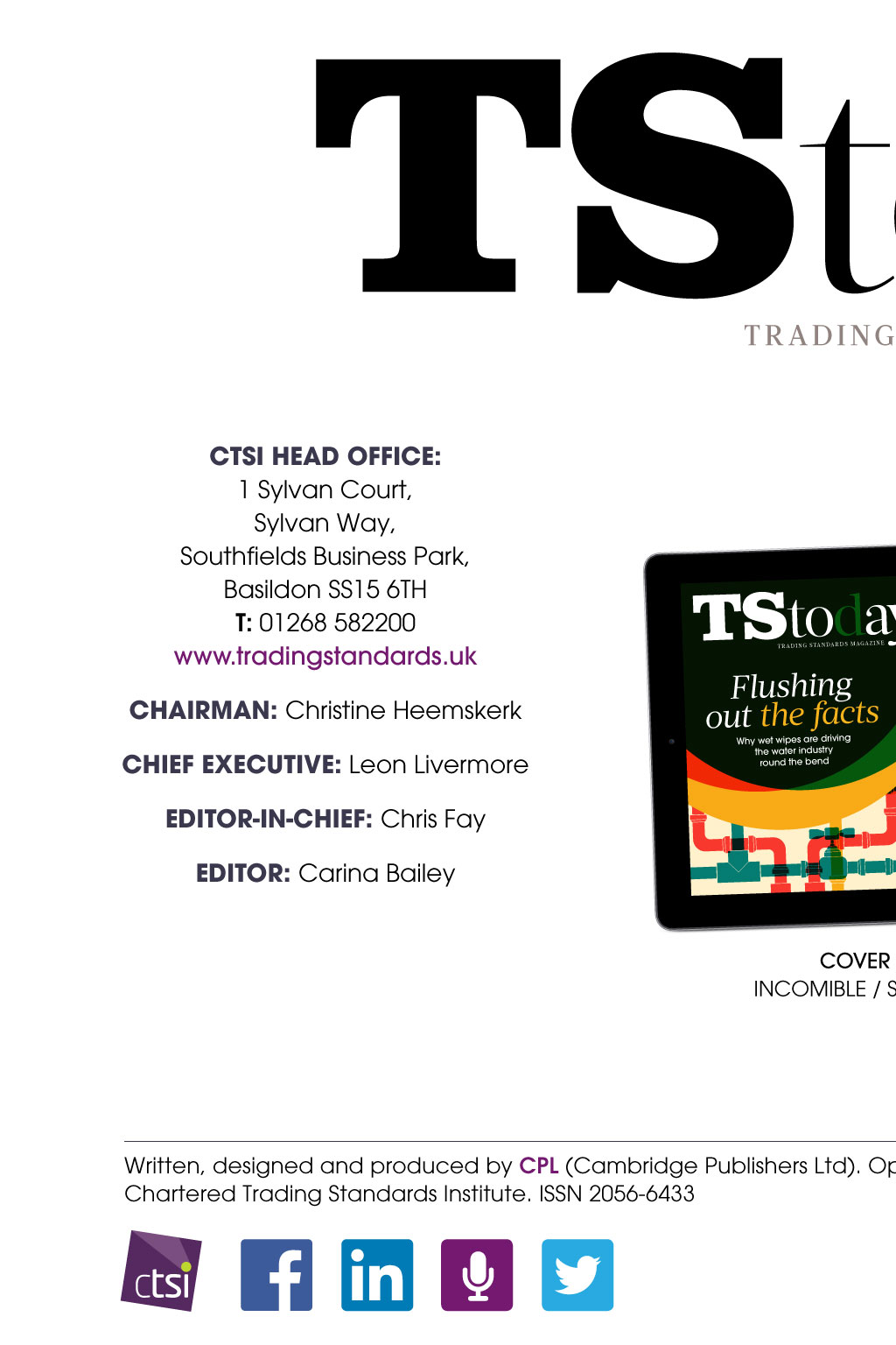 t r a d i n g s ta n da r d s m ag a z i n e CTSI HEAD OFFICE: 1 Sylvan Court, Sylvan Way, Southfields business park, basildon SS15 6TH T: 01268 582200 www.tradingstandards.uk CHAIRMAN: Christine Heemskerk CHIEF ExECuTIvE: leon livermore november 2016 www.tradingstandards.uk azine t r a d i n g s ta n da r d s m ag Flushing out the facts Why wet wipes are driving the water industry round the bend EDITOR-IN-CHIEF: Chris fay EDITORIAL ENquIRIES: TS Today, Cpl, 1 Cambridge Technopark, newmarket road Cambridge Cb5 8pb T: 01223 378035 e: tstoday@tsi.org.uk gENERAL ADvERTISINg: Judith Thurston T: 01268 582221 e: advertising@tsi.org.uk SuBSCRIPTION HOTLINE: T: 01268 582228 e: institute@tsi.org.uk EDITOR: Carina bailey COVER IMAGE: inComiblE / SHuTTErSToCk CTSI PRESS OFFICE: T: 01268 888051 e: pressoffice@tsi.org.uk Written, designed and produced by CPL (Cambridge publishers ltd). opinions expressed in this journal are not necessarily those of the Chartered Trading Standards institute. iSSn 2056-6433 Facebook f Logo CMYK / .ai Facebook f Logo CMYK / .ai