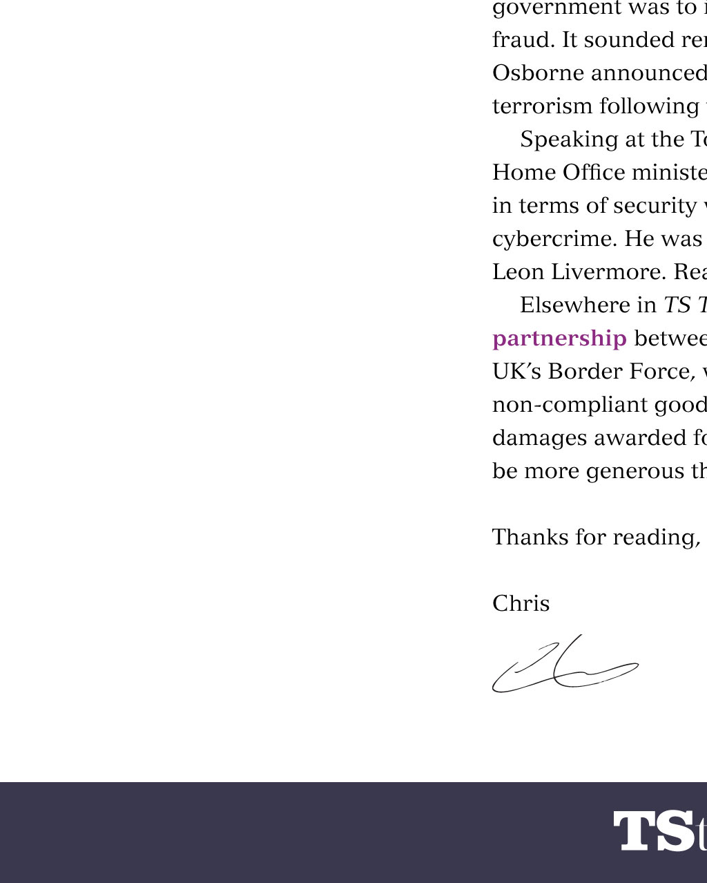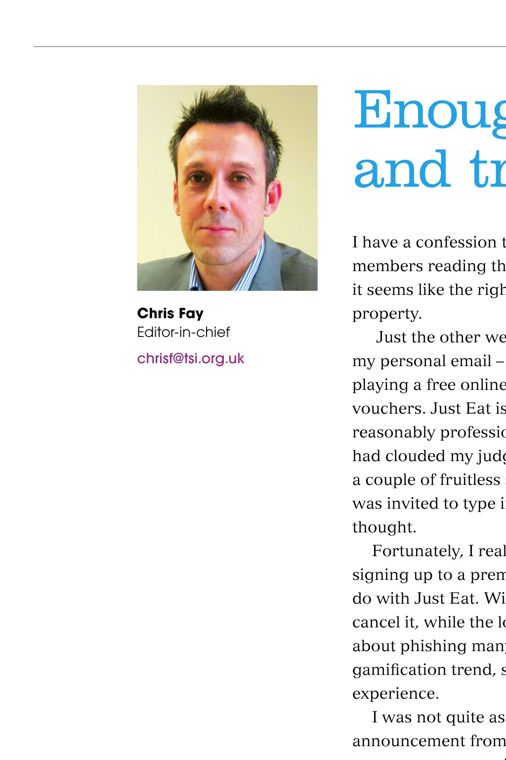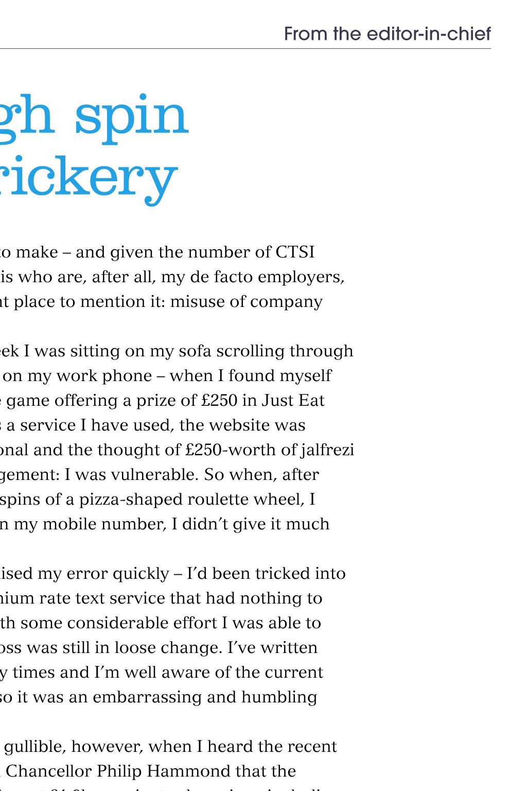 From the editor-in-chief Enough spin and trickery Chris Fay Editor-in-chief chrisf@tsi.org.uk I have a confession to make and given the number of CTSI members reading this who are, after all, my de facto employers, it seems like the right place to mention it: misuse of company property. Just the other week I was sitting on my sofa scrolling through my personal email on my work phone when I found myself playing a free online game offering a prize of 250 in Just Eat vouchers. Just Eat is a service I have used, the website was reasonably professional and the thought of 250-worth of jalfrezi had clouded my judgement: I was vulnerable. So when, after a couple of fruitless spins of a pizza-shaped roulette wheel, I was invited to type in my mobile number, I didnt give it much thought. Fortunately, I realised my error quickly Id been tricked into signing up to a premium rate text service that had nothing to do with Just Eat. With some considerable effort I was able to cancel it, while the loss was still in loose change. Ive written about phishing many times and Im well aware of the current gamification trend, so it was an embarrassing and humbling experience. I was not quite as gullible yesterday, however, when I heard the recent announcement from Chancellor Philip Hammond that the government was to invest 1.9bn against cybercrime, including fraud. It sounded remarkably like the same 1.9bn that George Osborne announced last year only with an emphasis on terrorism following the Paris attacks. Speaking at the Tory party Fraud Fringe, Brandon Lewis, the Home Office minister for policing, said the UKs biggest challenge in terms of security was the crossover between fraud and cybercrime. He was joined on the panel by CTSI chief executive, Leon Livermore. Read more about it in this edition. Elsewhere in TS Today, we learn about a pioneering partnership between Leicestershire Trading Standards and the UKs Border Force, which targets the importation of unsafe and non-compliant goods through East Midlands Airport, and how damages awarded for aggressive commercial practices could be more generous than you might think. Thanks for reading, Chris
