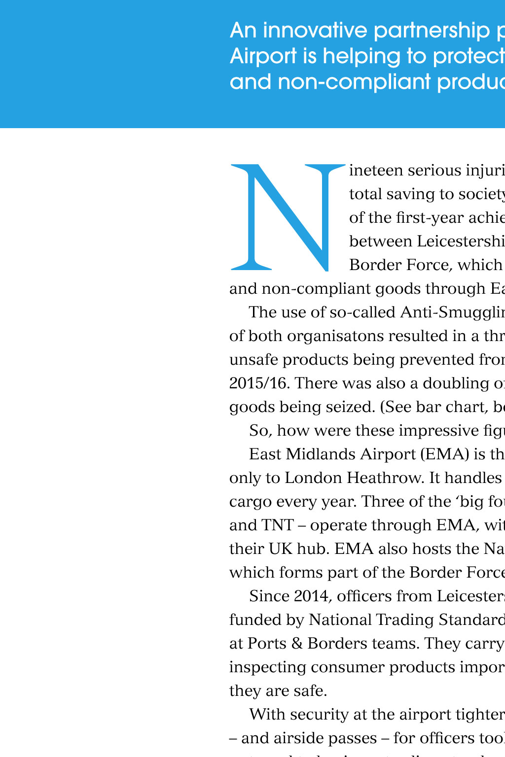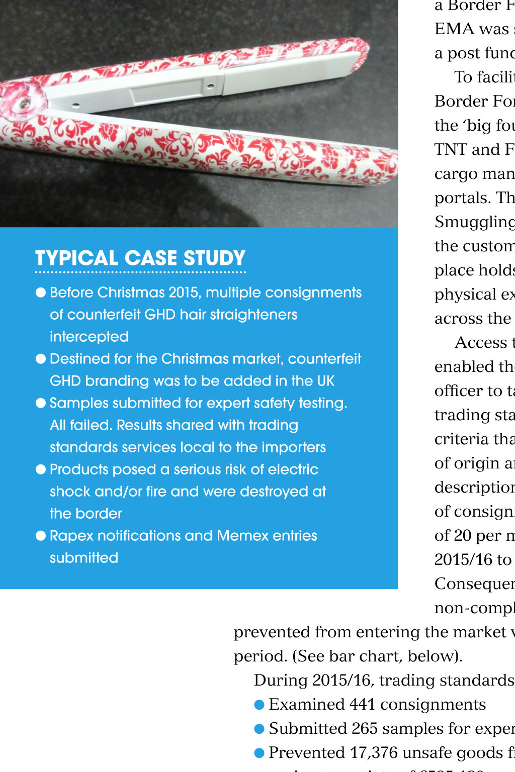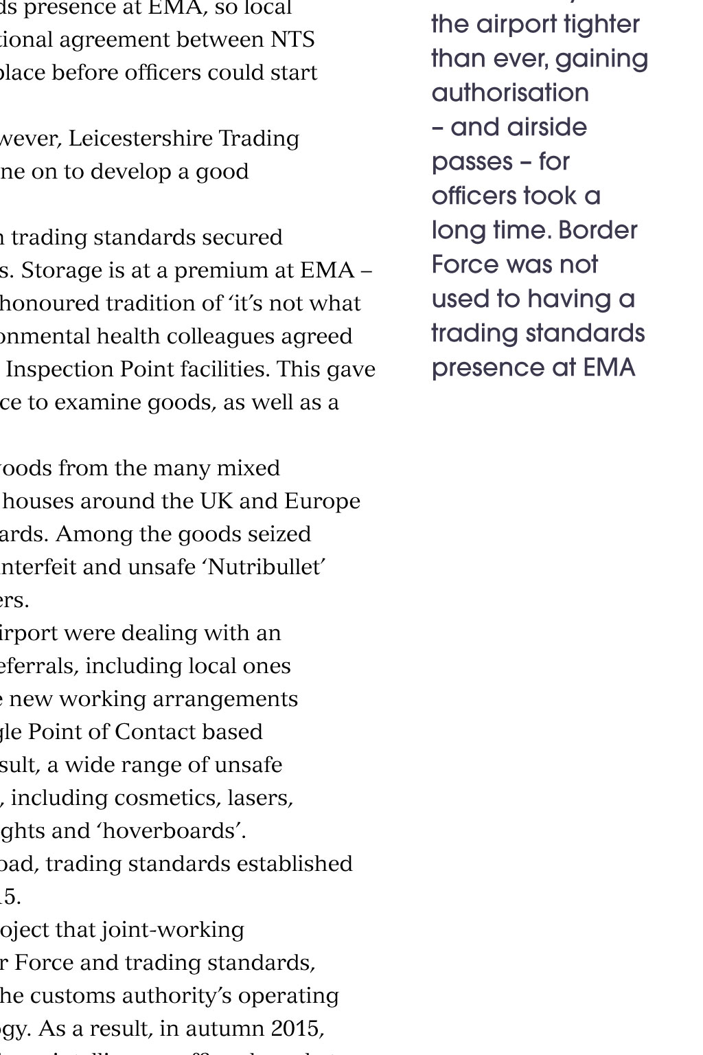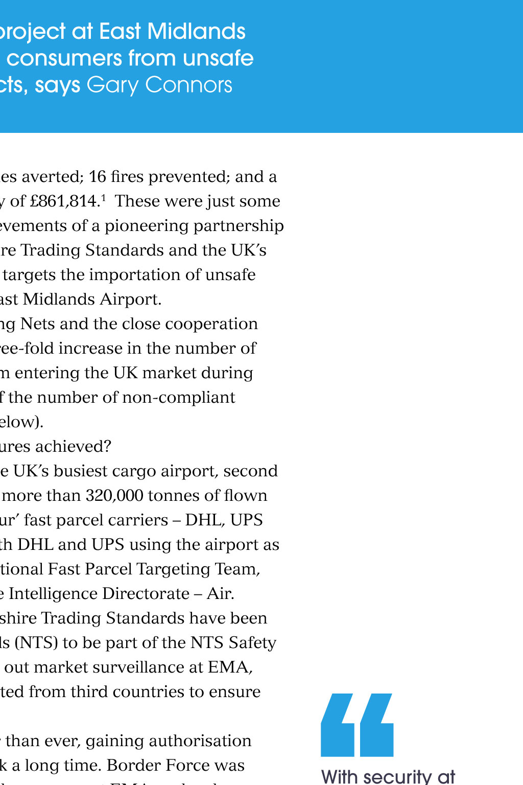 Leicestershire Trading Standards: Anti-Smuggling Network In this feature l cooperation l surveillance l funding essential Net closes in on smugglers An innovative partnership project at East Midlands Airport is helping to protect consumers from unsafe and non-compliant products, says Gary Connors N ineteen serious injuries averted; 16 fires prevented; anda total saving to society of 861,814.1 These werejust some of the first-year achievements of apioneering partnership between Leicestershire Trading Standards and the UKs Border Force, which targets the importation of unsafe and non-compliant goods through East Midlands Airport. The use of so-called Anti-Smuggling Nets and the close cooperation of both organisatons resulted in a three-fold increase in the number of unsafe products being prevented from entering the UK market during 2015/16. There was also a doubling of the number of non-compliant goods being seized. (See bar chart, below). So, how were these impressive figures achieved? East Midlands Airport (EMA) is the UKs busiest cargo airport, second only to London Heathrow. It handles more than 320,000 tonnes of flown cargo every year. Three of the big four fast parcel carriers DHL, UPS and TNT operate through EMA, with DHL and UPS using the airport as their UK hub. EMA also hosts the National Fast Parcel Targeting Team, which forms part of the Border Force Intelligence Directorate Air. Since 2014, officers from Leicestershire Trading Standards have been funded by National Trading Standards (NTS) to be part of the NTS Safety at Ports & Borders teams. They carry out market surveillance at EMA, inspecting consumer products imported from third countries to ensure they are safe. With security at the airport tighter than ever, gaining authorisation and airside passes for officers took a long time. Border Force was notused to having a trading standards presence at EMA, so local agreement protocols and a joint national agreement between NTS andBorder Force had to be put in place before officers could start active market surveillance. Since these teething problems, however, Leicestershire Trading Standards and Border Force have gone on to develop a good workingrelationship. A significant milestone came when trading standards secured much-needed airside storage facilities. Storage is at a premium at EMA particularly airside but, in the time-honoured tradition of its not what you know, but who you know, environmental health colleagues agreed that officers could share their Border Inspection Point facilities. This gave the trading standards team more space to examine goods, as well as a secure storage area. This quickly filled up with unsafe goods from the many mixed consignments destined for fulfilment houses around the UK and Europe that were examined by trading standards. Among the goods seized during the first few months were counterfeit and unsafe Nutribullet foodblenders and Babyliss hairstylers. Trading standards officers at the airport were dealing with an increasing number of consignment referrals, including local ones from Border Force as a result of the new working arrangements and national referrals from the Single Point of Contact based at Suffolk Trading Standards. As a result, a wide range of unsafe products continued to be intercepted, including cosmetics, lasers, hairstraighteners, sunglasses, LED lights and hoverboards. In response to this growing workload, trading standards established adedicated imports team early in 2015. It was quickly recognised in the project that joint-working opportunities existed between Border Forceand trading standards, to mirror thecustoms authoritys operating methodology. As a result, in autumn 2015, aBorder Force intelligence officer based at EMA was seconded to trading standards apost funded by NTS. To facilitate faster parcel movements, BorderForce has permission from each of thebig four parcel carriers DHL, UPS, TNTand FedEx to access their live inventory/ cargo manifest databases via internet portals. These are collectively known as AntiSmuggling Nets (ASNs), which are used by the customs agency actively to target and TYPICAL CASE STuDY place holds on consignments of interest, for l Before Christmas 2015, multiple consignments physical examination by their teams at airports of counterfeit GHD hair straighteners across the country. intercepted Access to the ASNs for UPS and DHL l Destined for the Christmas market, counterfeit enabled the seconded Border Force GHD branding was to be added in the UK officer to target and refer consignments to l Samples submitted for expert safety testing. trading standards, based on agreed profile All failed. Results shared with trading criteria thatfocused on high-risk countries standards services local to the importers of originand high-risk consignment l Products posed a serious risk of electric descriptions.This increased the number shock and/or fire and were destroyed at of consignment referrals from an average the border l Rapex notifications and Memex entries of 20 per month during the first half of submitted 2015/16 to 103 during Q3 and 223 during Q4. Consequently, the number of unsafe and non-compliant products detected and prevented from entering the market via EMA also increased during that period. (See bar chart, below). During 2015/16, trading standards officers at EMA have: l Examined 441 consignments l Submitted 265 samples for expert testing l Prevented 17,376 unsafe goods from entering the market, equal to a saving to society of 535,180 l Prevented 10,605 non-compliant goods from entering the market/ being reworked (some were returned to the country of origin), equalto a saving to society of 326,634 At the end of 2015, Leicestershire Trading Standards also began to work with Border Force at Stansted along with colleagues from Essex Trading Standards to extend the EMA model of targeting and referrals to include FedEx at the site. The seconded Border Force officer began to target FedEx consignments