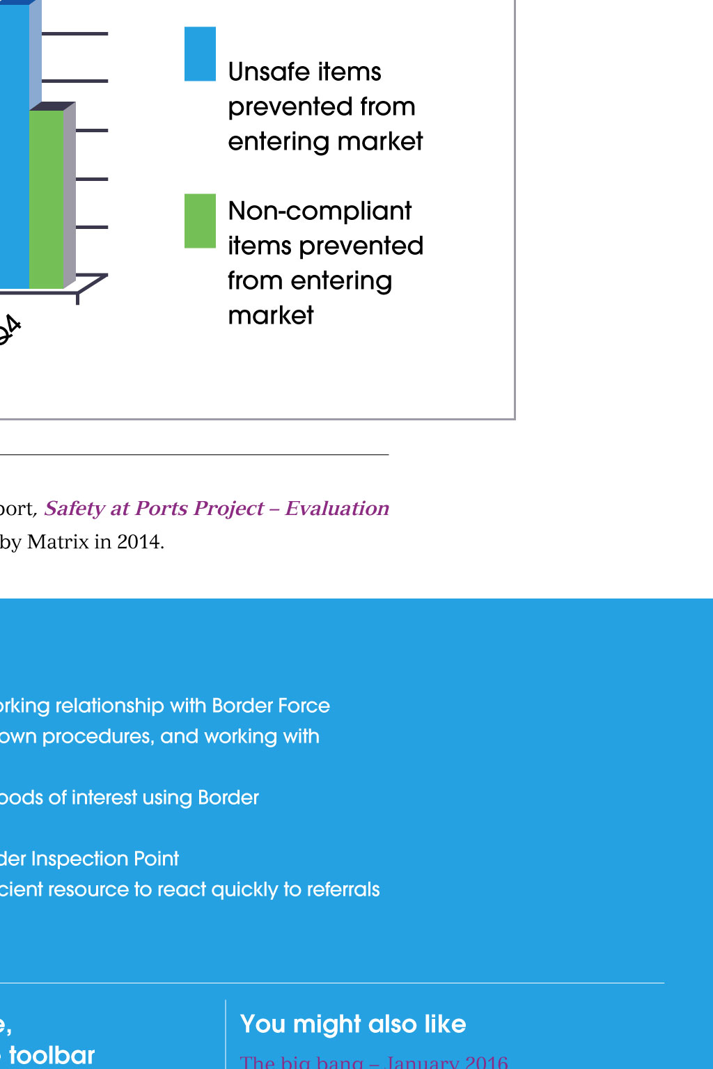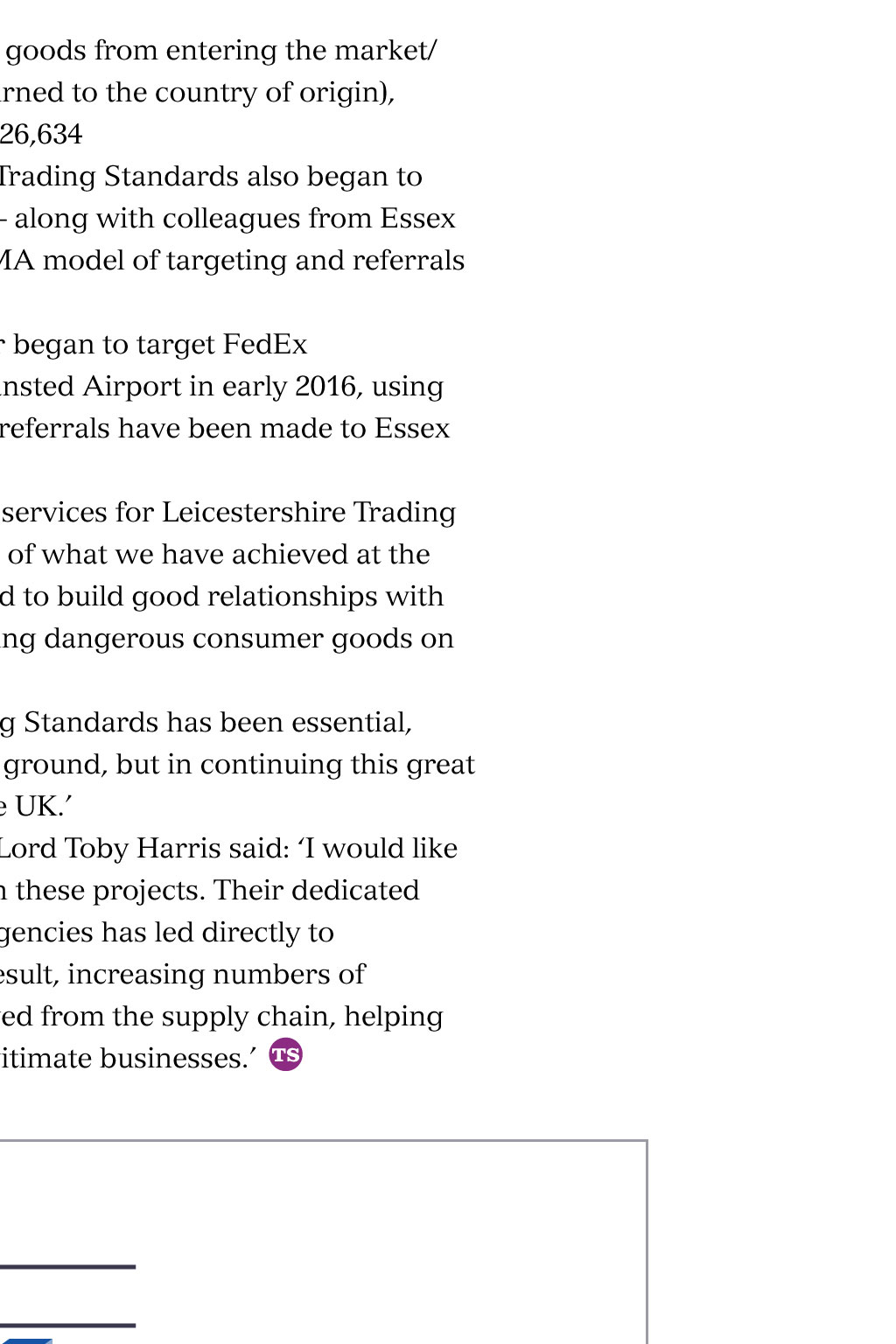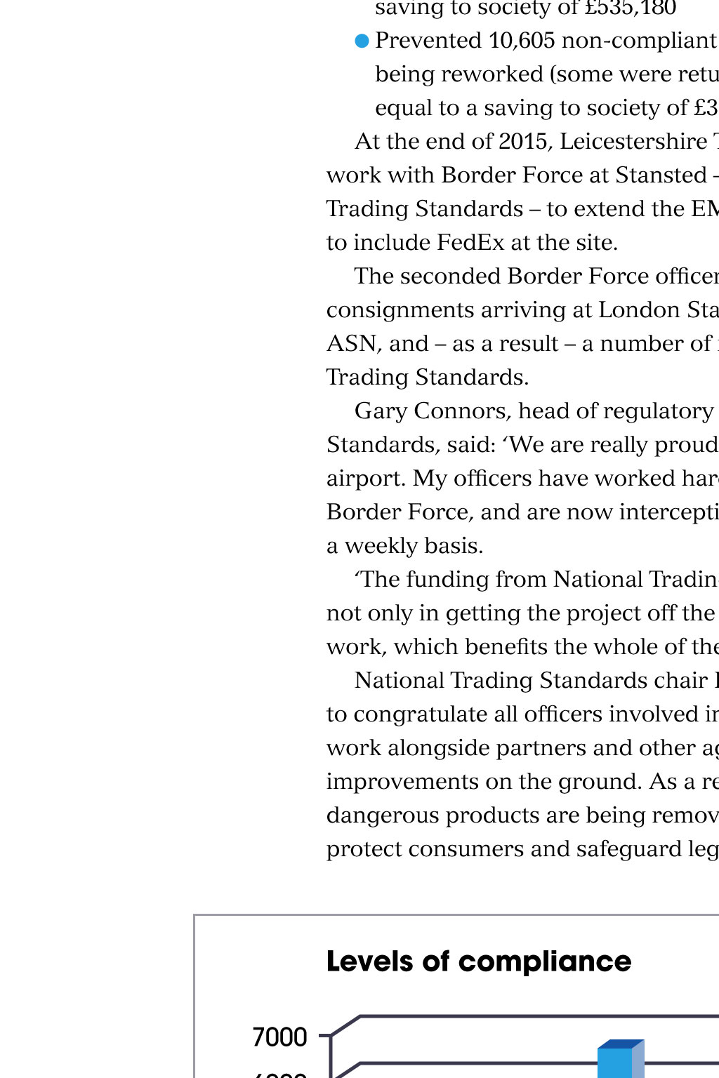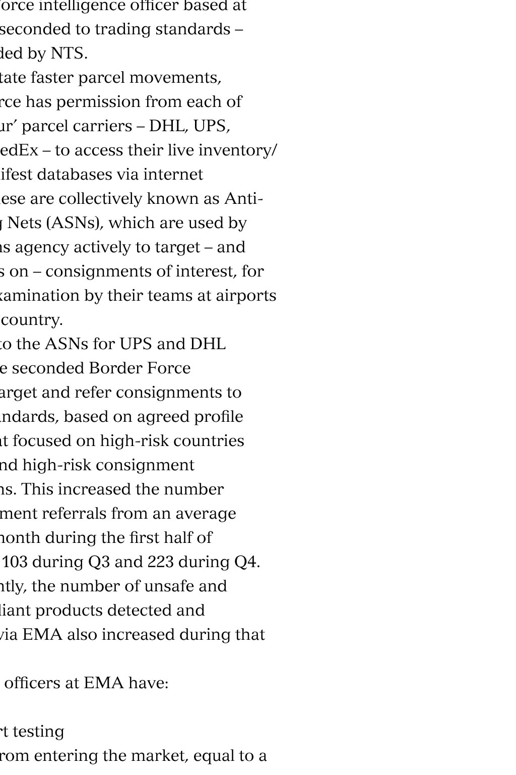 Leicestershire Trading Standards: Anti-Smuggling Network In this feature l cooperation l surveillance l funding essential Net closes in on smugglers An innovative partnership project at East Midlands Airport is helping to protect consumers from unsafe and non-compliant products, says Gary Connors N ineteen serious injuries averted; 16 fires prevented; anda total saving to society of 861,814.1 These werejust some of the first-year achievements of apioneering partnership between Leicestershire Trading Standards and the UKs Border Force, which targets the importation of unsafe and non-compliant goods through East Midlands Airport. The use of so-called Anti-Smuggling Nets and the close cooperation of both organisatons resulted in a three-fold increase in the number of unsafe products being prevented from entering the UK market during 2015/16. There was also a doubling of the number of non-compliant goods being seized. (See bar chart, below). So, how were these impressive figures achieved? East Midlands Airport (EMA) is the UKs busiest cargo airport, second only to London Heathrow. It handles more than 320,000 tonnes of flown cargo every year. Three of the big four fast parcel carriers DHL, UPS and TNT operate through EMA, with DHL and UPS using the airport as their UK hub. EMA also hosts the National Fast Parcel Targeting Team, which forms part of the Border Force Intelligence Directorate Air. Since 2014, officers from Leicestershire Trading Standards have been funded by National Trading Standards (NTS) to be part of the NTS Safety at Ports & Borders teams. They carry out market surveillance at EMA, inspecting consumer products imported from third countries to ensure they are safe. With security at the airport tighter than ever, gaining authorisation and airside passes for officers took a long time. Border Force was notused to having a trading standards presence at EMA, so local agreement protocols and a joint national agreement between NTS andBorder Force had to be put in place before officers could start active market surveillance. Since these teething problems, however, Leicestershire Trading Standards and Border Force have gone on to develop a good workingrelationship. A significant milestone came when trading standards secured much-needed airside storage facilities. Storage is at a premium at EMA particularly airside but, in the time-honoured tradition of its not what you know, but who you know, environmental health colleagues agreed that officers could share their Border Inspection Point facilities. This gave the trading standards team more space to examine goods, as well as a secure storage area. This quickly filled up with unsafe goods from the many mixed consignments destined for fulfilment houses around the UK and Europe that were examined by trading standards. Among the goods seized during the first few months were counterfeit and unsafe Nutribullet foodblenders and Babyliss hairstylers. Trading standards officers at the airport were dealing with an increasing number of consignment referrals, including local ones from Border Force as a result of the new working arrangements and national referrals from the Single Point of Contact based at Suffolk Trading Standards. As a result, a wide range of unsafe products continued to be intercepted, including cosmetics, lasers, hairstraighteners, sunglasses, LED lights and hoverboards. In response to this growing workload, trading standards established adedicated imports team early in 2015. It was quickly recognised in the project that joint-working opportunities existed between Border Forceand trading standards, to mirror thecustoms authoritys operating methodology. As a result, in autumn 2015, aBorder Force intelligence officer based at EMA was seconded to trading standards apost funded by NTS. To facilitate faster parcel movements, BorderForce has permission from each of thebig four parcel carriers DHL, UPS, TNTand FedEx to access their live inventory/ cargo manifest databases via internet portals. These are collectively known as AntiSmuggling Nets (ASNs), which are used by the customs agency actively to target and TYPICAL CASE STuDY place holds on consignments of interest, for l Before Christmas 2015, multiple consignments physical examination by their teams at airports of counterfeit GHD hair straighteners across the country. intercepted Access to the ASNs for UPS and DHL l Destined for the Christmas market, counterfeit enabled the seconded Border Force GHD branding was to be added in the UK officer to target and refer consignments to l Samples submitted for expert safety testing. trading standards, based on agreed profile All failed. Results shared with trading criteria thatfocused on high-risk countries standards services local to the importers of originand high-risk consignment l Products posed a serious risk of electric descriptions.This increased the number shock and/or fire and were destroyed at of consignment referrals from an average the border l Rapex notifications and Memex entries of 20 per month during the first half of submitted 2015/16 to 103 during Q3 and 223 during Q4. Consequently, the number of unsafe and non-compliant products detected and prevented from entering the market via EMA also increased during that period. (See bar chart, below). During 2015/16, trading standards officers at EMA have: l Examined 441 consignments l Submitted 265 samples for expert testing l Prevented 17,376 unsafe goods from entering the market, equal to a saving to society of 535,180 l Prevented 10,605 non-compliant goods from entering the market/ being reworked (some were returned to the country of origin), equalto a saving to society of 326,634 At the end of 2015, Leicestershire Trading Standards also began to work with Border Force at Stansted along with colleagues from Essex Trading Standards to extend the EMA model of targeting and referrals to include FedEx at the site. The seconded Border Force officer began to target FedEx consignments