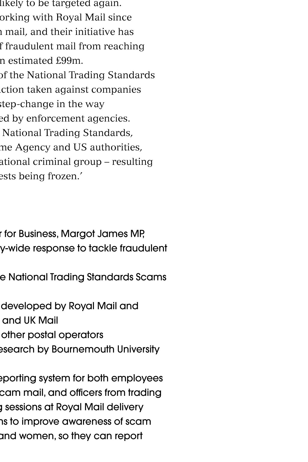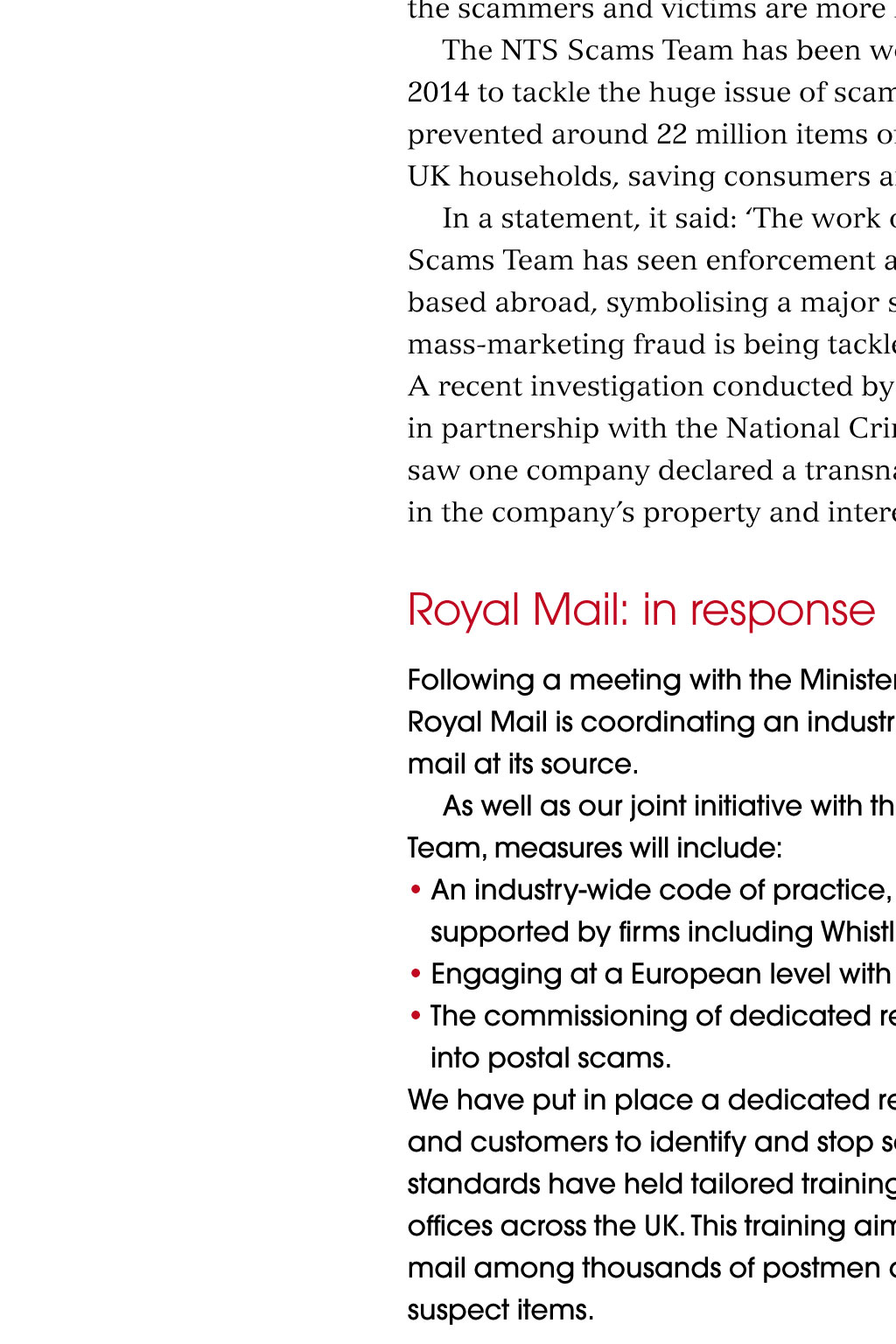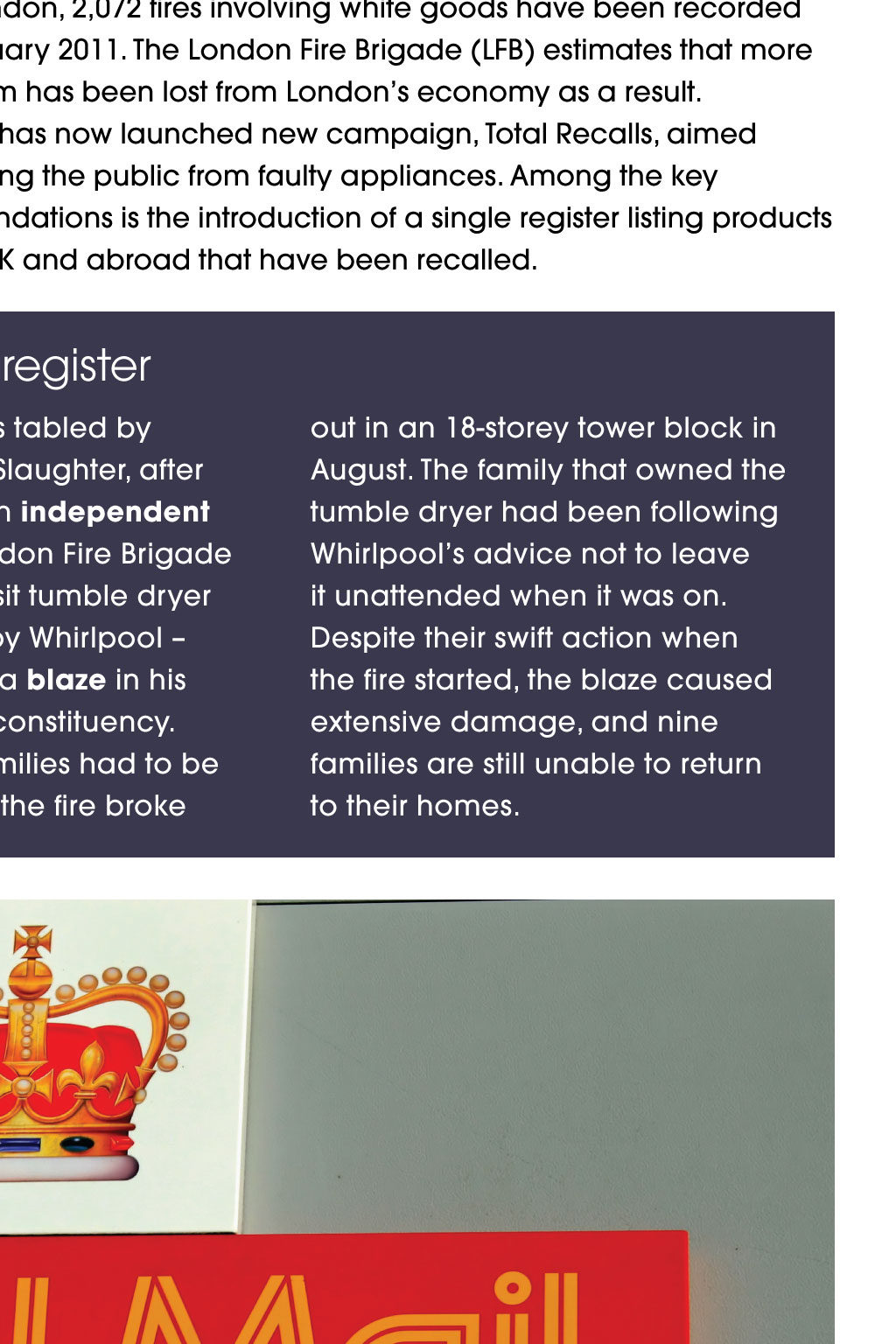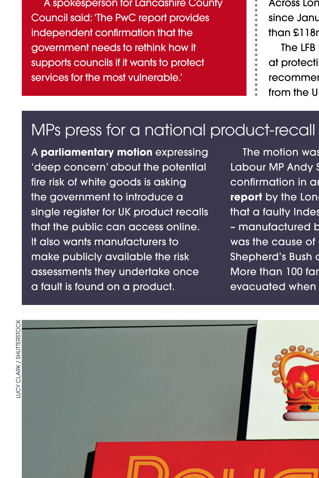 rob byron / SHuTTErSToCk News Burning issue of faulty white goods lancashire County to run out of money in April 2019 A recent report has warned that Lancashire County Councils financial reserves will be gone by April 2019, and that the local authority will have a deficit of almost 400m by 2021. PriceWaterhouseCoopers (PwC) carried out the independent review, which confirms that the councils long-term financial position is not sustainable, even if it makes significant further savings. The council says it cannot continue to make cuts and provide the statutory services including trading standards that it is required to deliver by law. It is using the report to lobby central government about funding for local councils. A spokesperson for Lancashire County Council said: The PwC report provides independent confirmation that the government needs to rethink how it supports councils if it wants to protect services for the most vulnerable. The government has announced a new working group to improve the safety of all domestic white goods, after a series of fires caused by faulty tumble dryers. The product recalls and safety working group will bring together expertise from the fire service, trading standards, consumer organisations and industry, and report back with its interim findings bythe end of the year. Its areas of focus will be: causes of fires in white goods; marking of appliances to make them easier to identify after a fire; andacode of practice for product recalls, including a peer review of risk assessments. An ongoing review into local authorities will also prioritise the issue of product safety, in the wake of an investigation by fire chiefs into a serious fire in London earlier this year. It confirmed that the blaze was caused by a tumble dryer with a fault previously identified by the manufacturer, Whirlpool. Last year, Whirlpool admitted that the fire fault caused when excess fluff touches the heating element occurs in some models, but has not issued a product recall, insisting that people can continue to use the affected dryers while they are waiting for them to be repaired or replaced, as long as they do not leave them unattended. Fire chiefs have renewed their calls for Whirlpool to change its advice to consumers and warned of the dangers of not having a robust national system of product recalls in emergency situations. The government has now written to the company to ask it to do moreto reassure its customers, including looking at reducing the waiting time for machine modifications. Consumer minister Margot James said: I want to see what more can be done to improve the safety of white goods and to support local trading standards officers to make sure customers arent put at risk. In a statement, Whirlpool said: We are working hard to improve our response times. We continue to cooperate fully with the relevant regulatory authorities as progress of the campaign is regularly monitored and reviewed. Across London, 2,072 fires involving white goods have been recorded since January 2011. The London Fire Brigade (LFB) estimates that more than 118m has been lost from Londons economy as a result. The LFB has now launched new campaign, Total Recalls, aimed at protecting the public from faulty appliances. Among the key recommendations is the introduction of a single register listing products from the UK and abroad that have been recalled. mps press for a national product-recall register The motion was tabled by Labour MP Andy Slaughter, after confirmation in an independent report by the London Fire Brigade that a faulty Indesit tumble dryer manufactured by Whirlpool was the cause of a blaze in his Shepherds Bush constituency. More than 100 families had to be evacuated when the fire broke out in an 18-storey tower block in August. The family that owned the tumble dryer had been following Whirlpools advice not to leave it unattended when it was on. Despite their swift action when the fire started, the blaze caused extensive damage, and nine families are still unable to return to their homes. luCy ClArk / SHuTTErSToCk A parliamentary motion expressing deep concern about the potential fire risk of white goods is asking the government to introduce a single register for UK product recalls that the public can access online. It also wants manufacturers to make publicly available the risk assessments they undertake once a fault is found on a product. Postal scam mafia manipulate system, newspaper investigation finds Royal Mail has been accused of failing to crack down on massmarketing scam letters that target elderly and vulnerable people including those living with dementia who are thought to lose up to5.8bn a year. Campaigners and the government have called for immediate action totackle the problem of scam mailings, after a major inquiry by a national newspaper. Louise Baxter, from the National Trading Standards Scams Team, saidthe investigation showed how criminal scammers around the world manipulated the postal system. An undercover reporter from the Daily Mail found that the letters are sent by an international network of conmen, who call themselves amafia and admit that they deliberately rip off people. The letters arethen brought to the UK and put into the Royal Mail delivery system by large postal firms such as Asendia and Whistl. Under Royal Mail bulk-mail contracts, the letters are branded with the Royal Mail insignia on their envelopes, lulling victims into a false sense of trust. Once a victim responds, their details are shared among the scammers and victims are more likely to be targeted again. The NTS Scams Team has been working with Royal Mail since 2014 to tackle the huge issue of scam mail, and their initiative has prevented around 22 million items of fraudulent mail from reaching UKhouseholds, saving consumers an estimated 99m. In a statement, it said: The work of the National Trading Standards Scams Team has seen enforcement action taken against companies based abroad, symbolisin