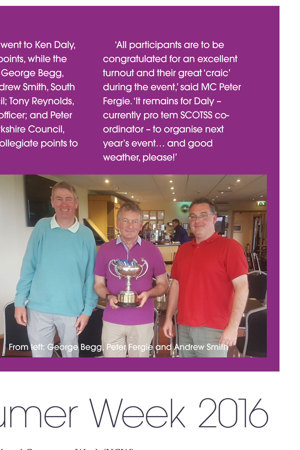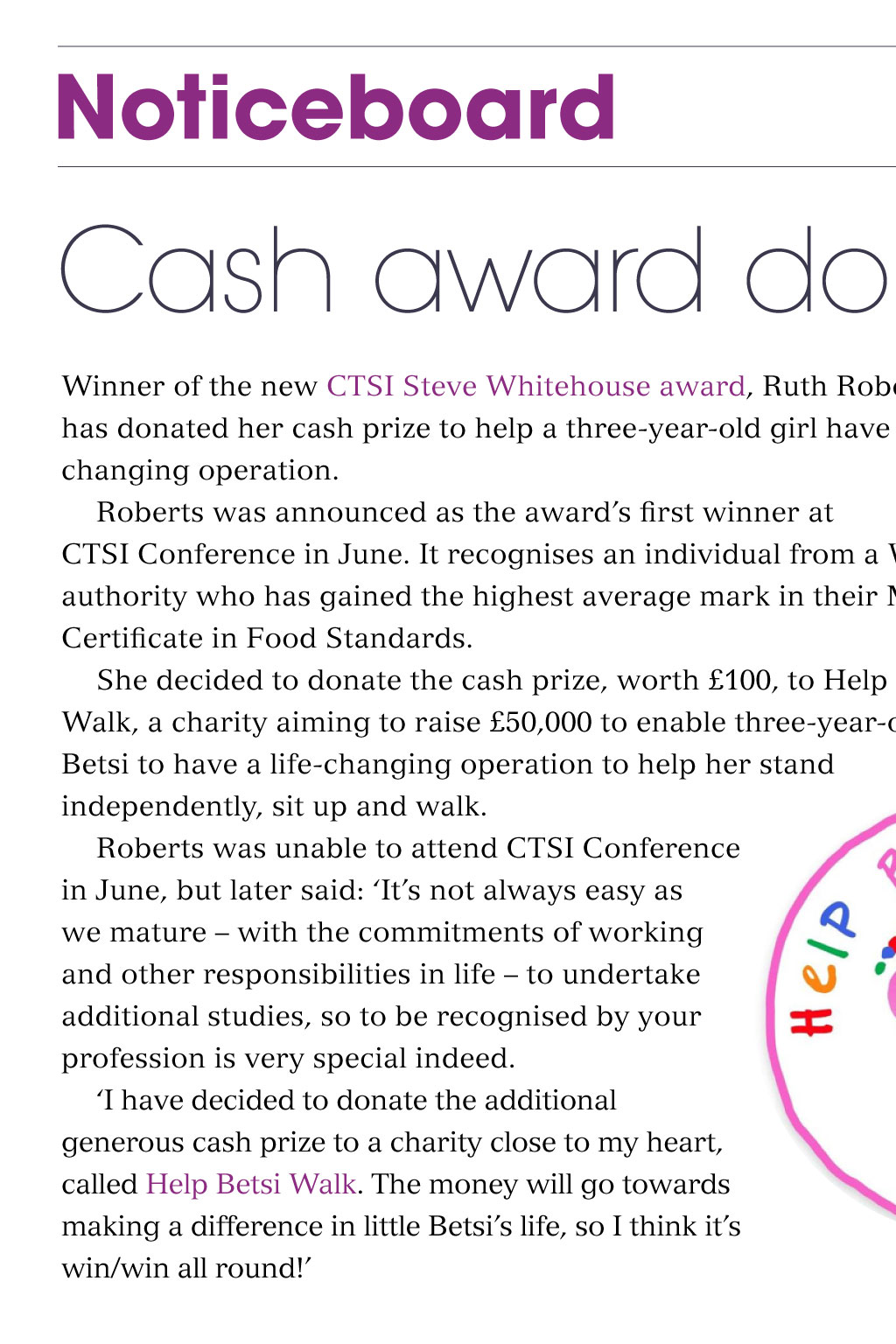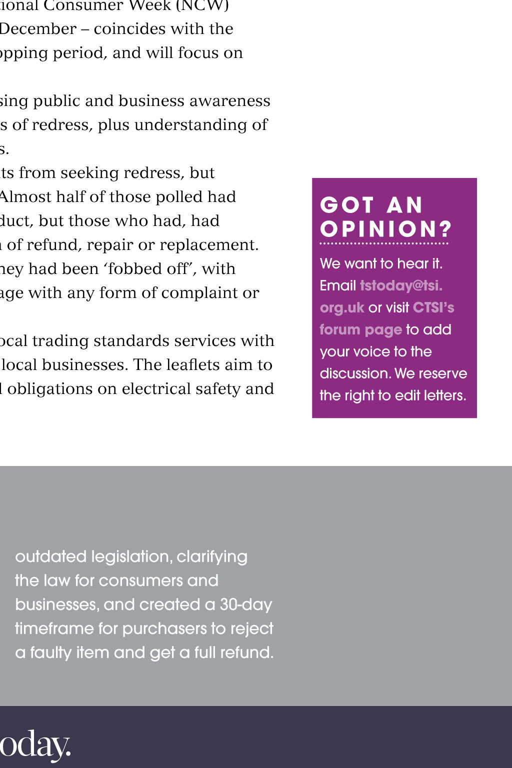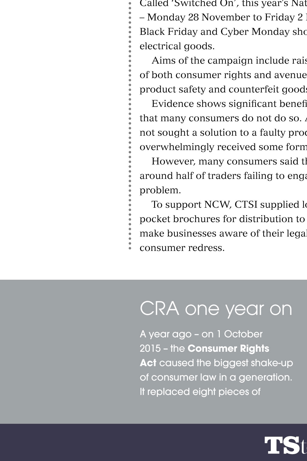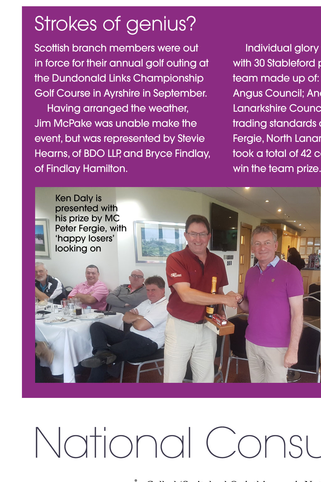 Noticeboard Cash award donated to charity Winner of the new CTSI Steve Whitehouse award, Ruth Roberts, has donated her cash prize to help a three-year-old girl have alifechanging operation. Roberts was announced as the awards first winner at CTSIConference in June. It recognises an individual from a Welsh authority who has gained the highest average mark in their Module Certificate in FoodStandards. She decided to donate the cash prize, worth 100, to Help Betsi Walk, a charity aiming to raise 50,000 to enable three-year-old Betsi to have a life-changing operation to help her stand independently, sit up and walk. Roberts was unable to attend CTSI Conference in June, but later said: Its not always easy as we mature with the commitments of working and other responsibilities in life to undertake additional studies, so to be recognised by your profession is very special indeed. I have decided to donate the additional generous cash prize to a charity close to my heart, called Help Betsi Walk. Themoney will go towards making a difference in little Betsis life, so I think its win/win all round! Strokes of genius? Scottish branch members were out in force for their annual golf outing at the Dundonald Links Championship Golf Course in Ayrshire in September. Having arranged the weather, Jim McPake was unable make the event, but was represented by Stevie Hearns, of BDO LLP and Bryce Findlay, , of Findlay Hamilton. Individual glory went to Ken Daly, with 30 Stableford points, while the team made up of: George Begg, Angus Council; Andrew Smith, South Lanarkshire Council; Tony Reynolds, trading standards officer; and Peter Fergie, North Lanarkshire Council, took a total of 42 collegiate points to win the team prize. All participants are to be congratulated for an excellent turnout and their great craic during the event, said MC Peter Fergie. It remains for Daly currently pro tem SCOTSS coordinator to organise next years event and good weather, please! Ken Daly is presented with his prize by MC Peter Fergie, with happy losers looking on From left: George Begg, Peter Fergie and Andrew Smith National Consumer Week 2016 Called Switched On, this years National Consumer Week (NCW) Monday 28 November to Friday 2 December coincides with the BlackFriday and Cyber Monday shopping period, and will focus on electrical goods. Aims of the campaign include raising public and business awareness of both consumer rights and avenues of redress, plus understanding of product safety and counterfeit goods. Evidence shows significant benefits from seeking redress, but that many consumers do not do so. Almost half of those polled had not sought a solution to a faulty product, but those who had, had overwhelmingly received some form of refund, repair or replacement. However, many consumers said they had been fobbed off, with around half of traders failing to engage with any form of complaint or problem. To support NCW, CTSI supplied local trading standards services with pocket brochures for distribution to local businesses. The leaflets aim to make businesses aware of their legal obligations on electrical safety and consumer redress. CrA one year on A year ago on 1 October 2015 the Consumer Rights Act caused the biggest shake-up of consumer law in a generation. It replaced eight pieces of outdated legislation, clarifying the law for consumers and businesses, and created a 30-day timeframe for purchasers to reject a faulty item and get a full refund. gOT AN OPINION? We want to hear it. Email tstoday@tsi. org.uk or visit CTSIs forum page to add your voice to the discussion. We reserve the right to edit letters.