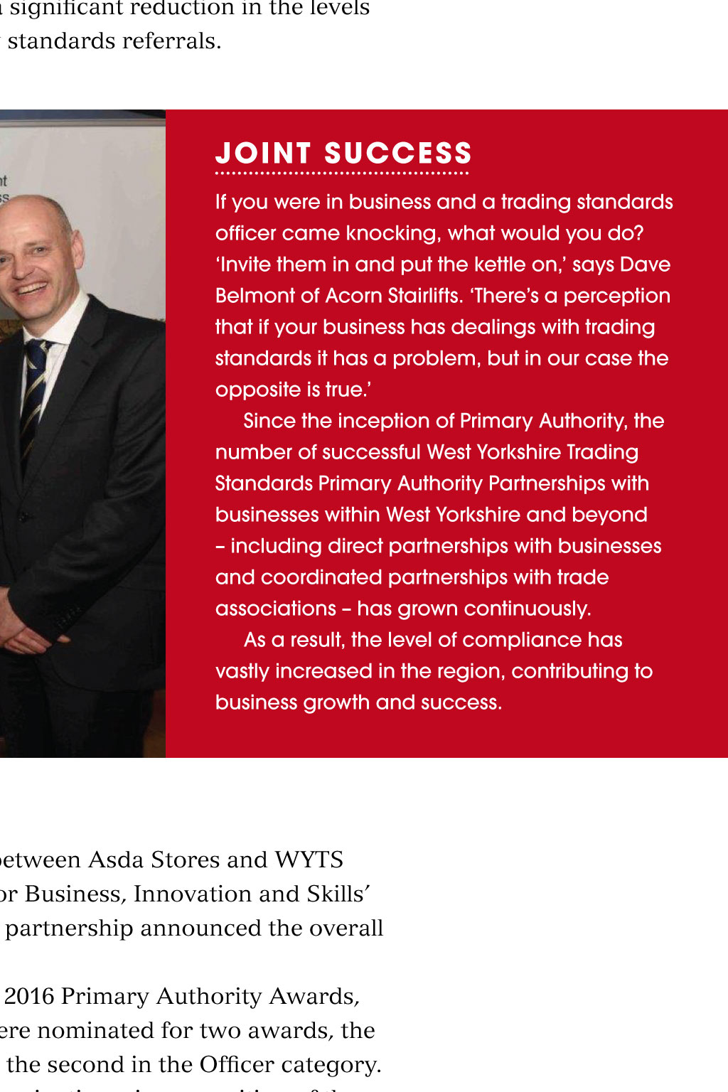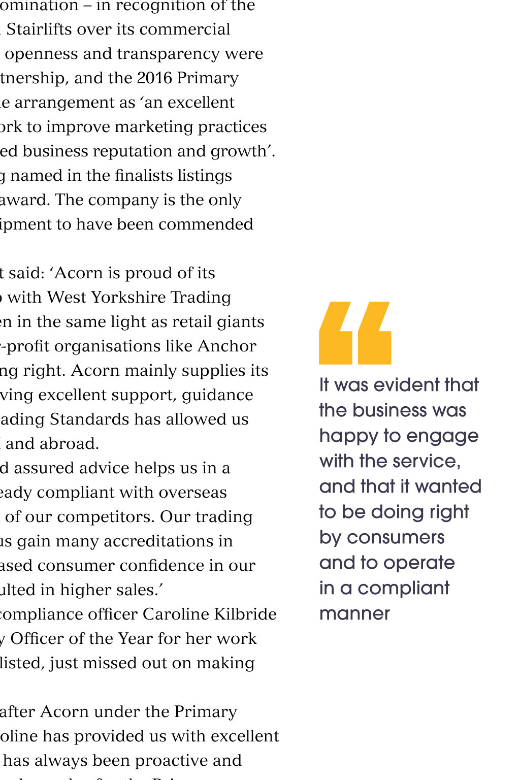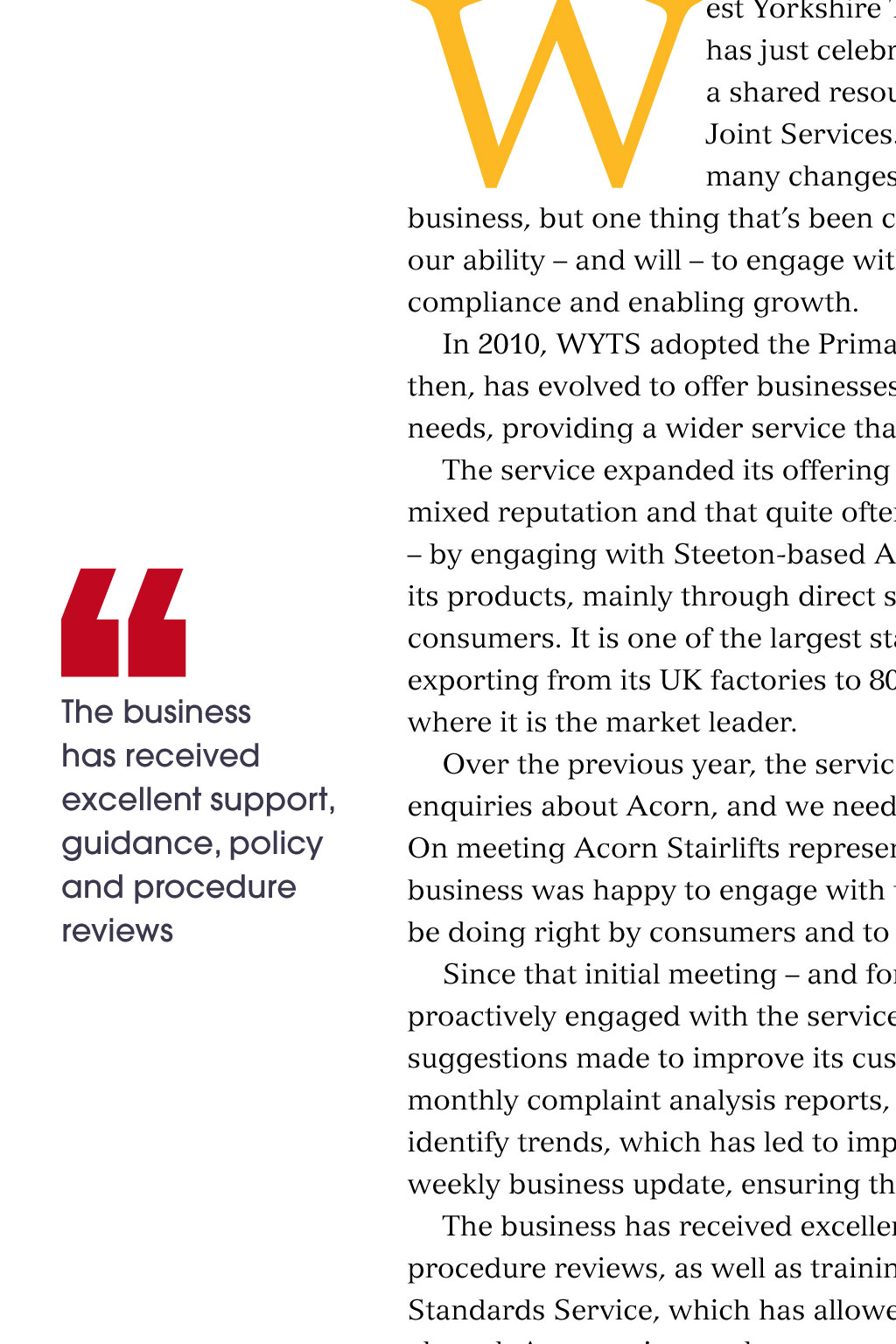 WYTS Primary Authority: Acorn Stairlifts In this feature l partnerships l enabling growth l winning awards In it together Partnering with trading standards has helped a West Yorkshire business Acorn Stairlifts to thrive. Jackie White explains W The business has received excellent support, guidance, policy and procedure reviews est Yorkshire Trading Standards Service (WYTS) has just celebrated its 30th birthday as part of a shared resource offered by West Yorkshire Joint Services. During that time, we have seen many changes to our approach to working with business, but one thing thats been constant throughout has been our ability and will to engage with business at all levels, ensuring compliance and enabling growth. In 2010, WYTS adopted the Primary Authority scheme and, since then, has evolved to offer businesses different packages to meet their needs, providing a wider service than before. The service expanded its offering in 2012 to a sector with a mixed reputation and that quite often lacks consumer confidence by engaging with Steeton-based Acorn Stairlifts. Acorn supplies its products, mainly through direct sales, predominantly to elderly consumers. It is one of the largest stairlift suppliers in the world, exporting from its UK factories to 80 countries, including the USA, where it is the market leader. Over the previous year, the service had received a number of enquiries about Acorn, and we needed to establish the cause. Onmeeting Acorn Stairlifts representatives, it was evident that the business was happy to engage with the service and that it wanted to bedoing right by consumers and to operate in a compliant manner. Since that initial meeting and for the last four years Acorn has proactively engaged with the service and has been receptive to the suggestions made to improve its customer service. We give the business monthly complaint analysis reports, enabling both them and us to identify trends, which has led to improved practice. We also hold a weekly business update, ensuring there is openness and transparency. The business has received excellent support, guidance, policy and procedure reviews, as well as training from West Yorkshire Trading Standards Service, which has allowed it to grow both in the UK and abroad. As a service, we have seen a significant reduction in the levels of consumer complaints and trading standards referrals. JOINT SuCCES S If you were in business and a trading standards officer came knocking, what would you do? Invite them in and put the kettle on, says Dave Belmont of Acorn Stairlifts. Theres a perception that if your business has dealings with trading standards it has a problem, but in our case the opposite is true. Since the inception of Primary Authority, the number of successful West Yorkshire Trading Standards Primary Authority Partnerships with businesses within West Yorkshire and beyond including direct partnerships with businesses and coordinated partnerships with trade associations has grown continuously. As a result, the level of compliance has vastly increased in the region, contributing to business growth and success. Recognition and support In 2014, the successful partnership between Asda Stores and WYTS was recognised at the Department for Business, Innovation and Skills Primary Authority Awards, with the partnership announced the overall winner of the Business category. Further accolades followed at the 2016 Primary Authority Awards, where WYTS and Acorn Stairlifts were nominated for two awards, the first in the Partnership category and the second in the Officer category. In the Partnership category, the nomination in recognition of the advice and support offered to Acorn Stairlifts over its commercial practices said that it was clear that openness and transparency were at the heart of the success of the partnership, and the 2016 Primary Authority Awards panel described the arrangement as an excellent example of how a partnership can work to improve marketing practices of a business, contributing to improved business reputation and growth. The nomination led to Acorn being named in the finalists listings andreceiving a Highly Commended award. The company is the only supplier of stairlifts and mobility equipment to have been commended atthe event. Company secretary Dave Belmont said: Acorn is proud of its customer service and its partnership with West Yorkshire Trading Standards Service. When we are seen in the same light as retail giants such as Asda and Boots, and not-for-profit organisations like Anchor Housing, we must be doing something right. Acorn mainly supplies its stairlifts to elderly consumers. Receiving excellent support, guidance and training from West Yorkshire Trading Standards has allowed us togrow our business both in the UK and abroad. Having a secure home market and assured advice helps us in a number of ways. We find we are already compliant with overseas requirements and this puts us ahead of our competitors. Our trading standards endorsement has helped us gain many accreditations in the past 12 months, which has increased consumer confidence in our business and which, in turn, has resulted in higher sales. In a second category, regulatory compliance officer Caroline Kilbride was nominated as Primary Authority Officer of the Year for her work with Acorn and, despite being shortlisted, just missed out on making the finalists listings. Belmont said: Since first looking after Acorn under the Primary Authority scheme, back in 2012, Caroline has provided us with excellent support, guidance and training. She has always been proactive and supportive. Caroline is an excellent ambassador for the Primary Authority scheme. After the awards success, Belmont accepted an invitation to be a key speaker at the West Yorkshire Joint Services Big 30 Open Day, celebrating 30 years of West Yorkshire Joint Services, of which trading standards is a key component. I was delighted to be asked to speak and hopefully to persuade other deleg