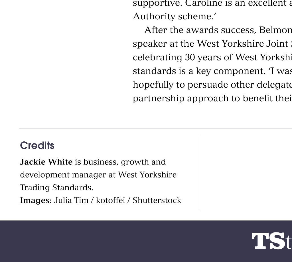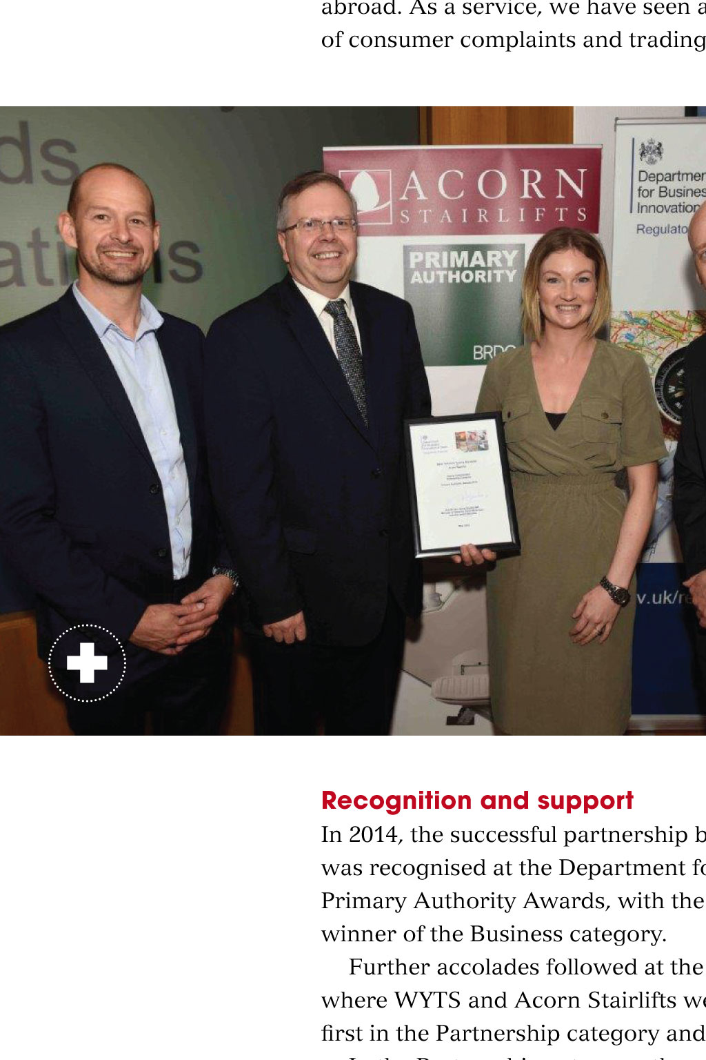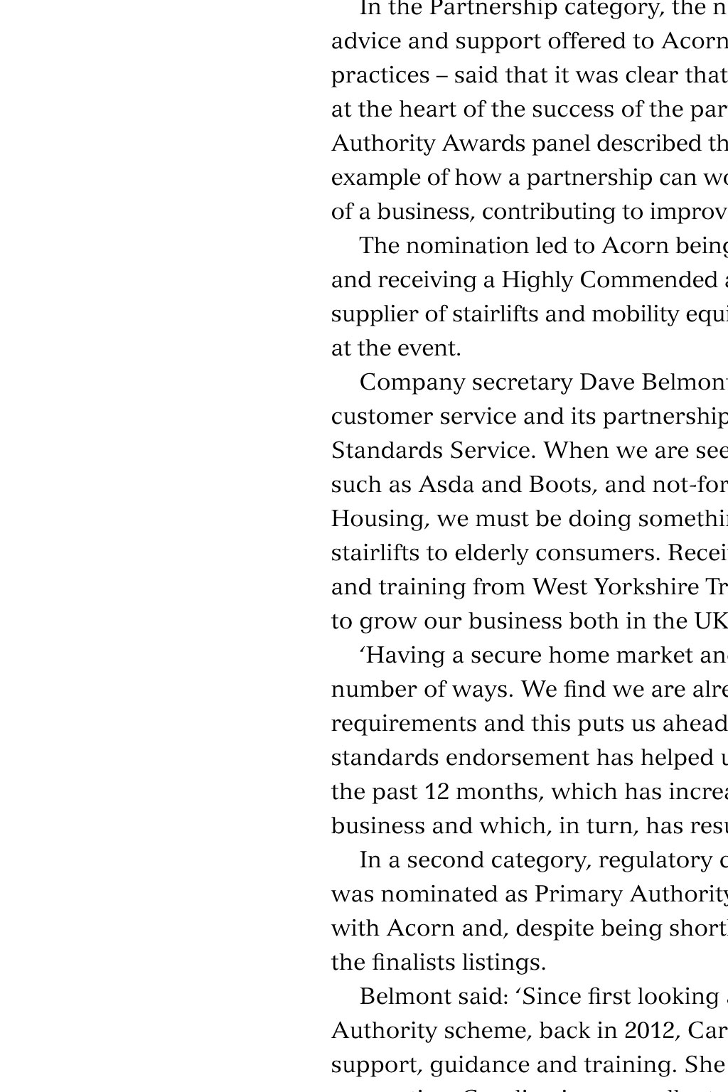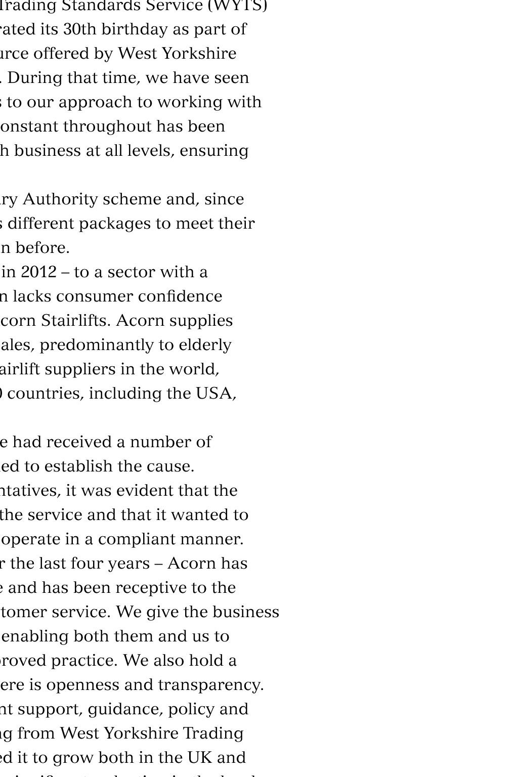 WYTS Primary Authority: Acorn Stairlifts In this feature l partnerships l enabling growth l winning awards In it together Partnering with trading standards has helped a West Yorkshire business Acorn Stairlifts to thrive. Jackie White explains W The business has received excellent support, guidance, policy and procedure reviews est Yorkshire Trading Standards Service (WYTS) has just celebrated its 30th birthday as part of a shared resource offered by West Yorkshire Joint Services. During that time, we have seen many changes to our approach to working with business, but one thing thats been constant throughout has been our ability and will to engage with business at all levels, ensuring compliance and enabling growth. In 2010, WYTS adopted the Primary Authority scheme and, since then, has evolved to offer businesses different packages to meet their needs, providing a wider service than before. The service expanded its offering in 2012 to a sector with a mixed reputation and that quite often lacks consumer confidence by engaging with Steeton-based Acorn Stairlifts. Acorn supplies its products, mainly through direct sales, predominantly to elderly consumers. It is one of the largest stairlift suppliers in the world, exporting from its UK factories to 80 countries, including the USA, where it is the market leader. Over the previous year, the service had received a number of enquiries about Acorn, and we needed to establish the cause. Onmeeting Acorn Stairlifts representatives, it was evident that the business was happy to engage with the service and that it wanted to bedoing right by consumers and to operate in a compliant manner. Since that initial meeting and for the last four years Acorn has proactively engaged with the service and has been receptive to the suggestions made to improve its customer service. We give the business monthly complaint analysis reports, enabling both them and us to identify trends, which has led to improved practice. We also hold a weekly business update, ensuring there is openness and transparency. The business has received excellent support, guidance, policy and procedure reviews, as well as training from West Yorkshire Trading Standards Service, which has allowed it to grow both in the UK and abroad. As a service, we have seen a significant reduction in the levels of consumer complaints and trading standards referrals. JOINT SuCCES S If you were in business and a trading standards officer came knocking, what would you do? Invite them in and put the kettle on, says Dave Belmont of Acorn Stairlifts. Theres a perception that if your business has dealings with trading standards it has a problem, but in our case the opposite is true. Since the inception of Primary Authority, the number of successful West Yorkshire Trading Standards Primary Authority Partnerships with businesses within West Yorkshire and beyond including direct partnerships with businesses and coordinated partnerships with trade associations has grown continuously. As a result, the level of compliance has vastly increased in the region, contributing to business growth and success. Recognition and support In 2014, the successful partnership between Asda Stores and WYTS was recognised at the Department for Business, Innovation and Skills Primary Authority Awards, with the partnership announced the overall winner of the Business category. Further accolades followed at the 2016 Primary Authority Awards, where WYTS and Acorn Stairlifts were nominated for two awards, the first in the Partnership category and the second in the Officer category. In the Partnership category, the nomination in recognition of the advice and support offered to Acorn Stairlifts over its commercial practices said that it was clear that openness and transparency were at the heart of the success of the partnership, and the 2016 Primary Authority Awards panel described the arrangement as an excellent example of how a partnership can work to improve marketing practices of a business, contributing to improved business reputation and growth. The nomination led to Acorn being named in the finalists listings andreceiving a Highly Commended award. The company is the only supplier of stairlifts and mobility equipment to have been commended atthe event. Company secretary Dave Belmont said: Acorn is proud of its customer service and its partnership with West Yorkshire Trading Standards Service. When we are seen in the same light as retail giants such as Asda and Boots, and not-for-profit organisations like Anchor Housing, we must be doing something right. Acorn mainly supplies its stairlifts to elderly consumers. Receiving excellent support, guidance and training from West Yorkshire Trading Standards has allowed us togrow our business both in the UK and abroad. Having a secure home market and assured advice helps us in a number of ways. We find we are already compliant with overseas requirements and this puts us ahead of our competitors. Our trading standards endorsement has helped us gain many accreditations in the past 12 months, which has increased consumer confidence in our business and which, in turn, has resulted in higher sales. In a second category, regulatory compliance officer Caroline Kilbride was nominated as Primary Authority Officer of the Year for her work with Acorn and, despite being shortlisted, just missed out on making the finalists listings. Belmont said: Since first looking after Acorn under the Primary Authority scheme, back in 2012, Caroline has provided us with excellent support, guidance and training. She has always been proactive and supportive. Caroline is an excellent ambassador for the Primary Authority scheme. After the awards success, Belmont accepted an invitation to be a key speaker at the West Yorkshire Joint Services Big 30 Open Day, celebrating 30 years of West Yorkshire Joint Services, of which trading standards is a key component. I was delighted to be asked to speak and hopefully to persuade other deleg