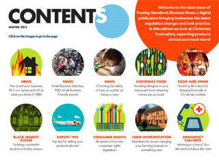 Welcome to the latest issue of Trading Standards Business News, adigital publication bringing businesses the latest regulation changes and best practice. Inthis edition we look at online security, protecting your business from catastrophe and much more! winter 2015 Click on the images to go to the page news Selling hi-viz childrens clothing advice to retailers safe produCts The duty of retailers to sell harmless merchandise news New helpline laws introduced food hygene Why waste-food suppliers need to register with their local Trading Standards Service news Alternative dispute resolution: the Commercial Ombudsman food A round-up of essential safety guidelines Cyber seCurity The risks, and 10 things you need to do to protect your business fsb Enterprises are just as much at risk from fraud as consumers politiCs Are prospects uncertain under the Conservatives? battle box Do you have a plan to stay in business should the worst happen?