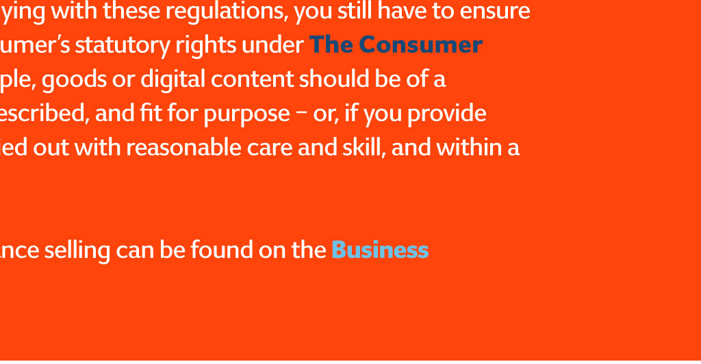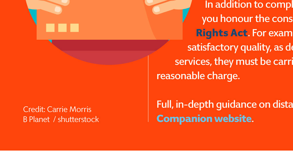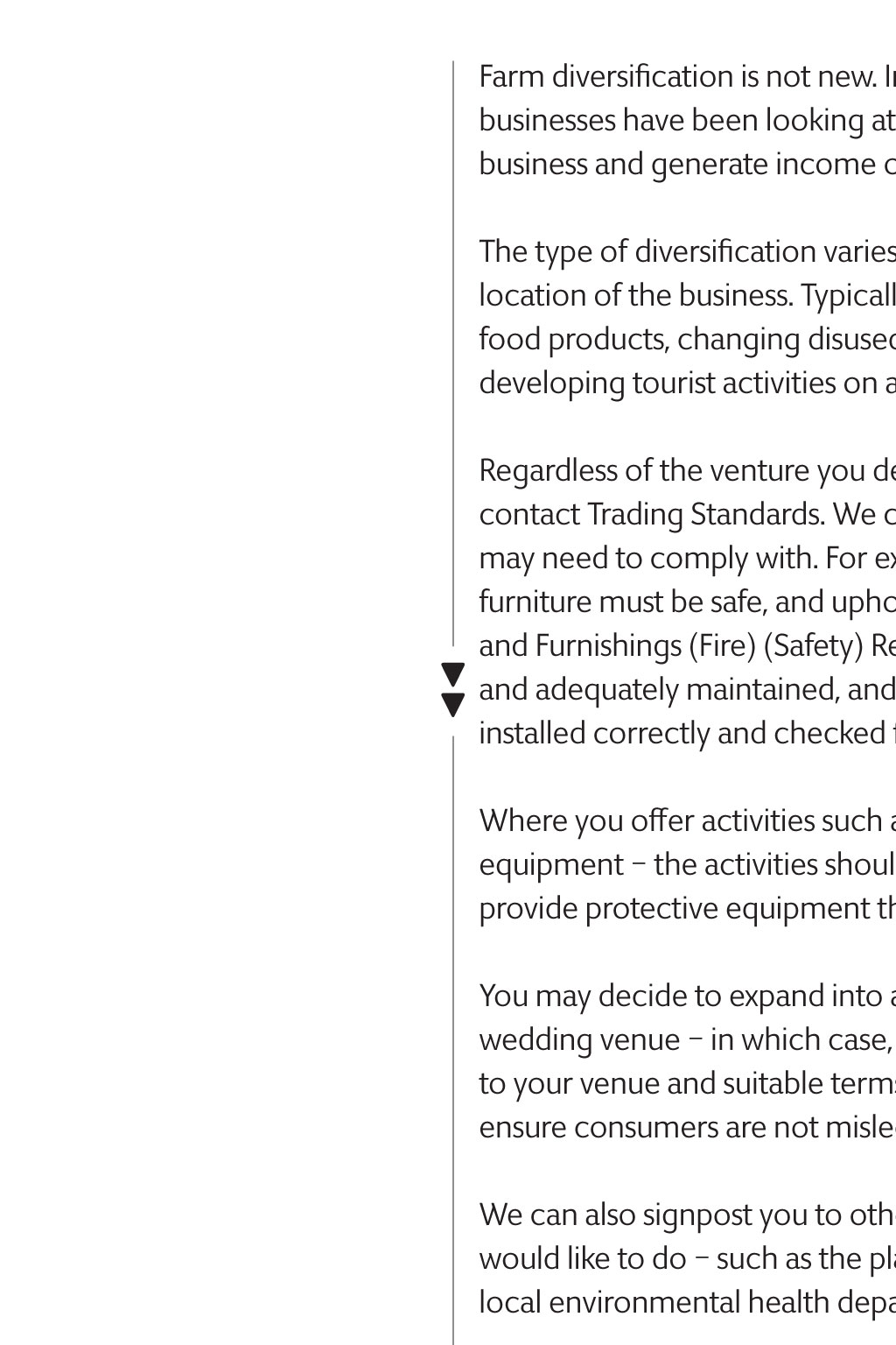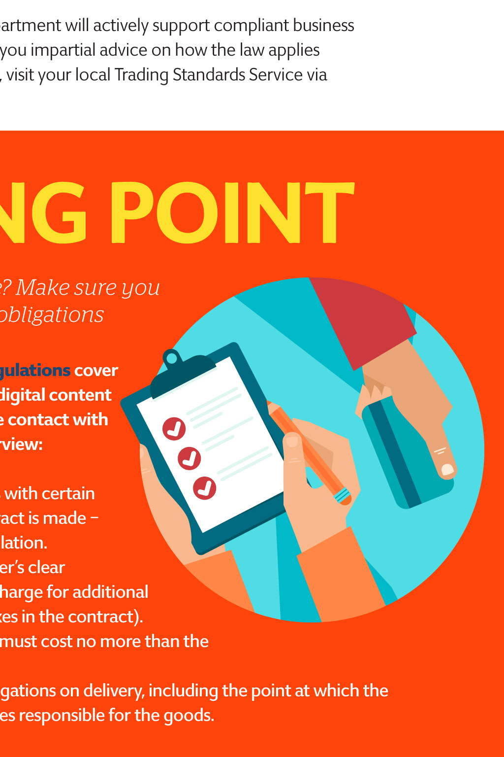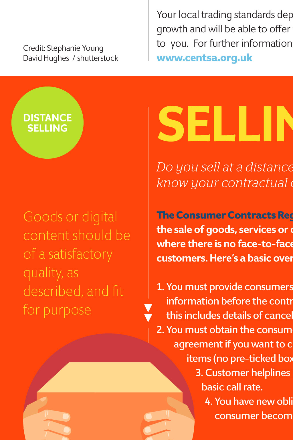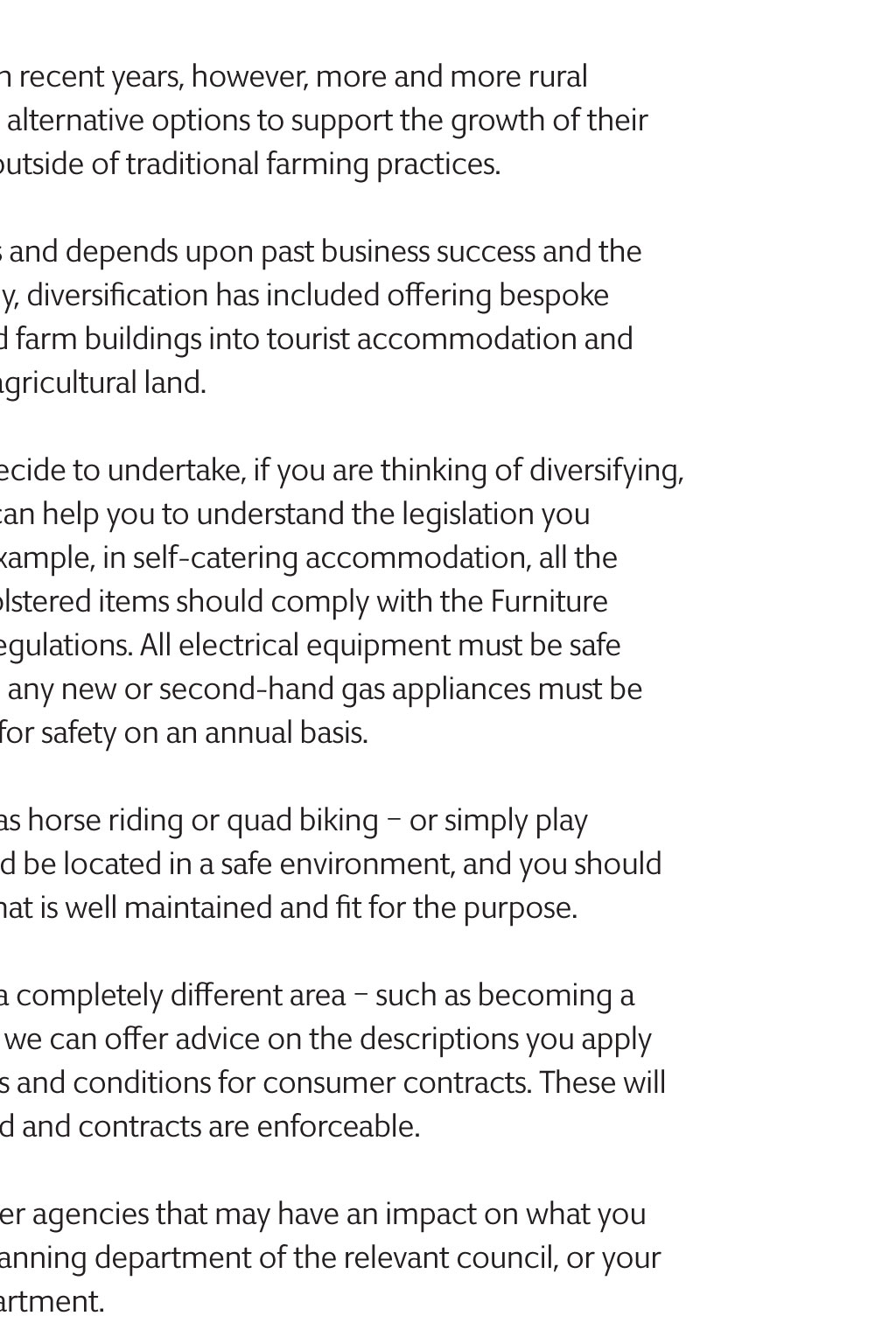 Selling point Do you sell at a distance? Make sure you know your contractual obligations The Consumer Contracts Regulations cover the sale of goods, services or digital content where there is no face-to-face contact with customers. Here’s a basic overview: 1. You must provide consumers with certain information before the contract is made – this includes details of cancellation. 2. You must obtain the consumer’s clear agreement if you want to charge for additional items (no pre-ticked boxes in the contract). 3. Customer helplines must cost no more than the basic call rate. 4. You have new obligations on delivery, including the point at which the consumer becomes responsible for the goods. In addition to complying with these regulations, you still have to ensure you honour the consumer’s statutory rights under The Consumer Rights Act. For example, goods or digital content should be of a satisfactory quality, as described, and fit for purpose – or, if you provide services, they must be carried out with reasonable care and skill, and within a reasonable charge. Full, in-depth guidance on distance selling can be found on the Business Companion website. Distance selling Winter 2015 Diversification Farm diversification is not new. In recent years, however, more and more rural businesses have been looking at alternative options to support the growth of their business and generate income outside of traditional farming practices. The type of diversification varies and depends upon past business success and the location of the business. Typically, diversification has included offering bespoke food products, changing disused farm buildings into tourist accommodation and developing tourist activities on agricultural land. Regardless of the venture you decide to undertake, if you are thinking of diversifying, contact Trading Standards. We can help you to understand the legislation you may need to comply with. For example, in self-catering accommodation, all the furniture must be safe, and upholstered items should comply with the Furniture and Furnishings (Fire) (Safety) Regulations. All electrical equipment must be safe and adequately maintained, and any new or second-hand gas appliances must be installed correctly and checked for safety on an annual basis. Where you offer activities such as horse riding or quad biking – or simply play equipment – the activities should be located in a safe environment, and you should provide protective equipment that is well maintained and fit for the purpose. You may decide to expand into a completely different area – such as becoming a wedding venue – in which case, we can offer advice on the descriptions you apply to your venue and suitable terms and conditions for consumer contracts. These will ensure consumers are not misled and contracts are enforceable. We can also signpost you to other agencies that may have an impact on what you would like to do – such as the planning department of the relevant council, or your local environmental health department. Your local trading standards department will actively support compliant business growth and will be able to offer you impartial advice on how the law applies to you. For further information, visit your local Trading Standards Service via www.centsa.org.uk Credit: Stephanie Young David Hughes / shutterstock Field of dreams Changing your business from farming to something completely different can make sense financially, but there’s lots you need to know Goods or digital content should be of a satisfactory quality, as described, and fit for purpose Credit: Carrie Morris B Planet / shutterstock.