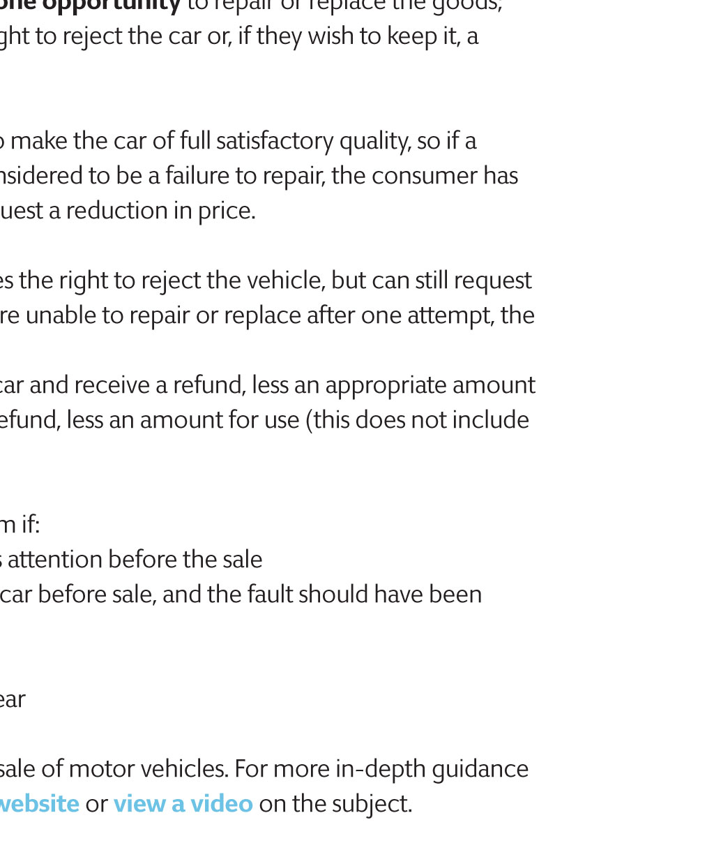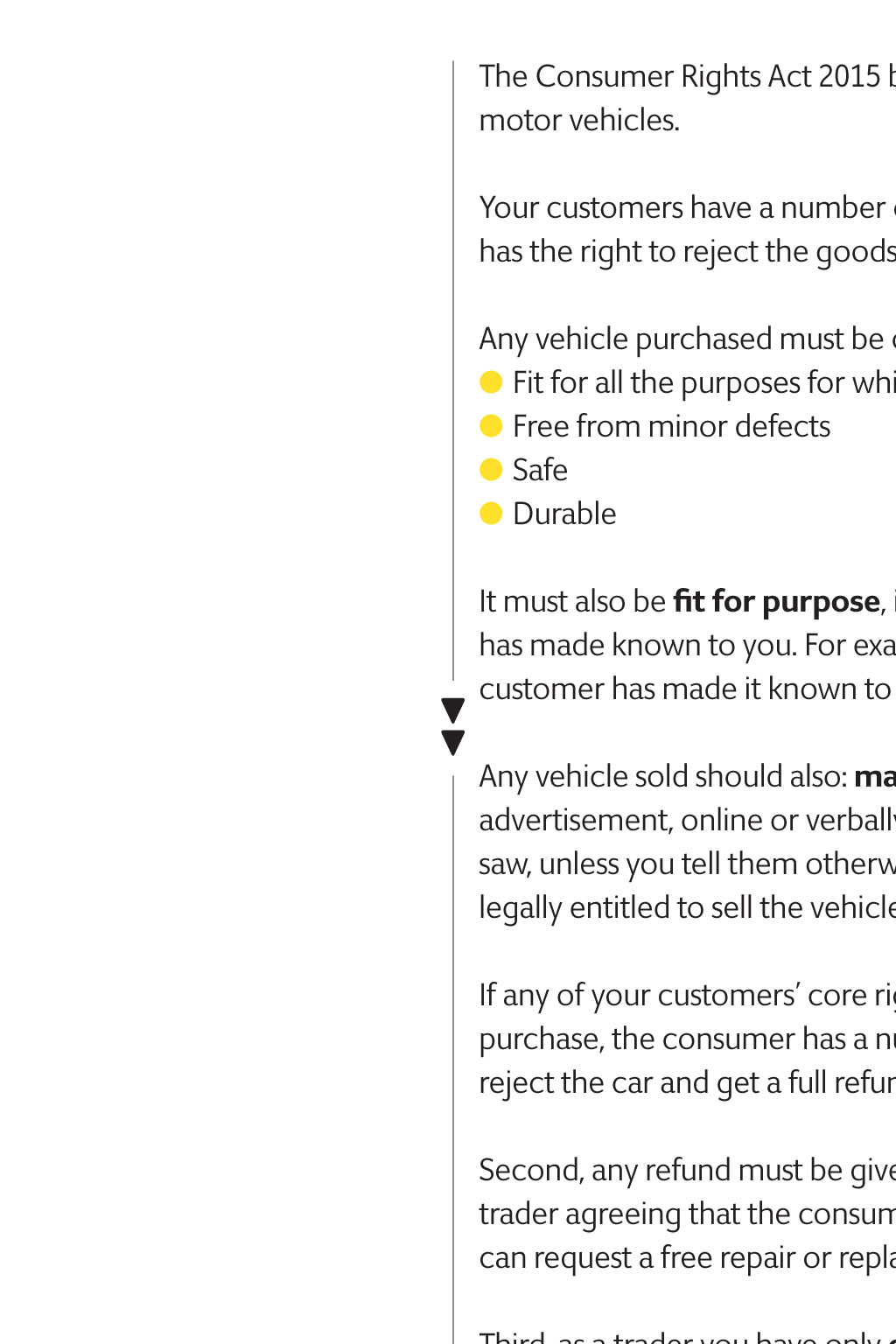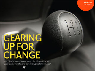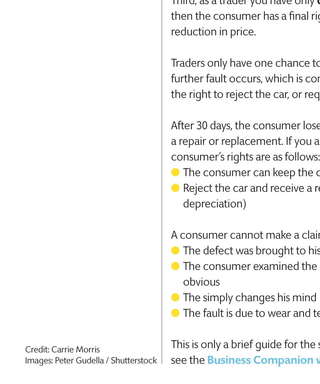SPRING 2016 CAR DEALERS GEARING UP FOR CHANGE With the introduction of new rules, do you know your legal obligations when selling motor vehicles? The Consumer Rights Act 2015 brought changes to the law in relation to the sale of motor vehicles. Your customers have a number of core rights. If these are breached, the consumer has the right to reject the goods in appropriate circumstances. Any vehicle purchased must be of satisfactory quality. This includes: l Fit for all the purposes for which a vehicle of that kind is usually supplied l Free from minor defects l Safe l Durable It must also be t for purpose, including for a particular purpose the customer has made known to you. For example, it must be possible to t a roof rack if the customer has made it known to you that this is what they require from the vehicle. Any vehicle sold should also: match any description given, whether by advertisement, online or verbally; and match any model that they examined or saw, unless you tell them otherwise. In addition, a trader should ensure that they are legally entitled to sell the vehicle and that it has no outstanding nance on it. If any of your customers core rights are breached within the rst 30 days of a purchase, the consumer has a number of rights. First, in the short term, they can reject the car and get a full refund and all associated costs. Second, any refund must be given without delay and, in any event, within 14 days of a trader agreeing that the consumer is entitled to a refund. Alternatively, the consumer can request a free repair or replacement. Third, as a trader you have only one opportunity to repair or replace the goods; then the consumer has a nal right to reject the car or, if they wish to keep it, a reduction in price. Traders only have one chance to make the car of full satisfactory quality, so if a further fault occurs, which is considered to be a failure to repair, the consumer has the right to reject the car, or request a reduction in price. After 30 days, the consumer loses the right to reject the vehicle, but can still request a repair or replacement. If you are unable to repair or replace after one attempt, the consumers rights are as follows: l The consumer can keep the car and receive a refund, less an appropriate amount l Reject the car and receive a refund, less an amount for use (this does not include depreciation) A consumer cannot make a claim if: l The defect was brought to his attention before the sale l The consumer examined the car before sale, and the fault should have been obvious l The simply changes his mind l The fault is due to wear and tear Credit: Carrie Morris Images: Peter Gudella / Shutterstock This is only a brief guide for the sale of motor vehicles. For more in-depth guidance see the Business Companion website or view a video on the subject.