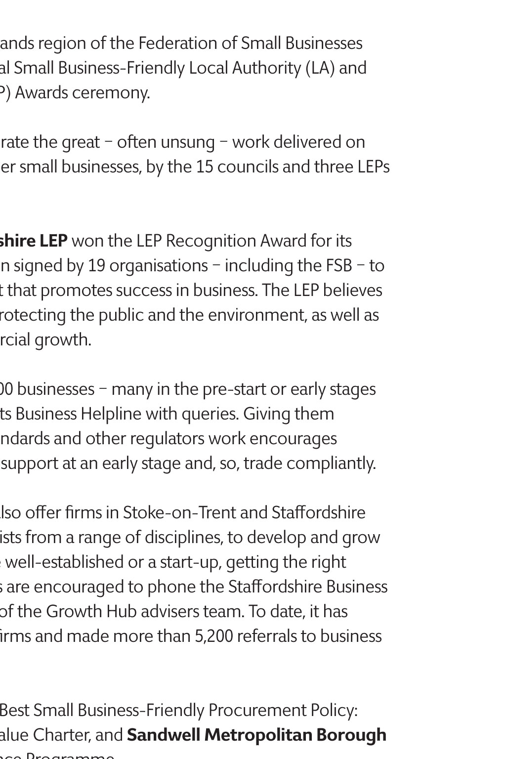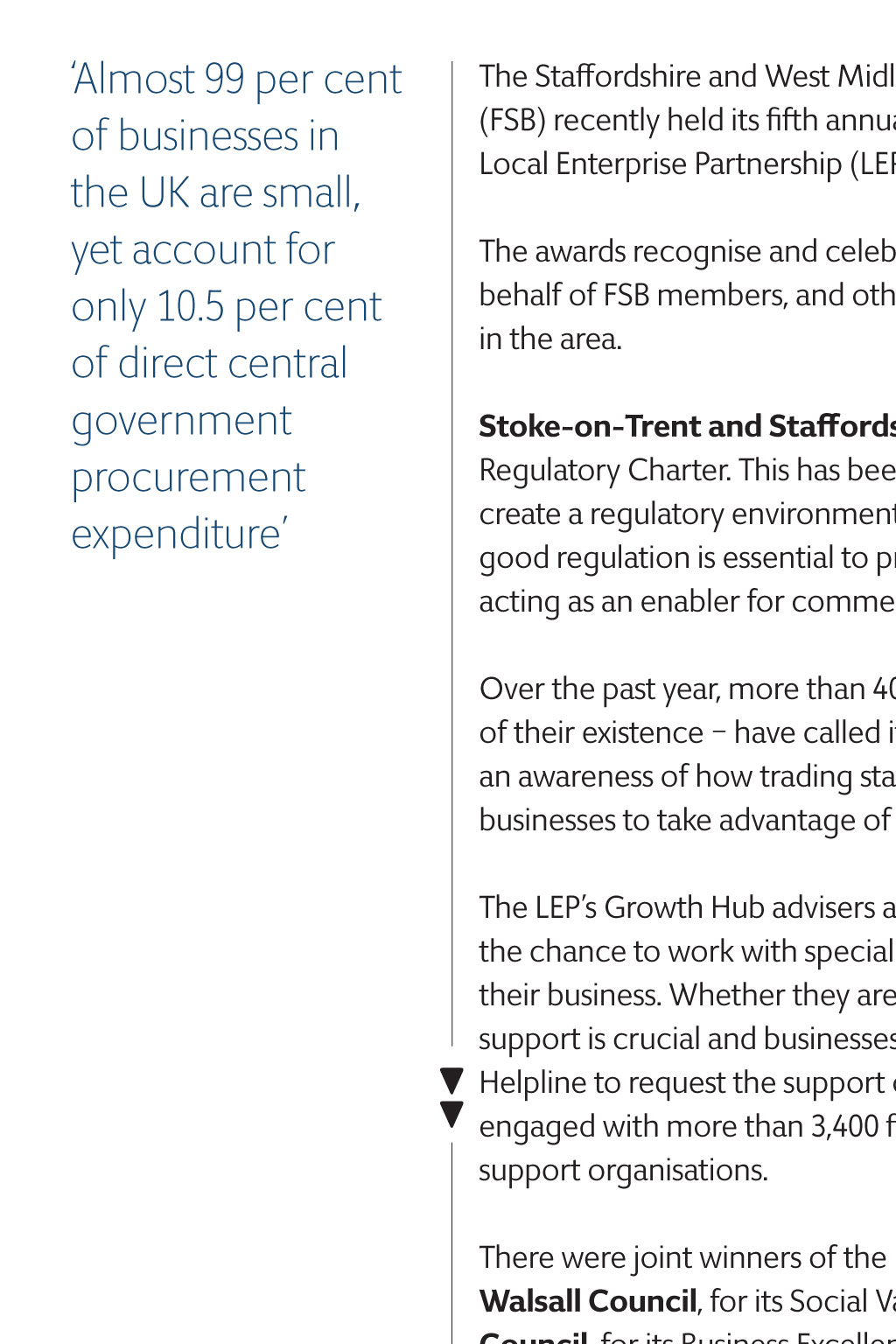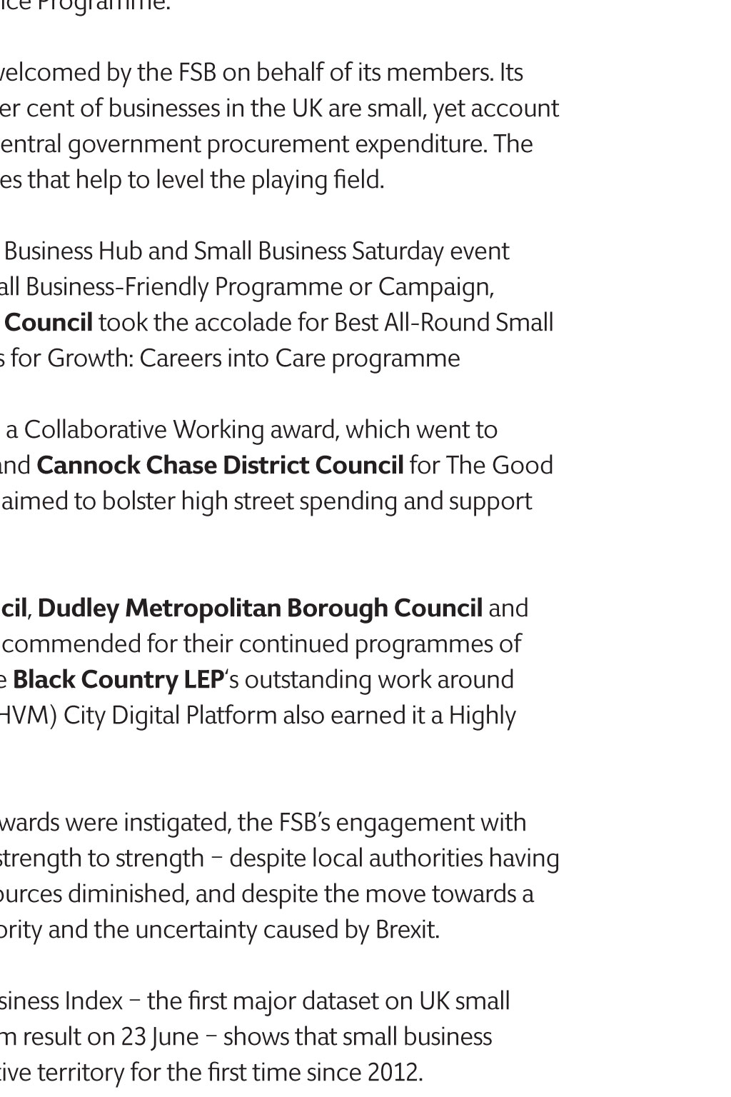 WInTer 2016 LoCAL AuTHoRITY AWARdS And the winner is... Local councils and enterprise partnerships have been recognised for their support of small businesses Almost 99 per cent of businesses in the UK are small, yet account for only 10.5 per cent of direct central government procurement expenditure The Staffordshire and West Midlands region of the Federation of Small Businesses (FSB) recently held its fifth annual Small Business-Friendly Local Authority (LA) and Local Enterprise Partnership (LEP) Awards ceremony. The awards recognise and celebrate the great often unsung work delivered on behalf of FSB members, and other small businesses, by the 15 councils and three LEPs in the area. Stoke-on-Trent and Staffordshire leP won the LEP Recognition Award for its Regulatory Charter. This has been signed by 19 organisations including the FSB to create a regulatory environment that promotes success in business. The LEP believes good regulation is essential to protecting the public and the environment, as well as acting as an enabler for commercial growth. over the past year, more than 400 businesses many in the pre-start or early stages of their existence have called its Business Helpline with queries. Giving them an awareness of how trading standards and other regulators work encourages businesses to take advantage of support at an early stage and, so, trade compliantly. The LEPs Growth Hub advisers also offer firms in Stoke-on-Trent and Staffordshire the chance to work with specialists from a range of disciplines, to develop and grow their business. Whether they are well-established or a start-up, getting the right support is crucial and businesses are encouraged to phone the Staffordshire Business Helpline to request the support of the Growth Hub advisers team. To date, it has engaged with more than 3,400 firms and made more than 5,200 referrals to business support organisations. There were joint winners of the Best Small Business-Friendly Procurement Policy: Walsall council, for its Social Value Charter, and Sandwell Metropolitan Borough council, for its Business Excellence Programme. These schemes are very much welcomed by the FSB on behalf of its members. Its research shows that almost 99 per cent of businesses in the uK are small, yet account for only 10.5 per cent of direct central government procurement expenditure. The federation applauds any measures that help to level the playing field. South Staffordshire councils Business Hub and Small Business Saturday event were recognised as the Best Small Business-Friendly Programme or Campaign, while city of Wolverhampton council took the accolade for Best All-Round Small Business Friendliness, for its Skills for Growth: Careers into Care programme This year, the FSB also presented a Collaborative Working award, which went to South Staffordshire council and cannock chase district council for The Good Life deals App. The joint project aimed to bolster high street spending and support local retailers. During the five years since the awards were instigated, the FSBs engagement with critical partners has gone from strength to strength cannock chase district council, dudley Metropolitan Borough council and Walsall council were all highly commended for their continued programmes of support for small businesses. The Black country lePs outstanding work around the High Value Manufacturing (HVM) City digital Platform also earned it a Highly Commended award. during the five years since the awards were instigated, the FSBs engagement with critical partners has gone from strength to strength despite local authorities having their budgets squeezed and resources diminished, and despite the move towards a West Midlands Combined Authority and the uncertainty caused by Brexit. The FSBs third-quarter Small Business Index the first major dataset on uK small business since the Eu referendum result on 23 June shows that small business confidence has fallen into negative territory for the first time since 2012. In the West Midlands, confidence has fallen from +34.6 in Q3 2015 to +3.1 in Q3 2016 the second-largest annual drop in confidence on record. More positively, there has been a boost in the number of small businesses increasing their headcount this quarter a reminder that high employment levels can be sustained and increased by supporting small businesses. The proportion of small firms looking to grow over the next 12 months has increased this quarter, to 55.3 per cent the highest figure since the end of 2015 while the share of those expecting to downsize, close or sell on has fallen this quarter, to 10.9%. Credit: Karen Woolley, of the Federation of Small Businesses Images: Feaspb /Shutterstock Again, this demonstrates that the support offered by FSB partners to its members and other small businesses has never been more crucial if businesses are not only to survive, but thrive. For further information please contact your local Trading Standards Service