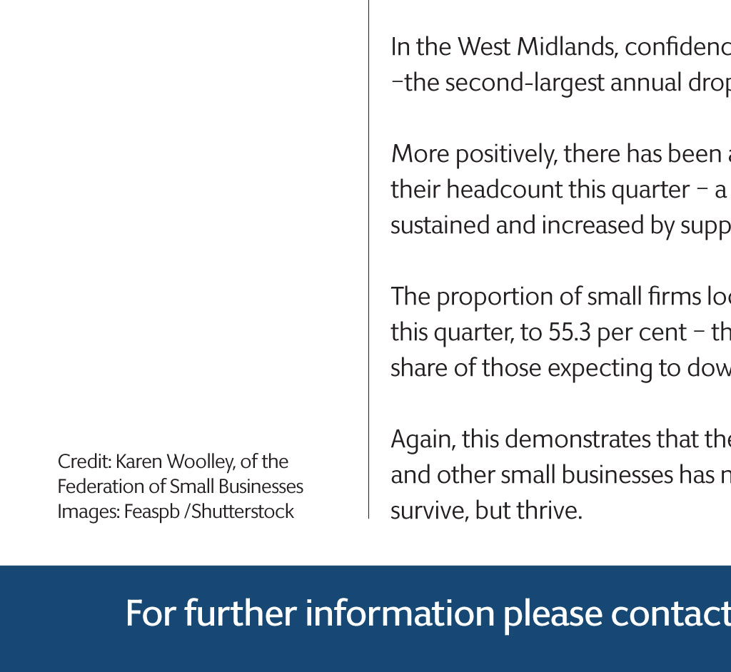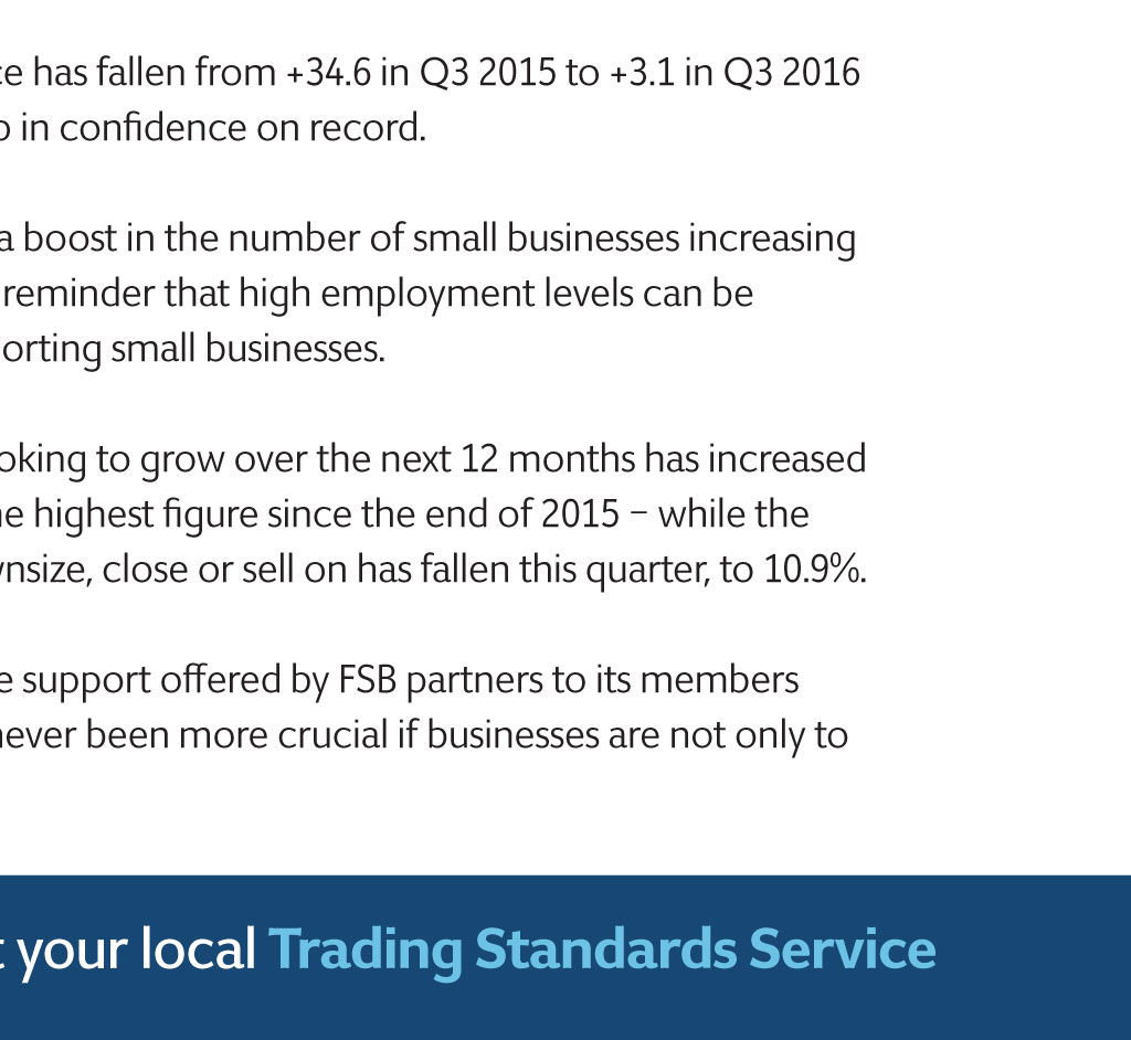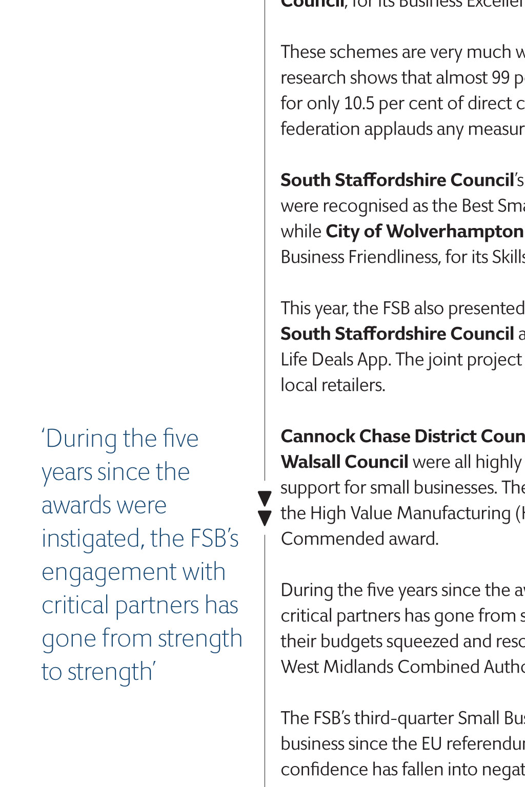 WInTer 2016 LoCAL AuTHoRITY AWARdS And the winner is... Local councils and enterprise partnerships have been recognised for their support of small businesses Almost 99 per cent of businesses in the UK are small, yet account for only 10.5 per cent of direct central government procurement expenditure The Staffordshire and West Midlands region of the Federation of Small Businesses (FSB) recently held its fifth annual Small Business-Friendly Local Authority (LA) and Local Enterprise Partnership (LEP) Awards ceremony. The awards recognise and celebrate the great often unsung work delivered on behalf of FSB members, and other small businesses, by the 15 councils and three LEPs in the area. Stoke-on-Trent and Staffordshire leP won the LEP Recognition Award for its Regulatory Charter. This has been signed by 19 organisations including the FSB to create a regulatory environment that promotes success in business. The LEP believes good regulation is essential to protecting the public and the environment, as well as acting as an enabler for commercial growth. over the past year, more than 400 businesses many in the pre-start or early stages of their existence have called its Business Helpline with queries. Giving them an awareness of how trading standards and other regulators work encourages businesses to take advantage of support at an early stage and, so, trade compliantly. The LEPs Growth Hub advisers also offer firms in Stoke-on-Trent and Staffordshire the chance to work with specialists from a range of disciplines, to develop and grow their business. Whether they are well-established or a start-up, getting the right support is crucial and businesses are encouraged to phone the Staffordshire Business Helpline to request the support of the Growth Hub advisers team. To date, it has engaged with more than 3,400 firms and made more than 5,200 referrals to business support organisations. There were joint winners of the Best Small Business-Friendly Procurement Policy: Walsall council, for its Social Value Charter, and Sandwell Metropolitan Borough council, for its Business Excellence Programme. These schemes are very much welcomed by the FSB on behalf of its members. Its research shows that almost 99 per cent of businesses in the uK are small, yet account for only 10.5 per cent of direct central government procurement expenditure. The federation applauds any measures that help to level the playing field. South Staffordshire councils Business Hub and Small Business Saturday event were recognised as the Best Small Business-Friendly Programme or Campaign, while city of Wolverhampton council took the accolade for Best All-Round Small Business Friendliness, for its Skills for Growth: Careers into Care programme This year, the FSB also presented a Collaborative Working award, which went to South Staffordshire council and cannock chase district council for The Good Life deals App. The joint project aimed to bolster high street spending and support local retailers. During the five years since the awards were instigated, the FSBs engagement with critical partners has gone from strength to strength cannock chase district council, dudley Metropolitan Borough council and Walsall council were all highly commended for their continued programmes of support for small businesses. The Black country lePs outstanding work around the High Value Manufacturing (HVM) City digital Platform also earned it a Highly Commended award. during the five years since the awards were instigated, the FSBs engagement with critical partners has gone from strength to strength despite local authorities having their budgets squeezed and resources diminished, and despite the move towards a West Midlands Combined Authority and the uncertainty caused by Brexit. The FSBs third-quarter Small Business Index the first major dataset on uK small business since the Eu referendum result on 23 June shows that small business confidence has fallen into negative territory for the first time since 2012. In the West Midlands, confidence has fallen from +34.6 in Q3 2015 to +3.1 in Q3 2016 the second-largest annual drop in confidence on record. More positively, there has been a boost in the number of small businesses increasing their headcount this quarter a reminder that high employment levels can be sustained and increased by supporting small businesses. The proportion of small firms looking to grow over the next 12 months has increased this quarter, to 55.3 per cent the highest figure since the end of 2015 while the share of those expecting to downsize, close or sell on has fallen this quarter, to 10.9%. Credit: Karen Woolley, of the Federation of Small Businesses Images: Feaspb /Shutterstock Again, this demonstrates that the support offered by FSB partners to its members and other small businesses has never been more crucial if businesses are not only to survive, but thrive. For further information please contact your local Trading Standards Service