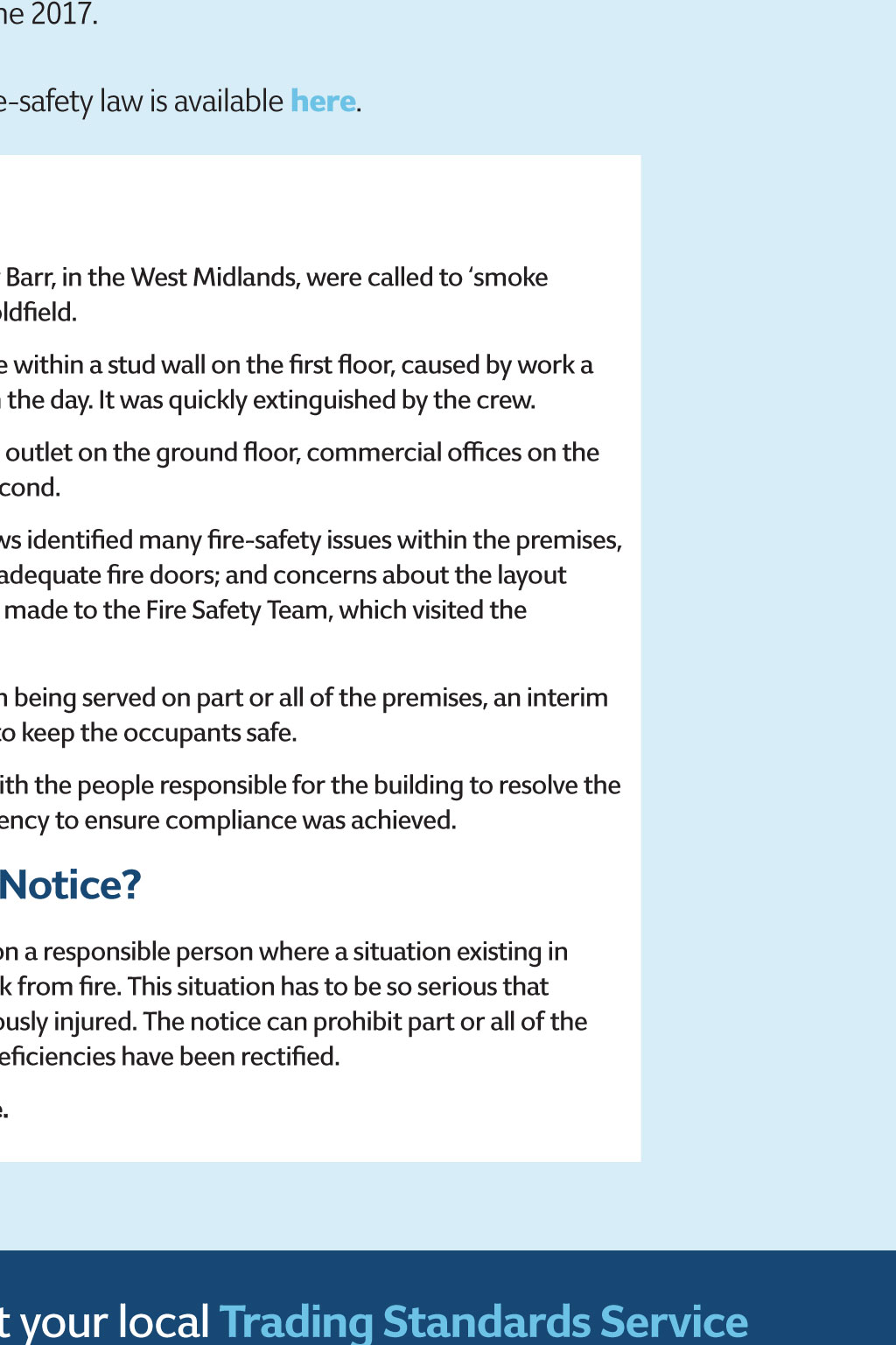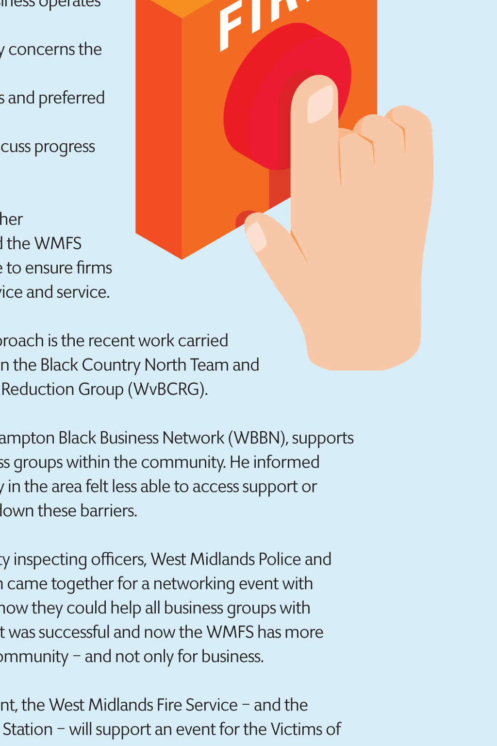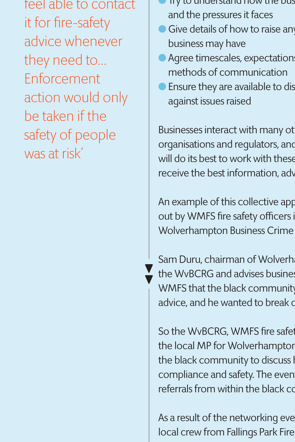 Summer 2017 WMFS Helping businesses to grow safely West Midlands Fire Service aims to contribute to the regions economic prosperity by helping enterprises to stay safe from fire through direct advice and support. Heres what business people can expect from the service West Midlands Fire Service (WMFS) wants local businesses to be successful. By working with community leaders and groups in the region, it hopes to establish and maintain trust with local firms, with a view to helping them achieve compliant, safe properties. It wants business people to feel able to contact it for fire-safety advice whenever they need to, and promises that they will always receive an efficient and professional service. Enforcement action would only be taken if the safety of people was at risk. The WMFS says its team of officers will: The WMFS wants businesspeople to feel able to contact it for fire-safety advice whenever they need to Enforcement action would only be taken if the safetyofpeople wasat risk l Be courteous and polite l Identify themselves by name and provide their contact details l Try to understand how the business operates and the pressures it faces l Give details of how to raise any concerns the business may have l Agree timescales, expectations and preferred methods of communication l Ensure they are available to discuss progress against issues raised Businesses interact with many other organisations and regulators, and the WMFS will do its best to work with these to ensure firms receive the best information, advice and service. An example of this collective approach is the recent work carried out by WMFS fire safety officers in the Black Country North Team and Wolverhampton Business Crime Reduction Group (WvBCRG). Sam duru, chairman of Wolverhampton Black Business Network (WBBN), supports the WvBCRG and advises business groups within the community. He informed WMFS that the black community in the area felt less able to access support or advice, and he wanted to break down these barriers. So the WvBCRG, WMFS fire safety inspecting officers, West Midlands Police and the local MP for Wolverhampton came together for a networking event with the black community to discuss how they could help all business groups with compliance and safety. The event was successful and now the WMFS has more referrals from within the black community and not only for business. As a result of the networking event, the West Midlands Fire Service and the local crew from Fallings Park Fire Station will support an event for the Victims of domestic Abuse Group on 17 June 2017. Information and guidance on fire-safety law is available here. CaSe Study fire crews from erdington and Perry Barr, in the West midlands, were called to smoke issuing from a building in sutton Coldfield. on arrival, they identified a small fire within a stud wall on the first floor, caused by work a contractor had carried out earlier in the day. it was quickly extinguished by the crew. the property comprised a fast-food outlet on the ground floor, commercial offices on the first level and a private flat on the second. after further investigations, the crews identified many fire-safety issues within the premises, including: a lack of fire detection; inadequate fire doors; and concerns about the layout between user groups. a referral was made to the fire safety team, which visited the premises to confirm the issues. to prevent a Prohibition notice from being served on part or all of the premises, an interim fire-detection system was installed to keep the occupants safe. fire safety officers worked closely with the people responsible for the building to resolve the other issues, and with the letting agency to ensure compliance was achieved. What is a prohibition notice? a Prohibition notice can be served on a responsible person where a situation existing in a workplace puts peoples lives at risk from fire. this situation has to be so serious that someone is likely to be killed or seriously injured. the notice can prohibit part or all of the building from being used until the deficiencies have been rectified. Credit: Leanne orton Images: iStock.com / jcarillet for further information, click here. for further information, please contact your local trading Standards Service