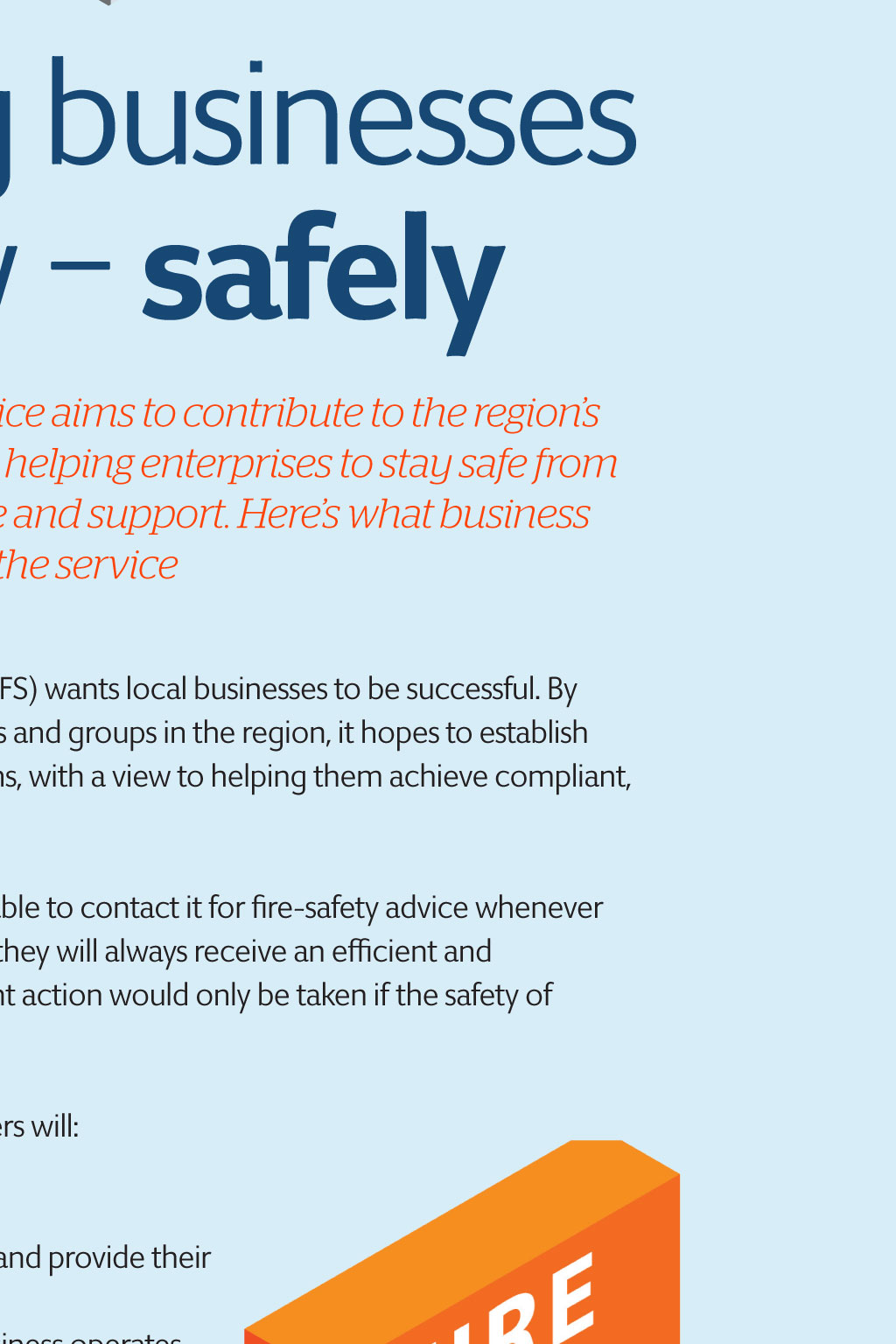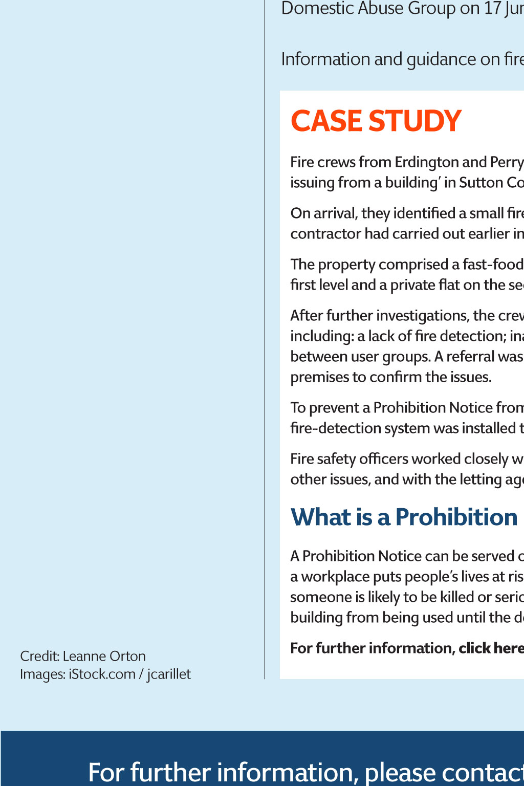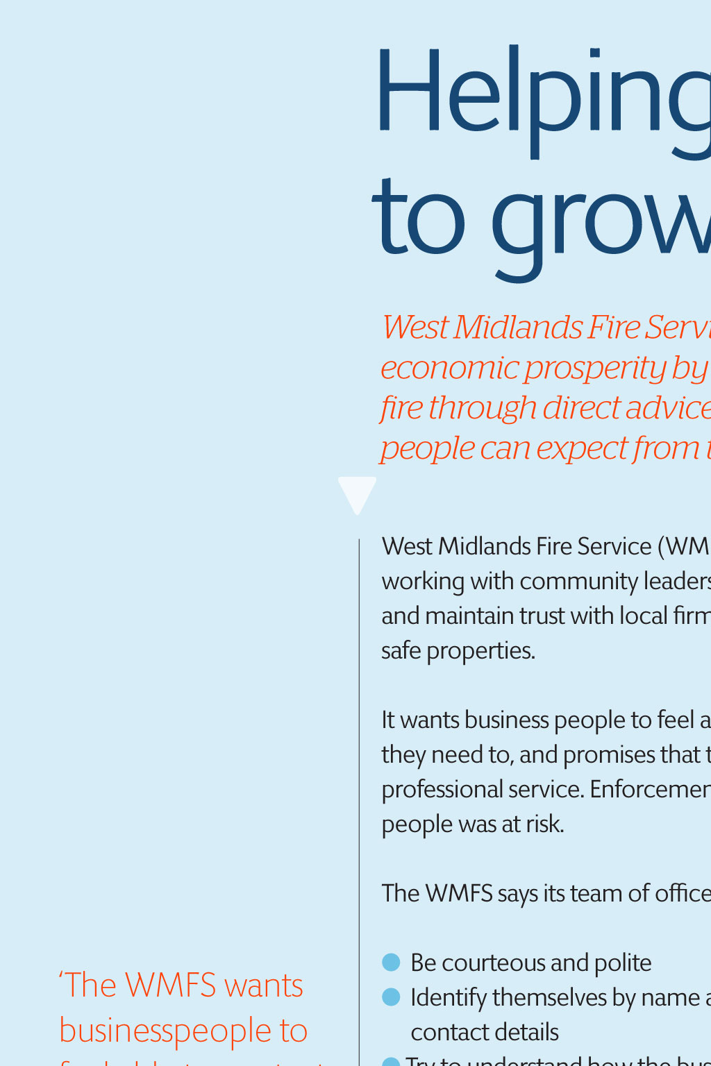 Summer 2017 WMFS Helping businesses to grow safely West Midlands Fire Service aims to contribute to the regions economic prosperity by helping enterprises to stay safe from fire through direct advice and support. Heres what business people can expect from the service West Midlands Fire Service (WMFS) wants local businesses to be successful. By working with community leaders and groups in the region, it hopes to establish and maintain trust with local firms, with a view to helping them achieve compliant, safe properties. It wants business people to feel able to contact it for fire-safety advice whenever they need to, and promises that they will always receive an efficient and professional service. Enforcement action would only be taken if the safety of people was at risk. The WMFS says its team of officers will: The WMFS wants businesspeople to feel able to contact it for fire-safety advice whenever they need to Enforcement action would only be taken if the safetyofpeople wasat risk l Be courteous and polite l Identify themselves by name and provide their contact details l Try to understand how the business operates and the pressures it faces l Give details of how to raise any concerns the business may have l Agree timescales, expectations and preferred methods of communication l Ensure they are available to discuss progress against issues raised Businesses interact with many other organisations and regulators, and the WMFS will do its best to work with these to ensure firms receive the best information, advice and service. An example of this collective approach is the recent work carried out by WMFS fire safety officers in the Black Country North Team and Wolverhampton Business Crime Reduction Group (WvBCRG). Sam duru, chairman of Wolverhampton Black Business Network (WBBN), supports the WvBCRG and advises business groups within the community. He informed WMFS that the black community in the area felt less able to access support or advice, and he wanted to break down these barriers. So the WvBCRG, WMFS fire safety inspecting officers, West Midlands Police and the local MP for Wolverhampton came together for a networking event with the black community to discuss how they could help all business groups with compliance and safety. The event was successful and now the WMFS has more referrals from within the black community and not only for business. As a result of the networking event, the West Midlands Fire Service and the local crew from Fallings Park Fire Station will support an event for the Victims of domestic Abuse Group on 17 June 2017. Information and guidance on fire-safety law is available here. CaSe Study fire crews from erdington and Perry Barr, in the West midlands, were called to smoke issuing from a building in sutton Coldfield. on arrival, they identified a small fire within a stud wall on the first floor, caused by work a contractor had carried out earlier in the day. it was quickly extinguished by the crew. the property comprised a fast-food outlet on the ground floor, commercial offices on the first level and a private flat on the second. after further investigations, the crews identified many fire-safety issues within the premises, including: a lack of fire detection; inadequate fire doors; and concerns about the layout between user groups. a referral was made to the fire safety team, which visited the premises to confirm the issues. to prevent a Prohibition notice from being served on part or all of the premises, an interim fire-detection system was installed to keep the occupants safe. fire safety officers worked closely with the people responsible for the building to resolve the other issues, and with the letting agency to ensure compliance was achieved. What is a prohibition notice? a Prohibition notice can be served on a responsible person where a situation existing in a workplace puts peoples lives at risk from fire. this situation has to be so serious that someone is likely to be killed or seriously injured. the notice can prohibit part or all of the building from being used until the deficiencies have been rectified. Credit: Leanne orton Images: iStock.com / jcarillet for further information, click here. for further information, please contact your local trading Standards Service