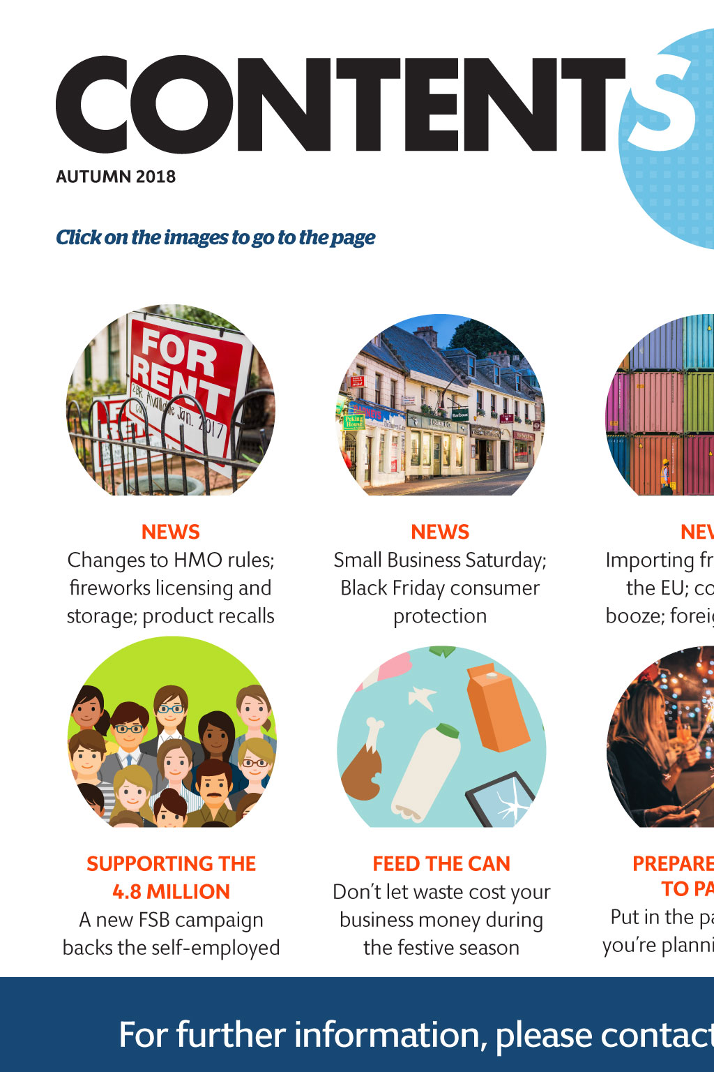 Welcome to the latest issue of Trading Standards Business News, a digital publication bringing businesses details of current regulation changes and best practice. In this edition: play fair online; #thinkselfemployed; and prepare for the festive season AUTUMN 2018 Click on the images to go to the page NEWS Changes to HMO rules; fireworks licensing and storage; product recalls NEWS Small Business Saturday; Black Friday consumer protection NEWS Importing from outside the EU; counterfeit booze; foreign labelling DIGITAL FAIRNESS CMA urges online businesses to check their terms and conditions CELEBRATING SUCCESS Winners of the FSBs Local Authority Small Business Friendly Awards SUPPORTING THE 4.8 MILLION A new FSB campaign backs the self-employed FEED THE CAN Dont let waste cost your business money during the festive season PREPARE (WELL) TO PARTY! Put in the paperwork if youre planning an event BE SAVVY ABOUT SEASONAL MENUS Allergens can kill, so stay alert to food dangers RISE ABOVE THE CROWDS Review your security ahead of the winter rush For further information, please contact your local Trading Standards Service